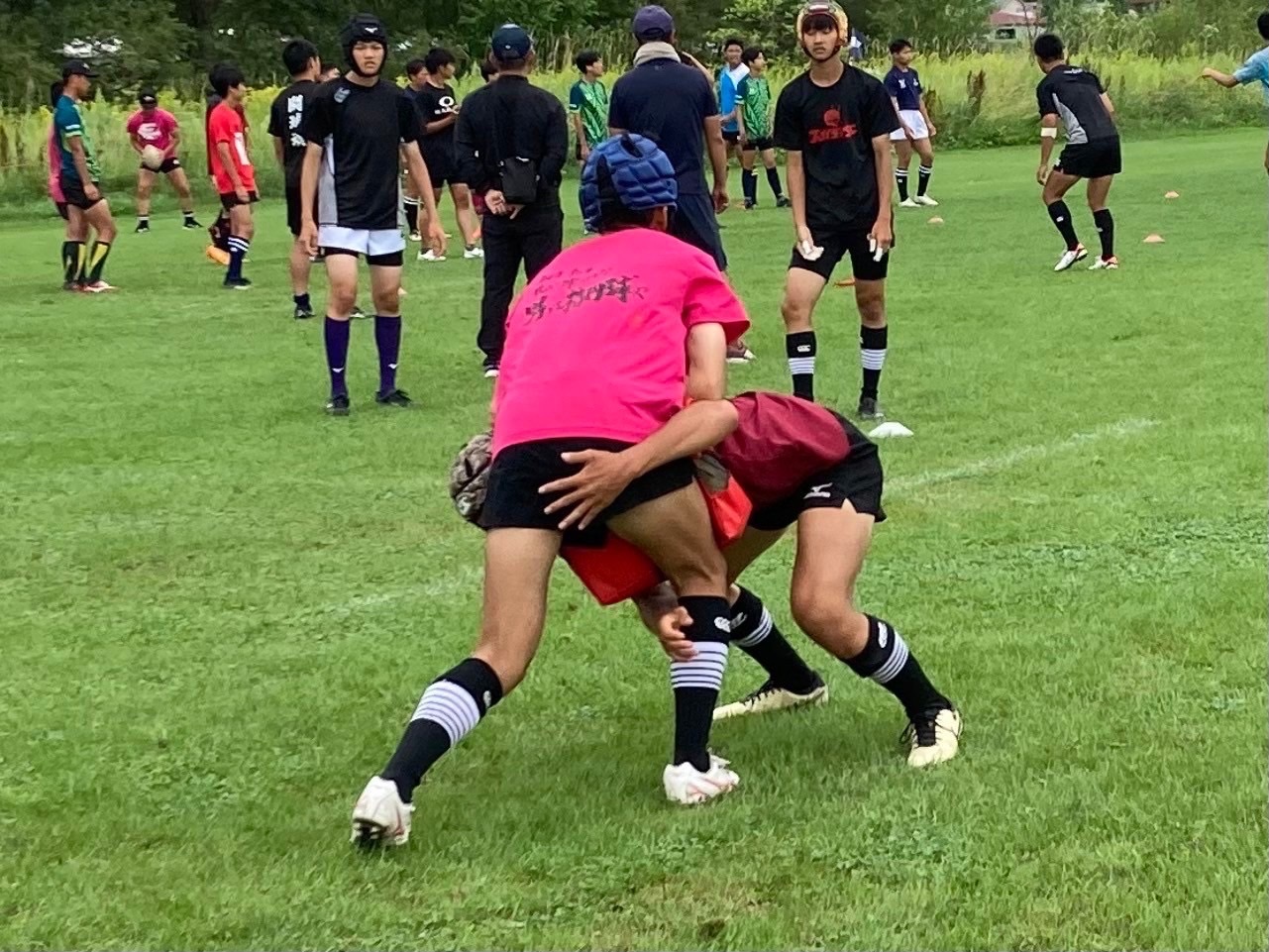 次に1対1を行いました。真っ直ぐに前進することが出来ておらず、足が外れてしまい、強いタックルが出来ていない様子が見られました。