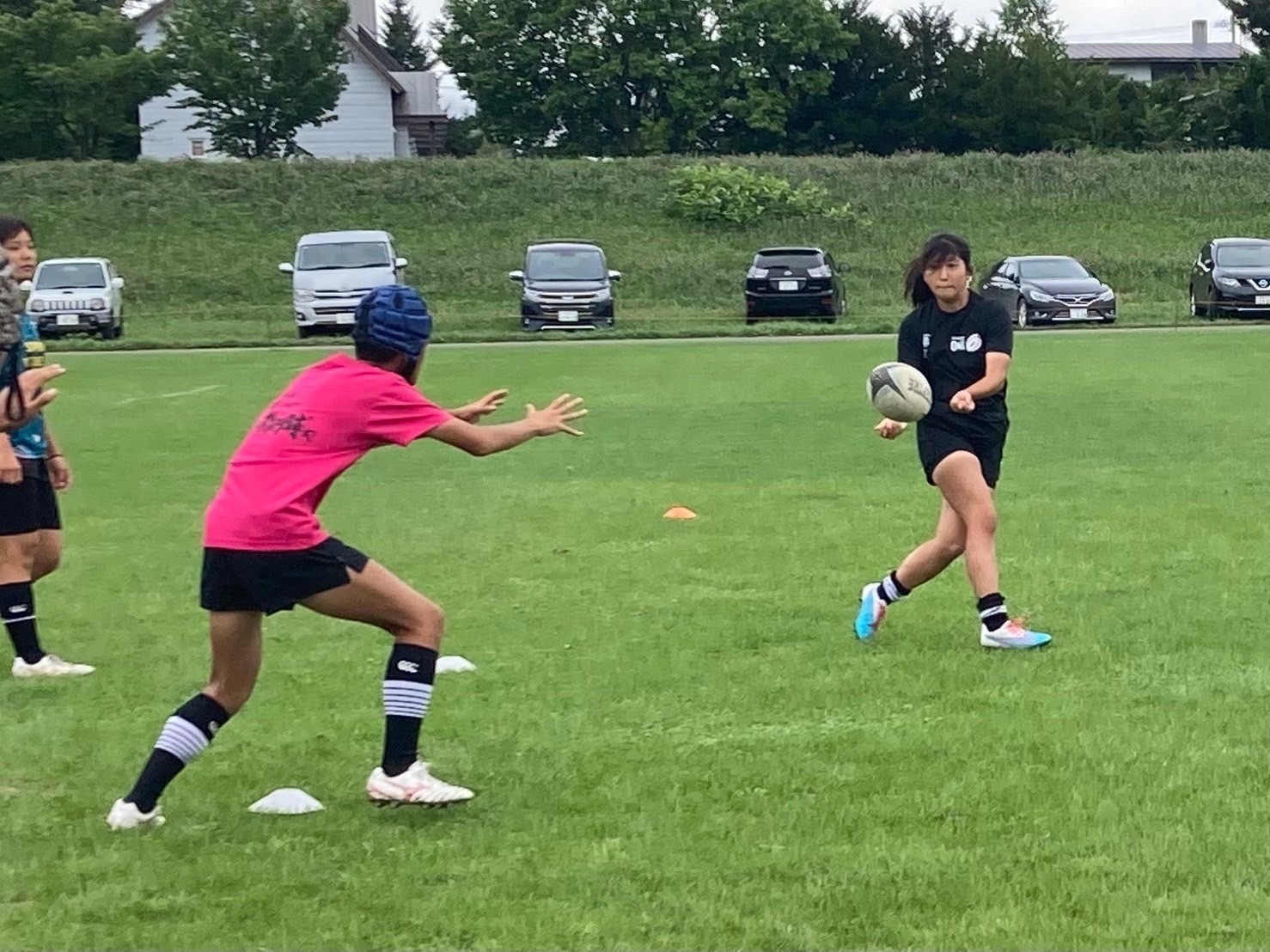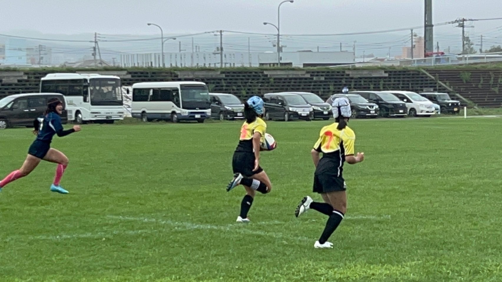 女子選手の試合では7分ハーフのセブンズが行われました。黄色ユニフォームに石岡、森井、練習生の北川が出場しました。1試合目では、石岡と森井の2人が積極的にプレーに参加し、トライを決める事が出来ました。石岡はハーフからのパスでラックサイドをステップを使ってDFを抜ききりトライをしました。状況に応じてプレーを変化させ、得点に絡んでいきましょう。森井は相手のパスミスによるルーズボールに素早く反応し、独走トライをしました。普段練習で行っているルーズボール処理練習を試合で活用出来ているので継続していきましょう。厚別の女子選手がチームに貢献する事が出来ていたので2試合目にもチームの得点に携わっていきましょう。