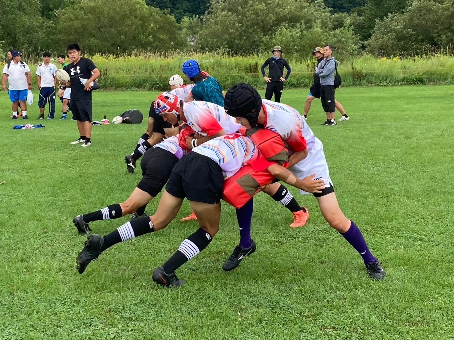 開始2分、政氏が敵陣10mまで前進しましたが止められました。敵陣10mからハーフラインまで前進されましたがナイスタックルが入り抑えました。ノータイムの時間帯でハーフラインから北嶺9番敵陣22mまで前進しパスを繋ぎトライ!先制トライを上げました。