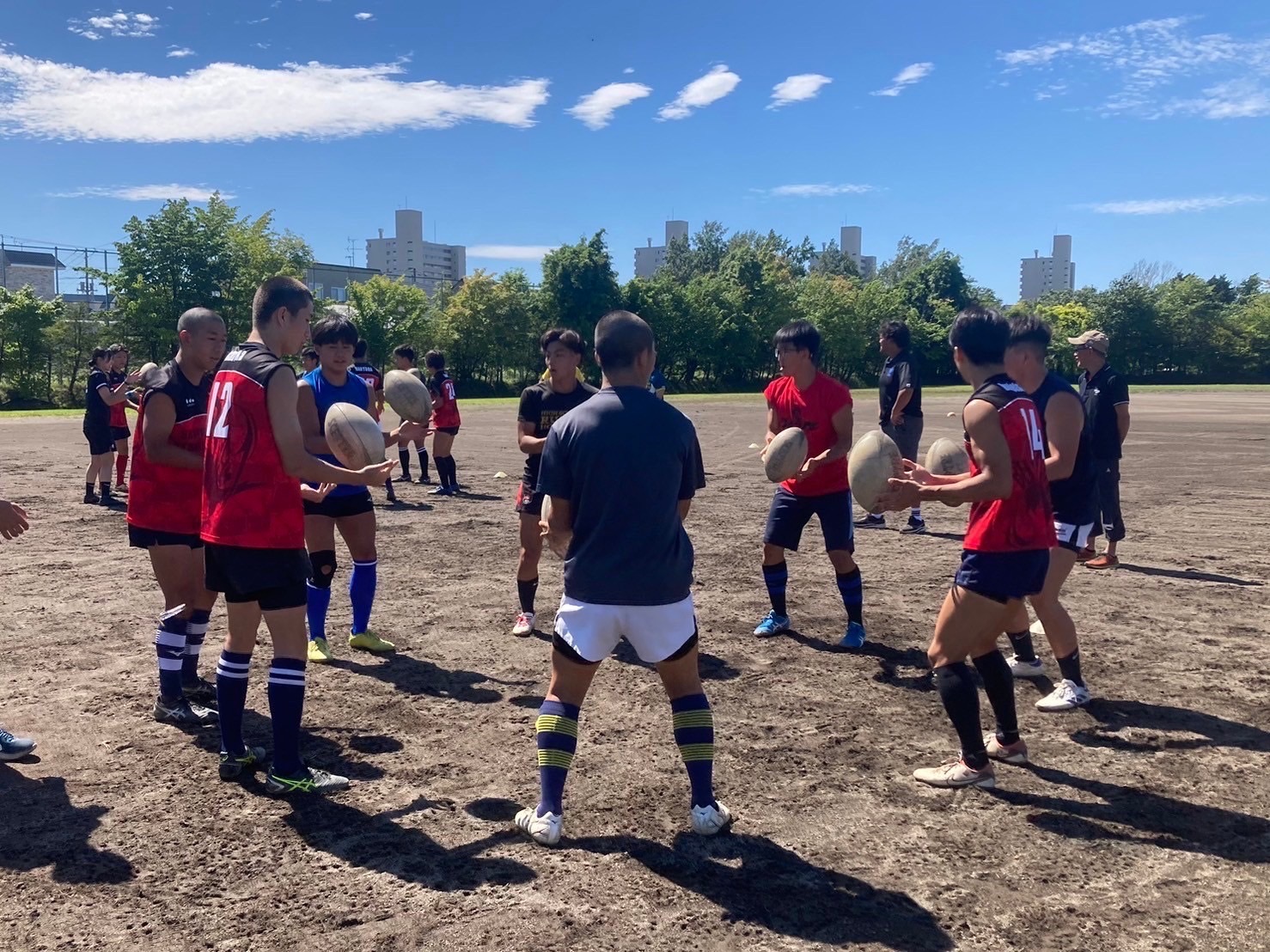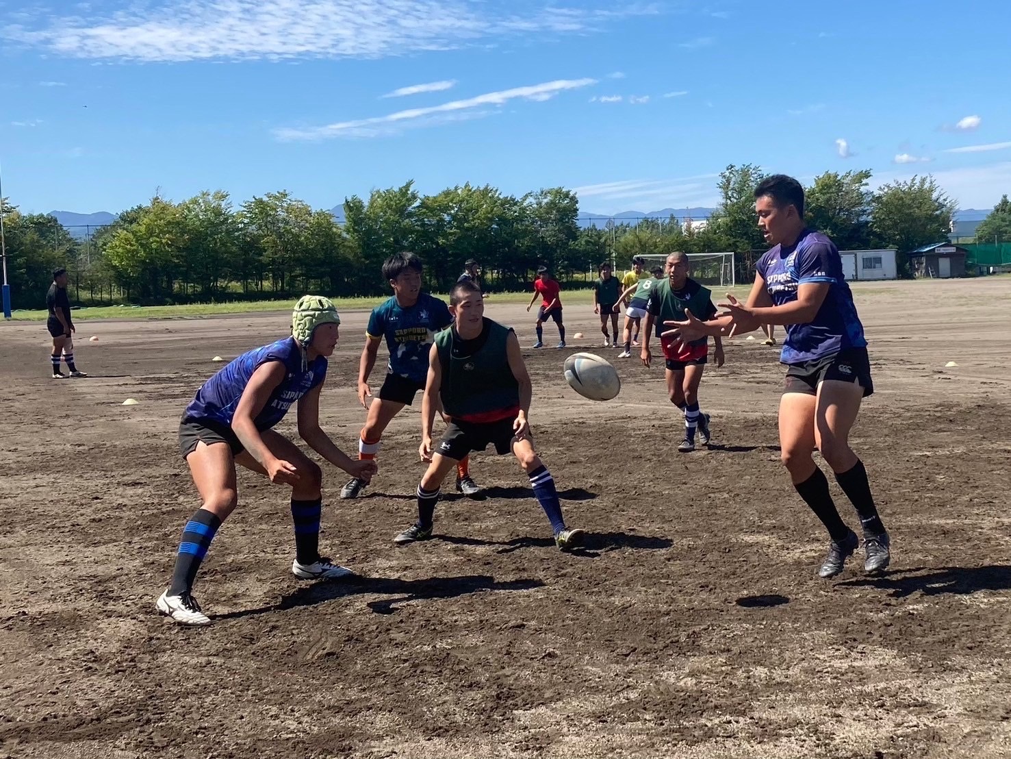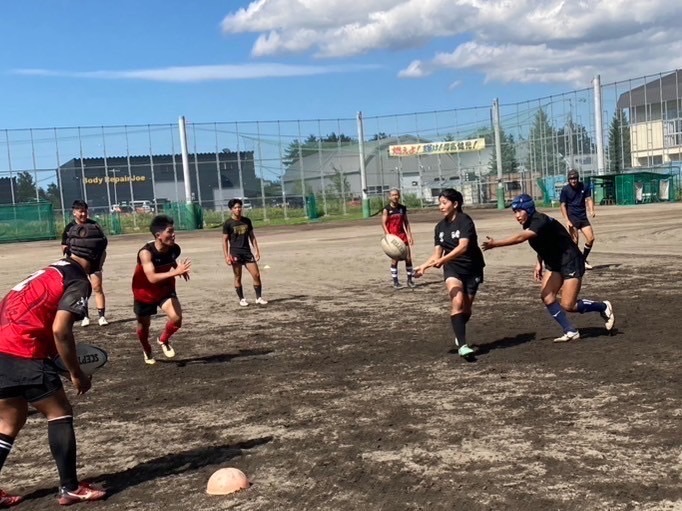 始めに、BKとFWに別れてハンドリング練習を行いました。何度も繰り返し練習することでコミュニケーションをとること、視野を広げることの大切さが重要視されました。