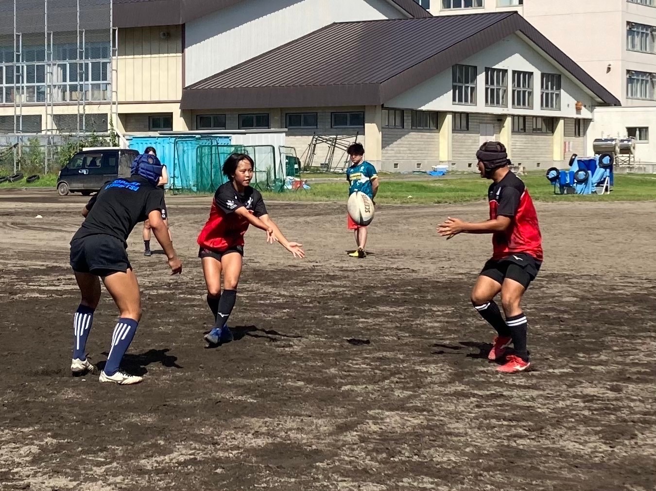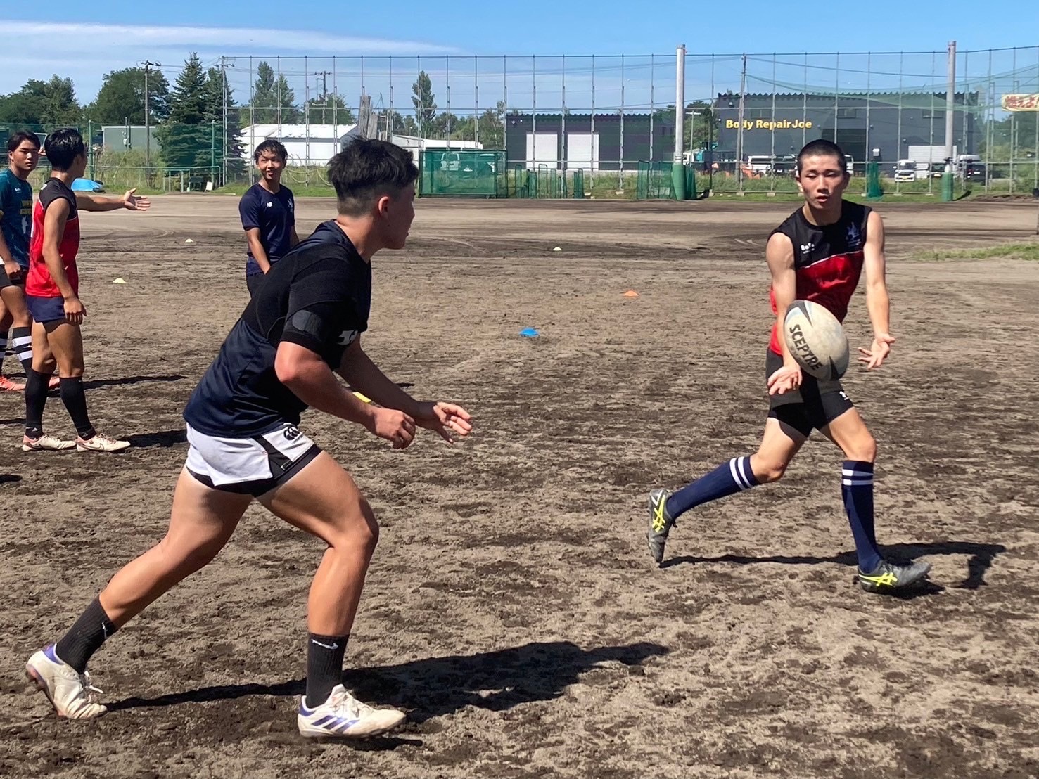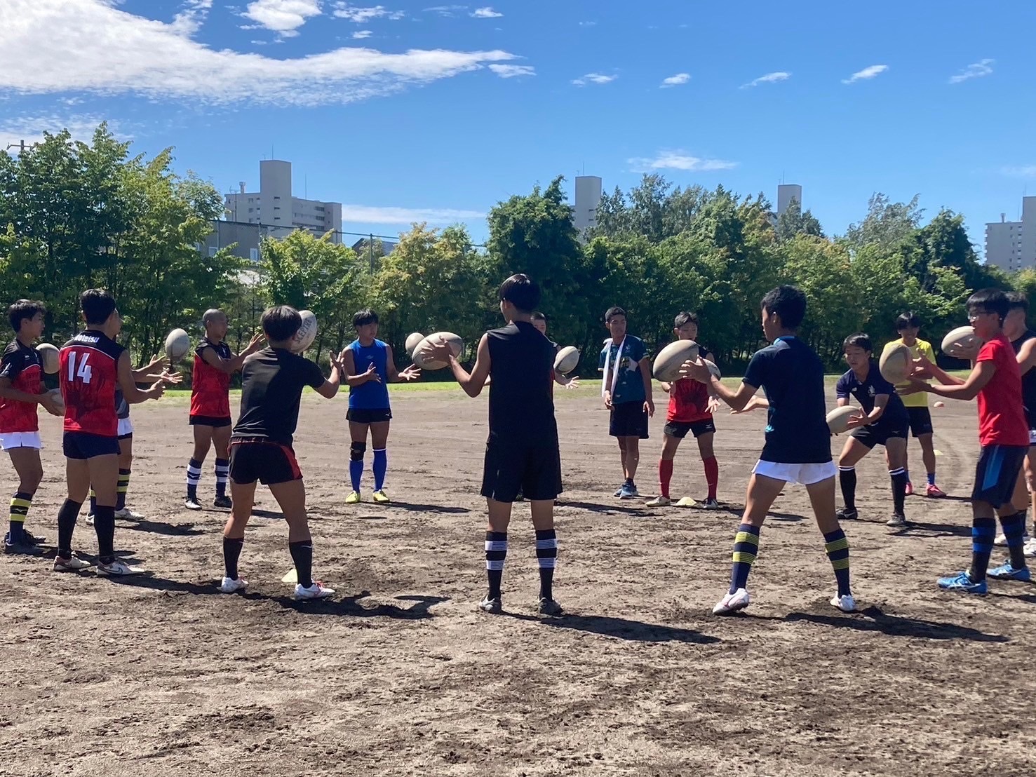 始めに、BKとFWに別れてハンドリング練習を行いました。何度も繰り返し練習することでコミュニケーションをとること、視野を広げることの大切さが重要視されました。