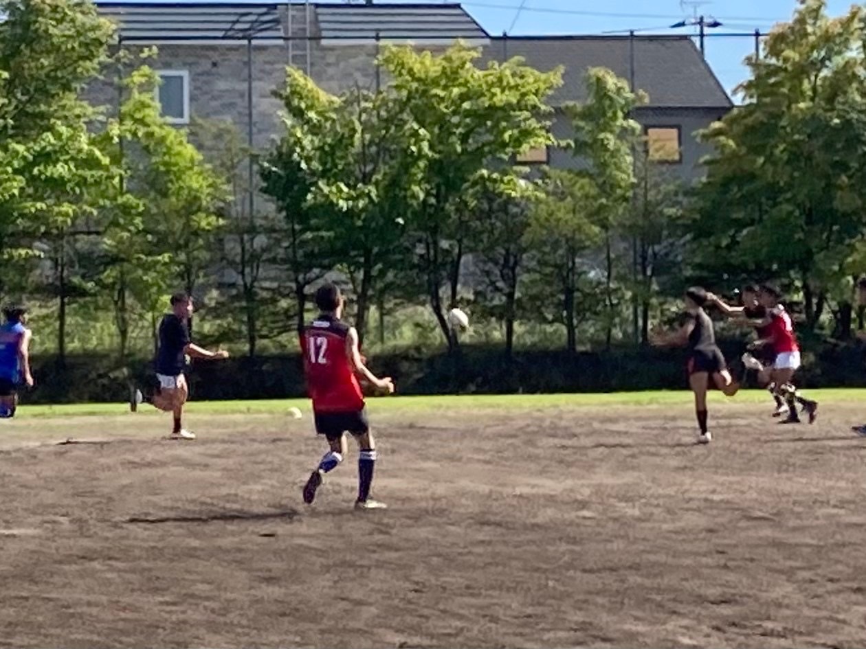次にAチームとBチームに分かれてラグビーボールを利用したタッチダウンゲームを行いました。コミュニケーションエラーによるパスミスが多く見られました。名前を呼んで指摘するなど工夫しながらプレーをしミスをなくしましょう。パスをする時、次にパスが来るところを想定し動きながらパスを繋ぐことでスムーズにパスが通るのでそこの点を意識して行いましょう。