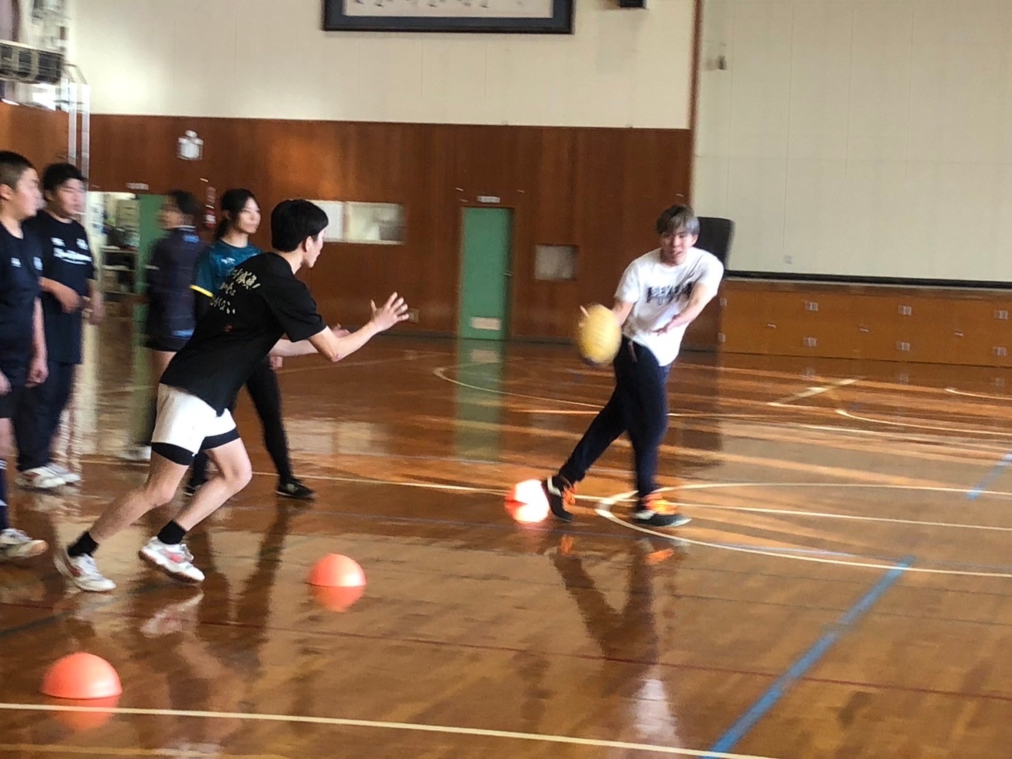 次にグループに分かれてトークを行いました。コールをして、パスをしやすいようにする事や3枚目が溜めを作り、我慢してタイミングを合わせるなどと話し合いました。