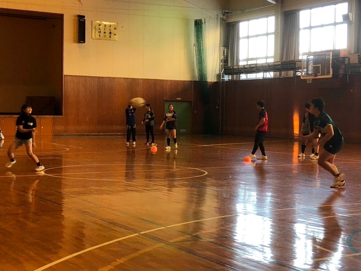 一度グループに分かれてトーク挟みました。トークでは強いパスを放る事や隣同士の距離感を調節したりして思いやりを持つといった事が挙げられました。全体で共有した際にはハンズキャッチの形を工夫させる、親指をロックするなど手の動きを中心に話し合いがありました。