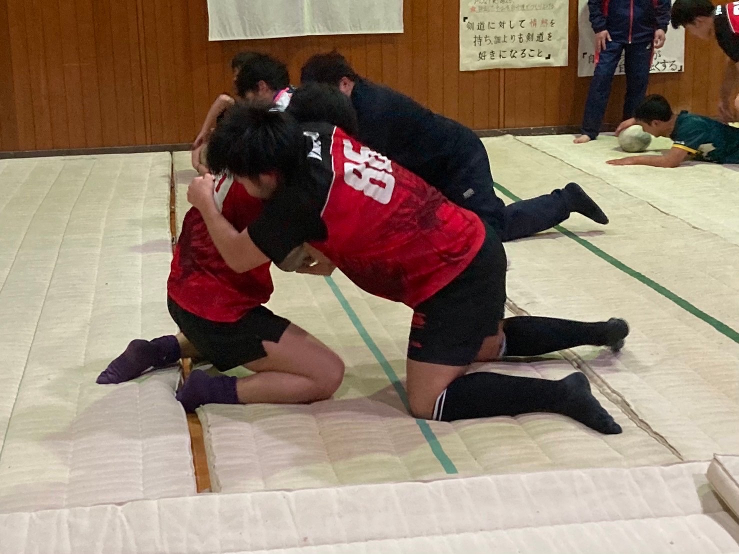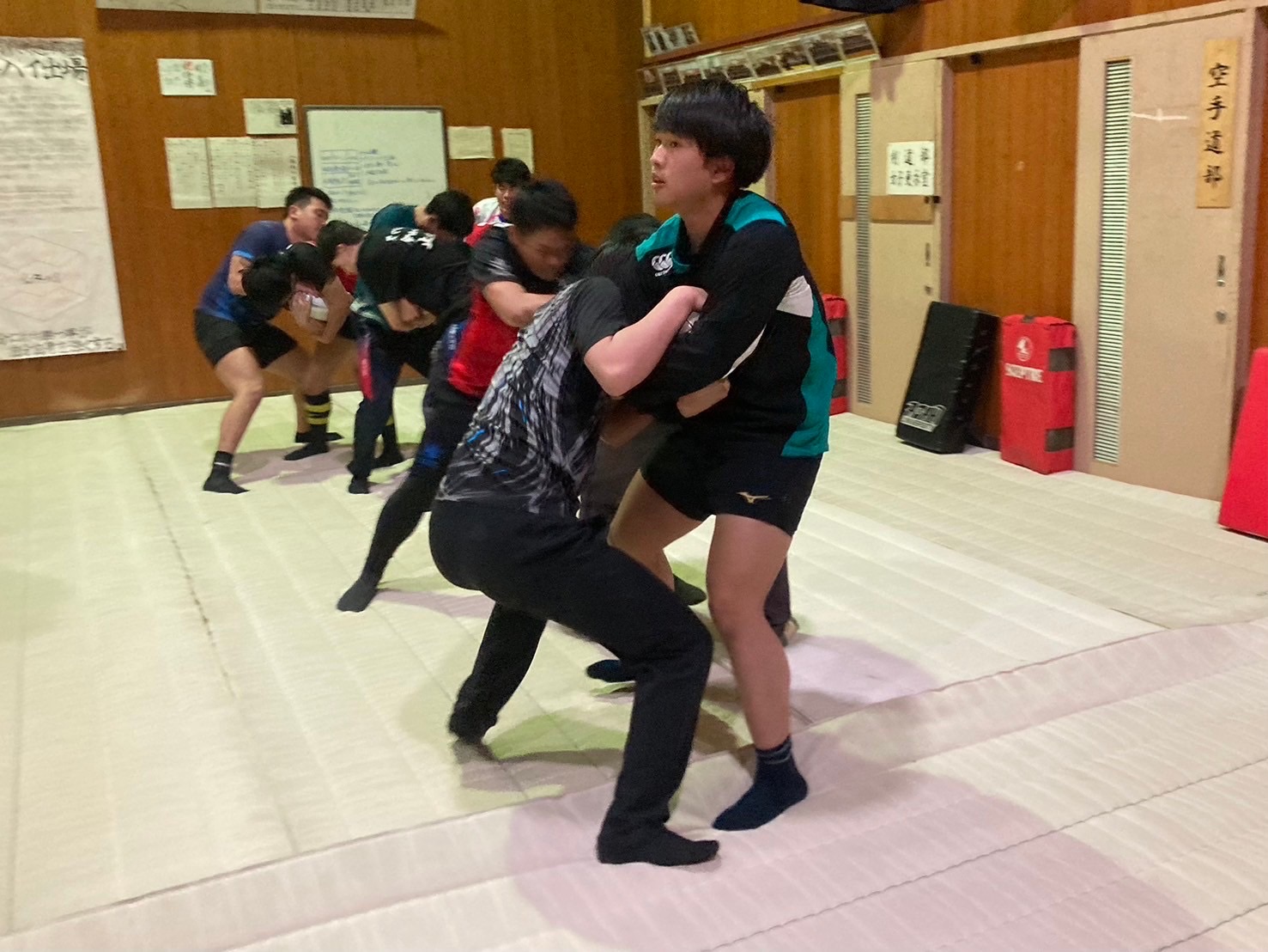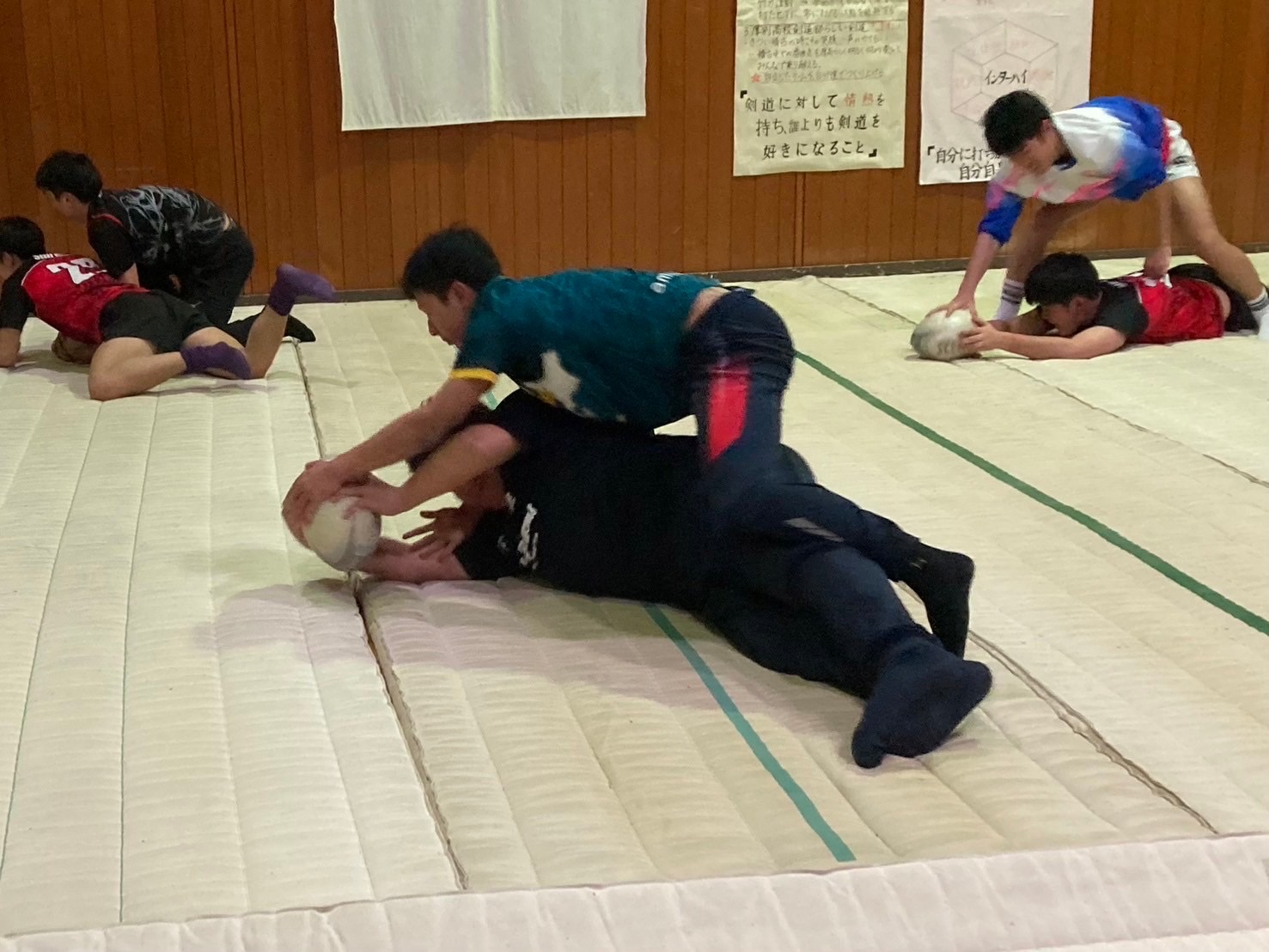 接点からのロングリリースの練習を行いました。堀先生からは、ジャッカルのポイントはフットポジションに足の位置を近づける事だとお話をして頂きました。足の位置に意識を向けて取り組んでいきましょう。ボールキャリアは肩を切るようにして相手のホールドを早く剥がし、ロングリリース出来るように練習していきましょう。