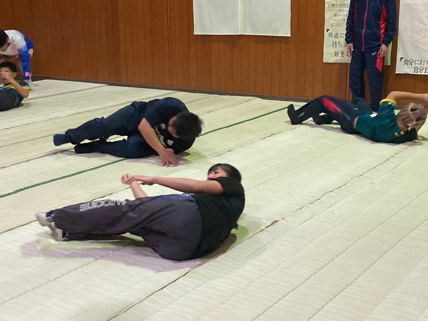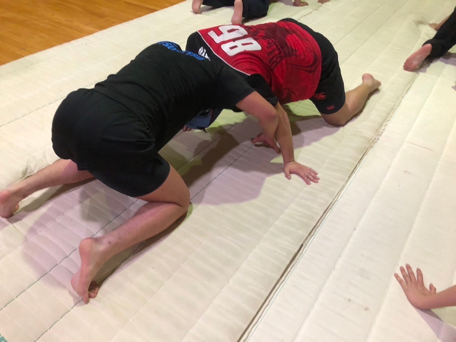 手押し相撲では倒れた時の受け身の練習を兼ねました。楽しみながら良く考えて行っていきましょう。次にタオルを使用してバランス崩しをしました。片足でバランスを上手く取りながら、体幹と軸足にも意識を向けて行っていきましょう。