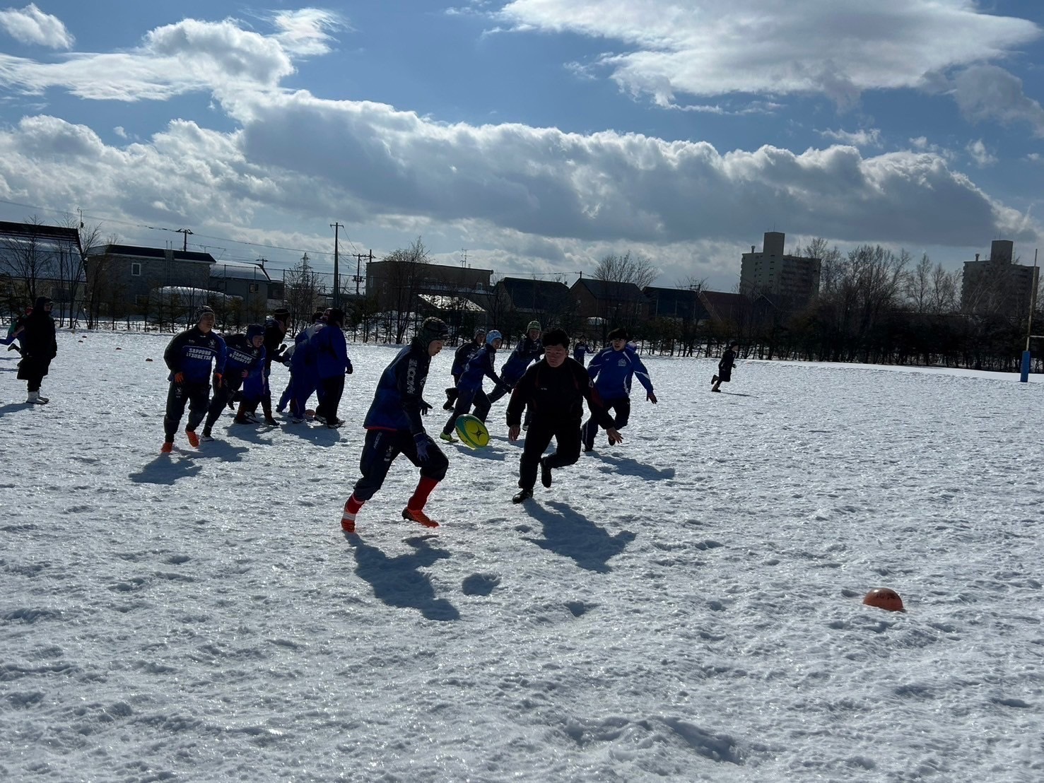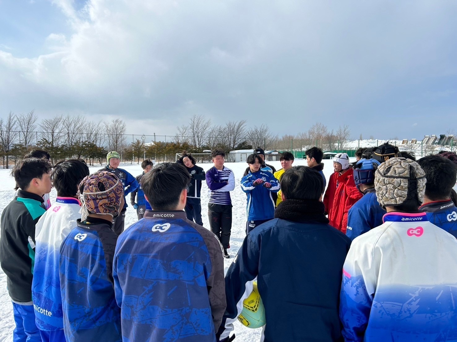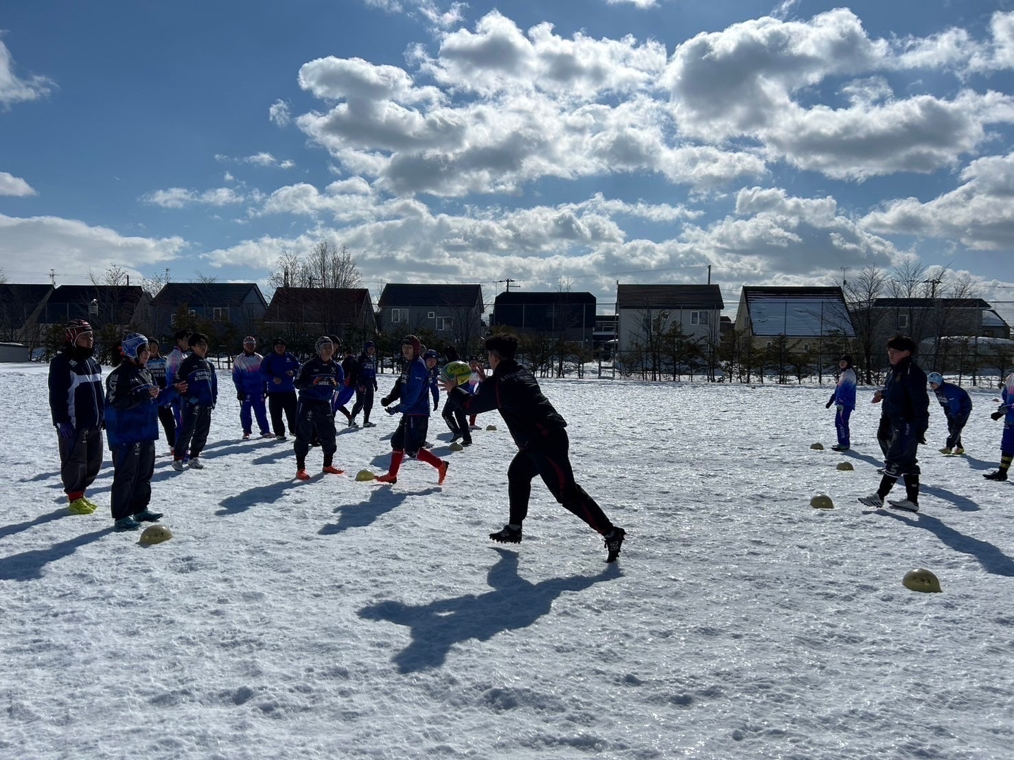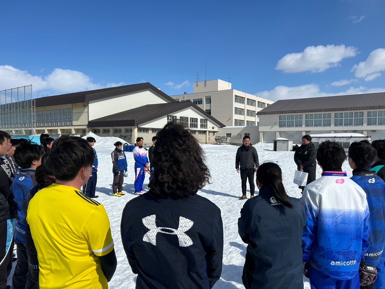 朝日大学ラグビー部の監督をされている吉川さんがグラウンドに来て下さいました。表原コーチや田中さんが所属した大学で東海リーグのチャンピオンチームです。近年はリーグワンでプレーする選手も輩出しているそうです。吉川さんからから冬の北海道という環境に負けず日々の練習を行っている活動の様子を褒めて下さいました。吉川監督、寒い中にも関わらずグラウンドにお越しいただきありがとうございます。
