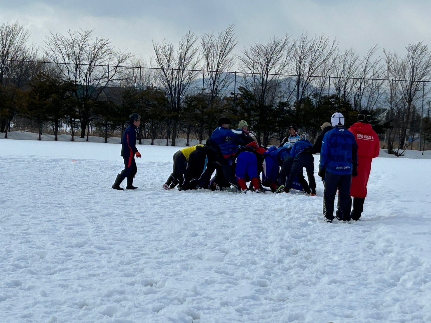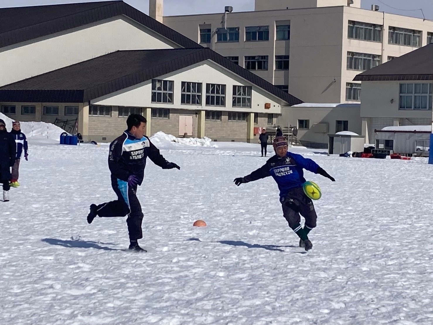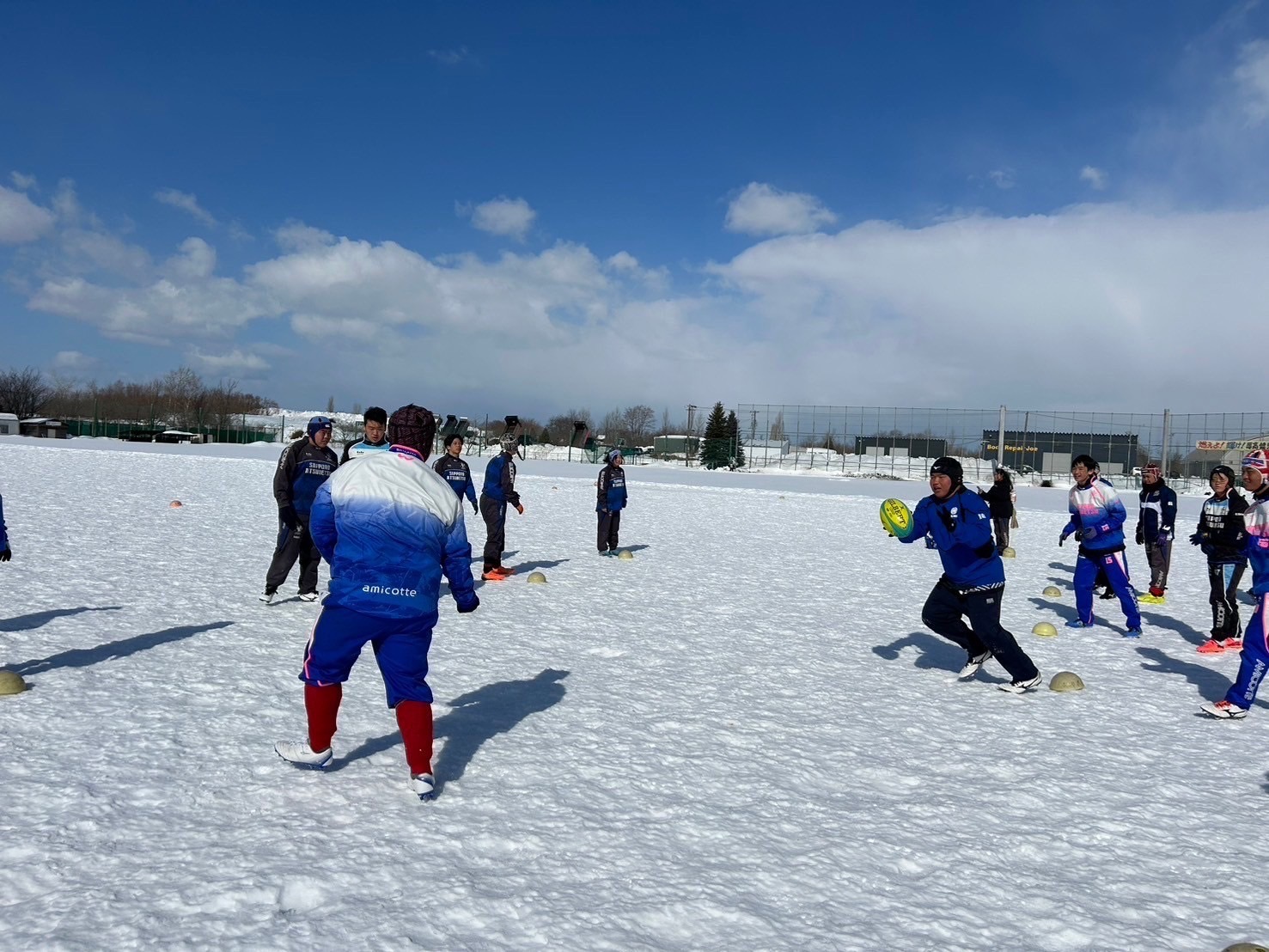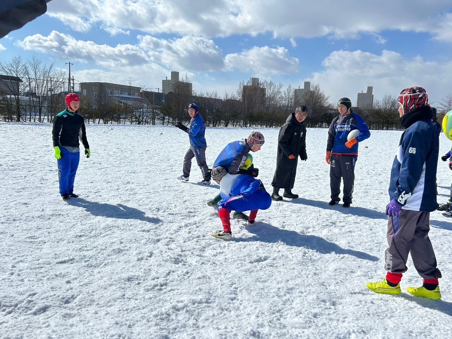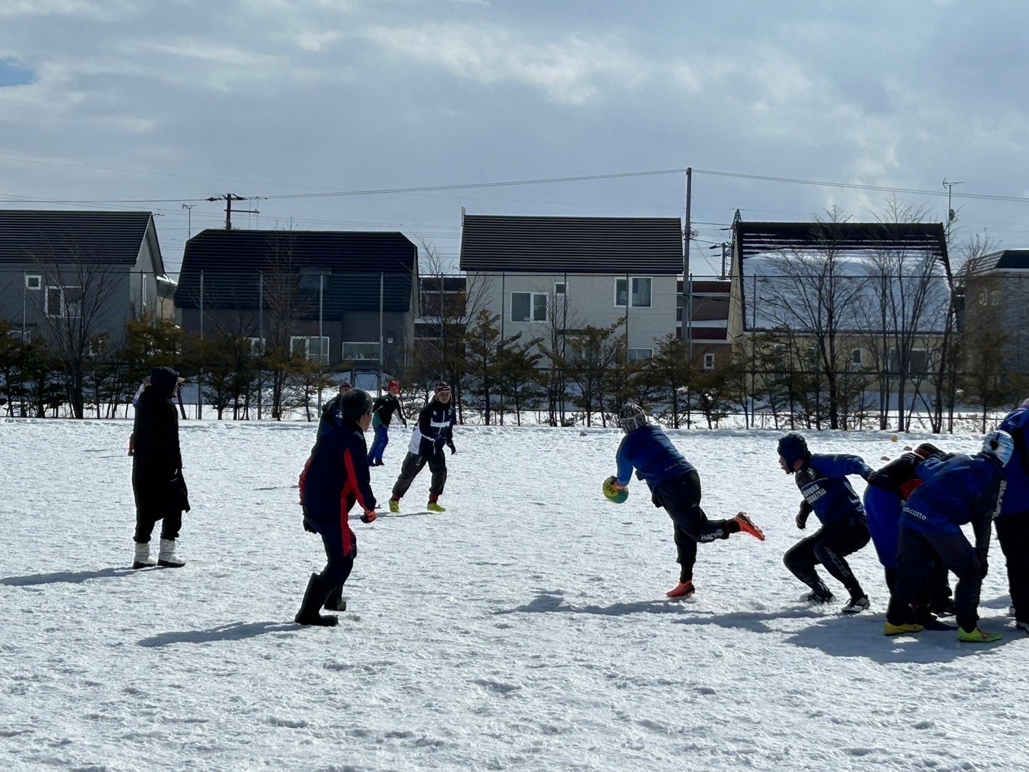 朝日大学ラグビー部の監督をされている吉川さんがグラウンドに来て下さいました。表原コーチや田中さんが所属した大学で東海リーグのチャンピオンチームです。近年はリーグワンでプレーする選手も輩出しているそうです。吉川さんからから冬の北海道という環境に負けず日々の練習を行っている活動の様子を褒めて下さいました。吉川監督、寒い中にも関わらずグラウンドにお越しいただきありがとうございます。