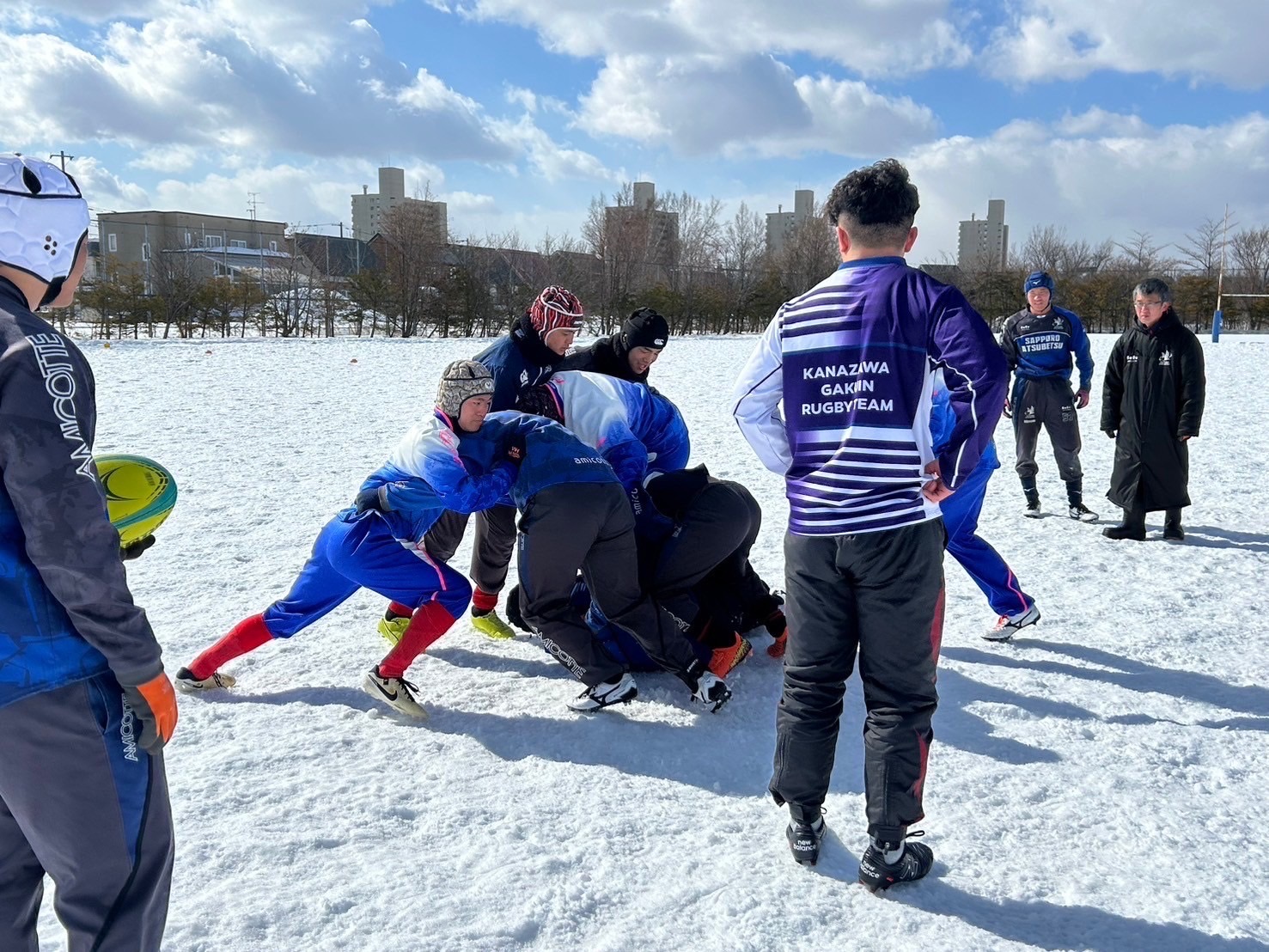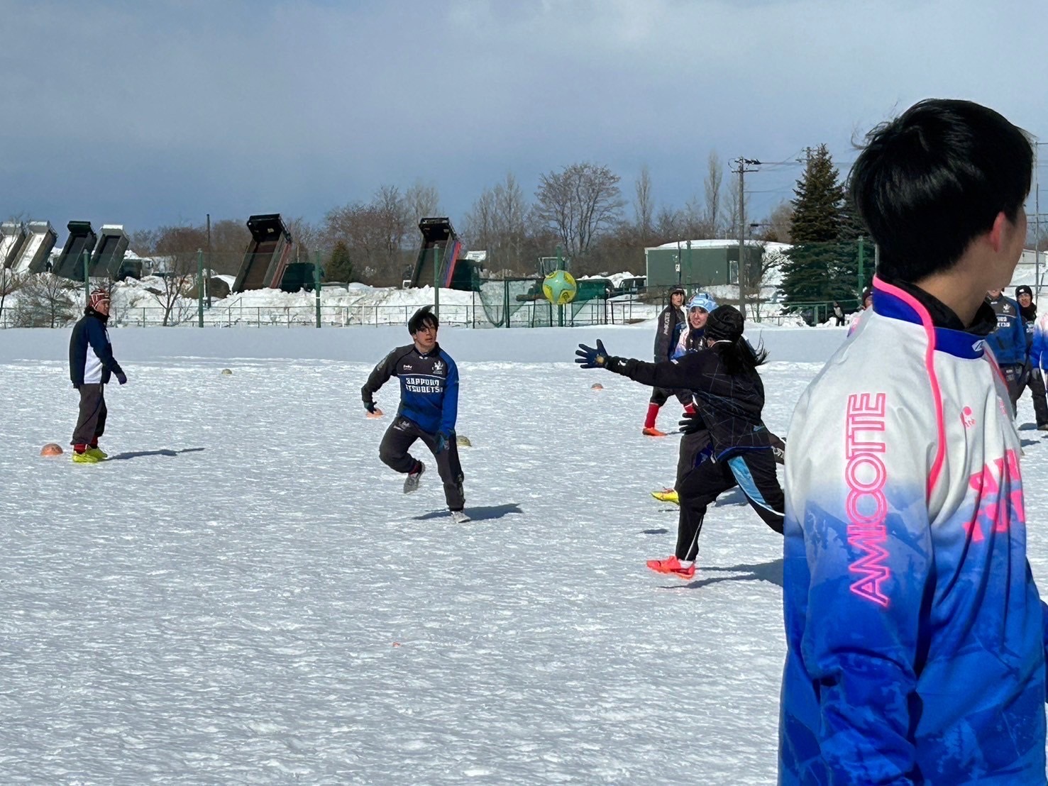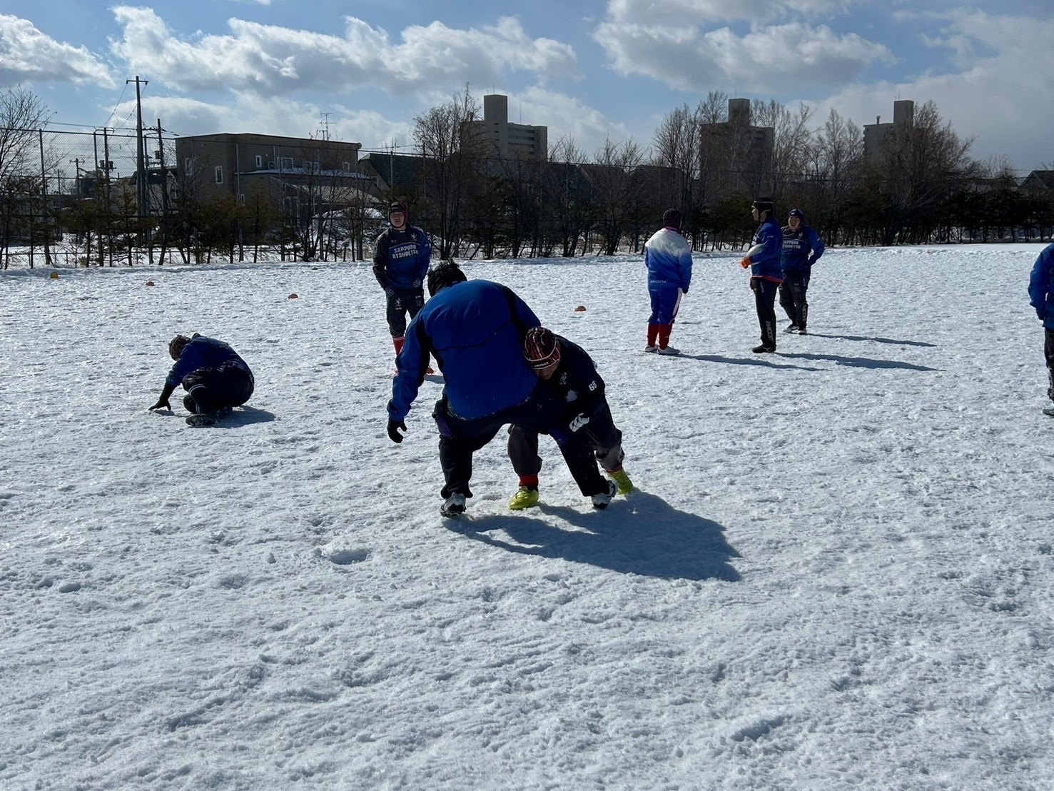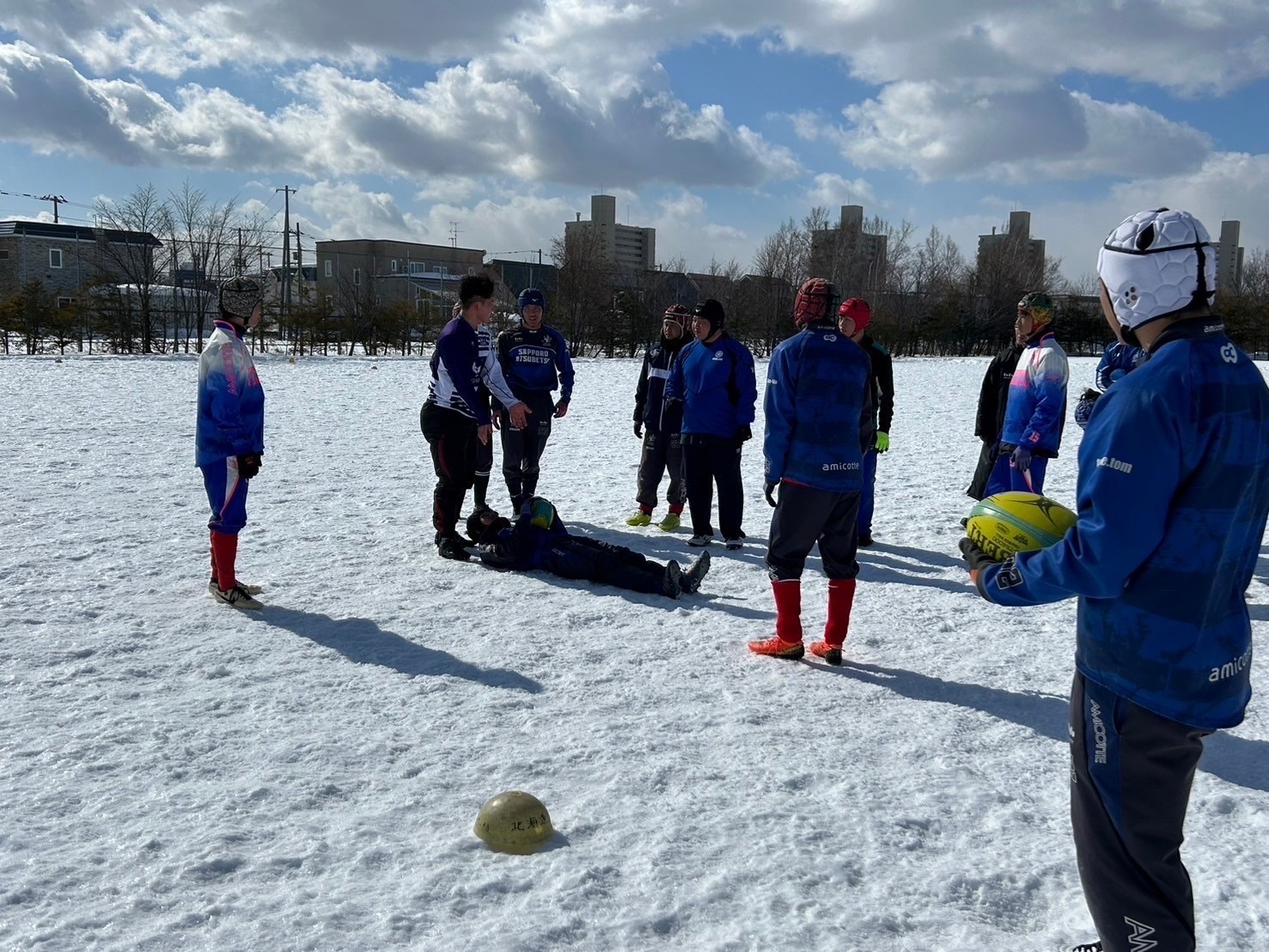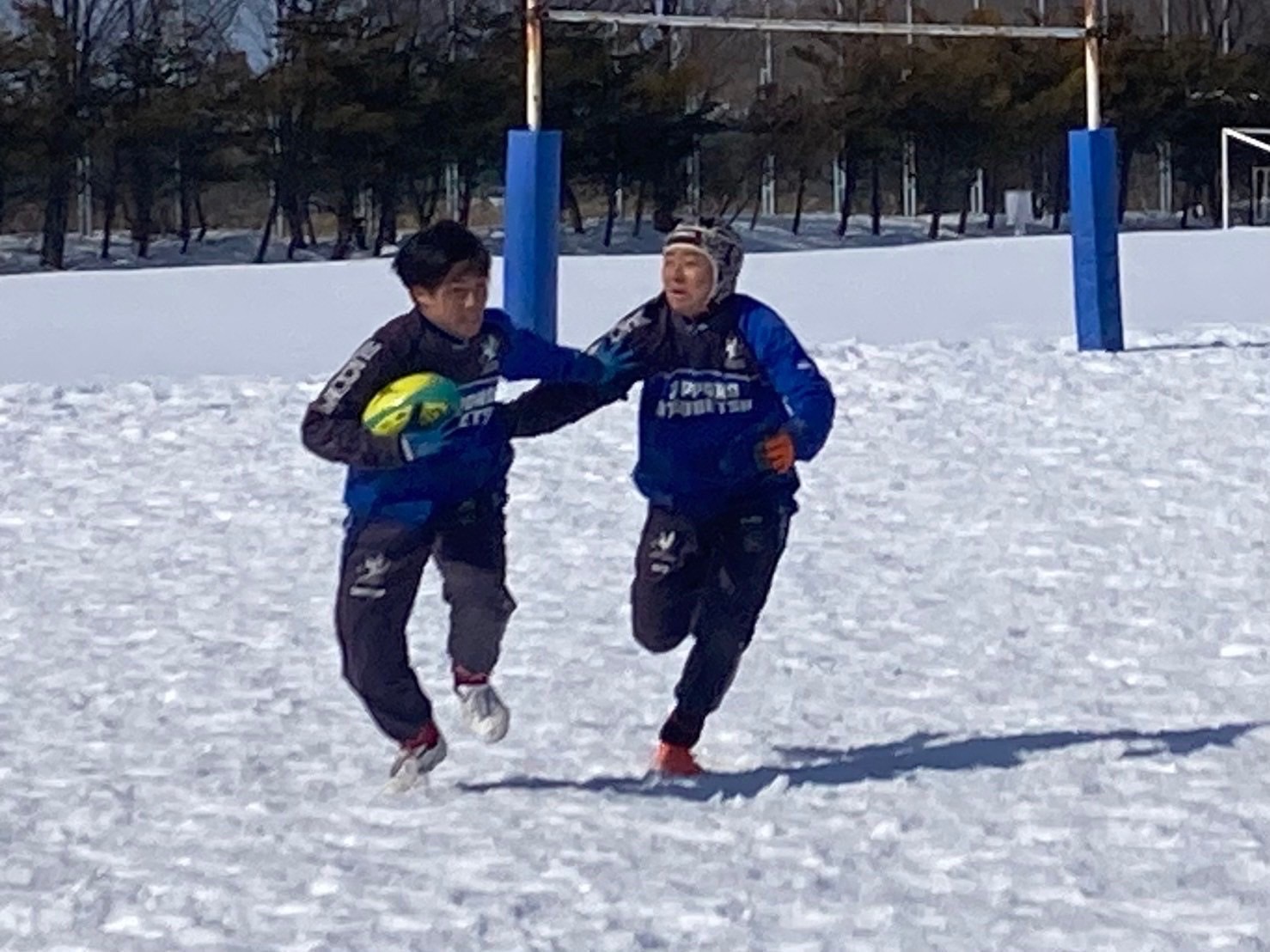 朝日大学ラグビー部の監督をされている吉川さんがグラウンドに来て下さいました。表原コーチや田中さんが所属した大学で東海リーグのチャンピオンチームです。近年はリーグワンでプレーする選手も輩出しているそうです。吉川さんからから冬の北海道という環境に負けず日々の練習を行っている活動の様子を褒めて下さいました。吉川監督、寒い中にも関わらずグラウンドにお越しいただきありがとうございます。