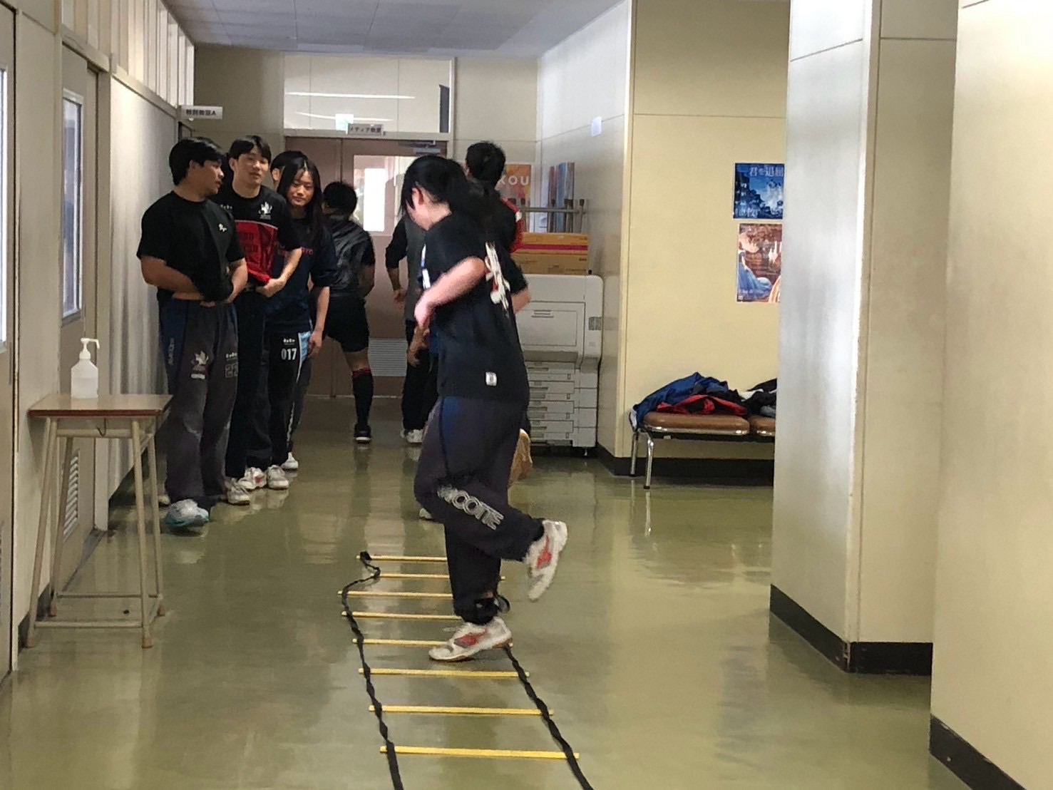 最初にラダーを行いました。集中力を上げて、足を細かく早く動かせるようにしましょう。ラダーを踏んでいる人や引っかかってしまっている人が同じ人なので指摘してアップから質を上げていきましょう。