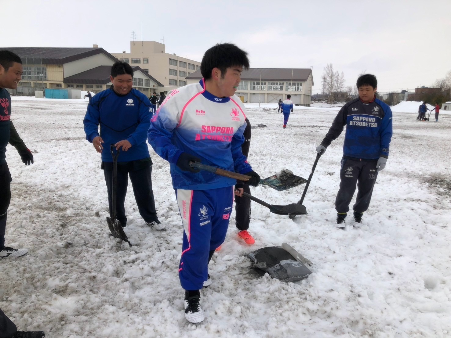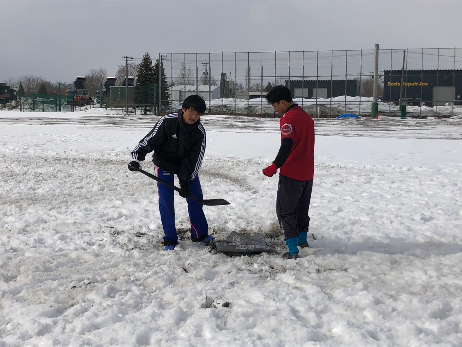 試合後、雪溶けを早める為に融雪剤を撒きました。皆んなで協力していきましょう。
