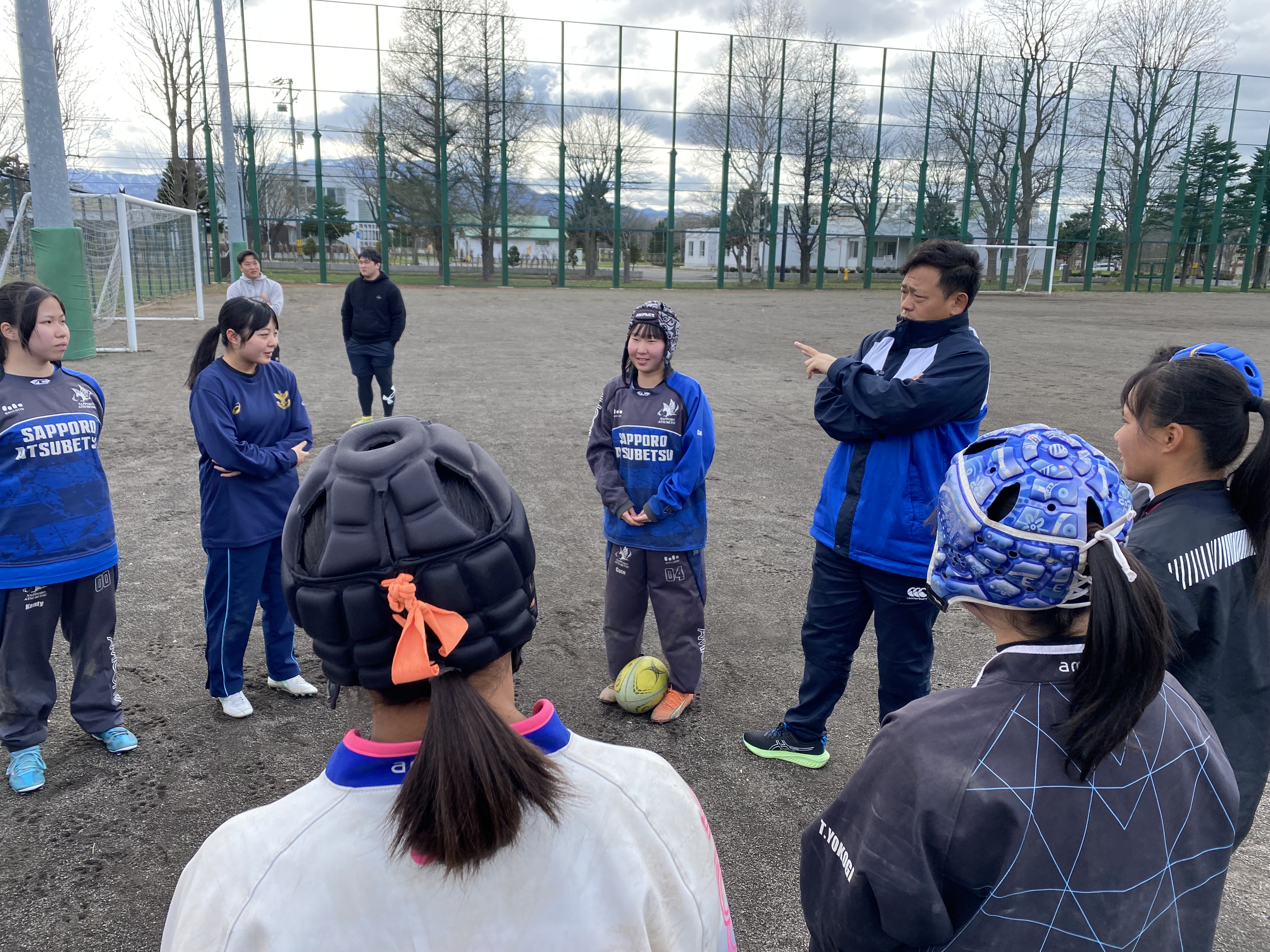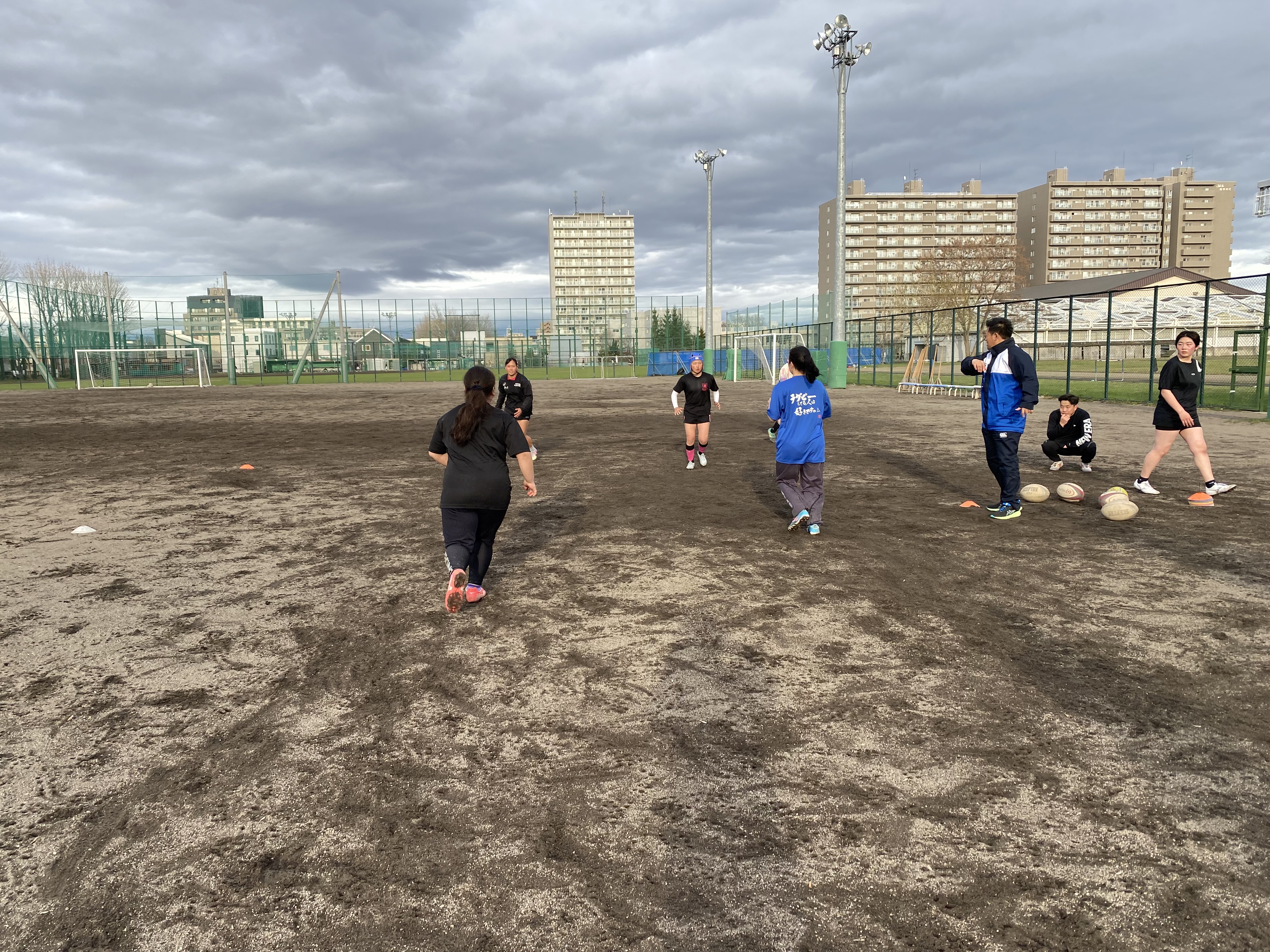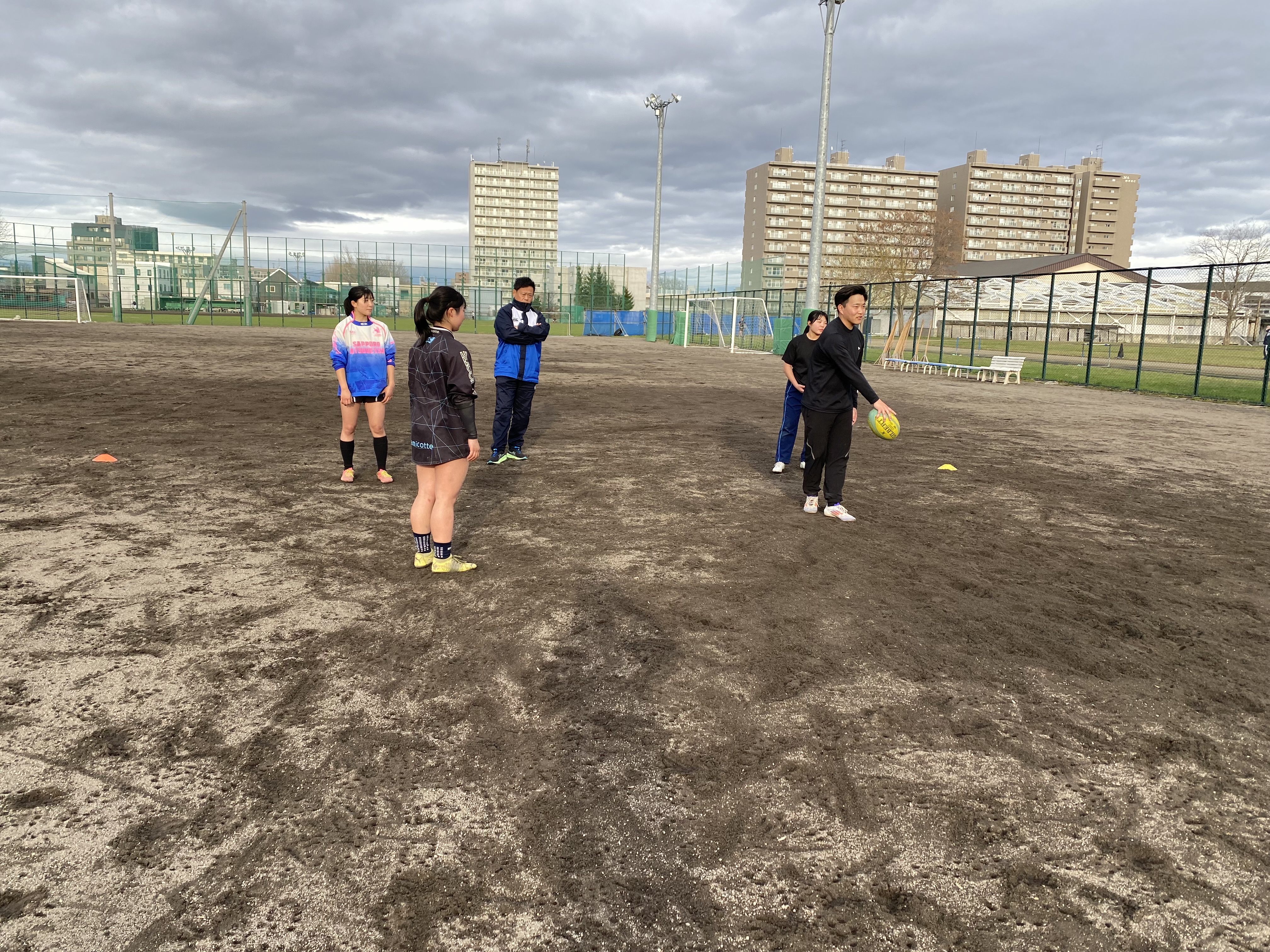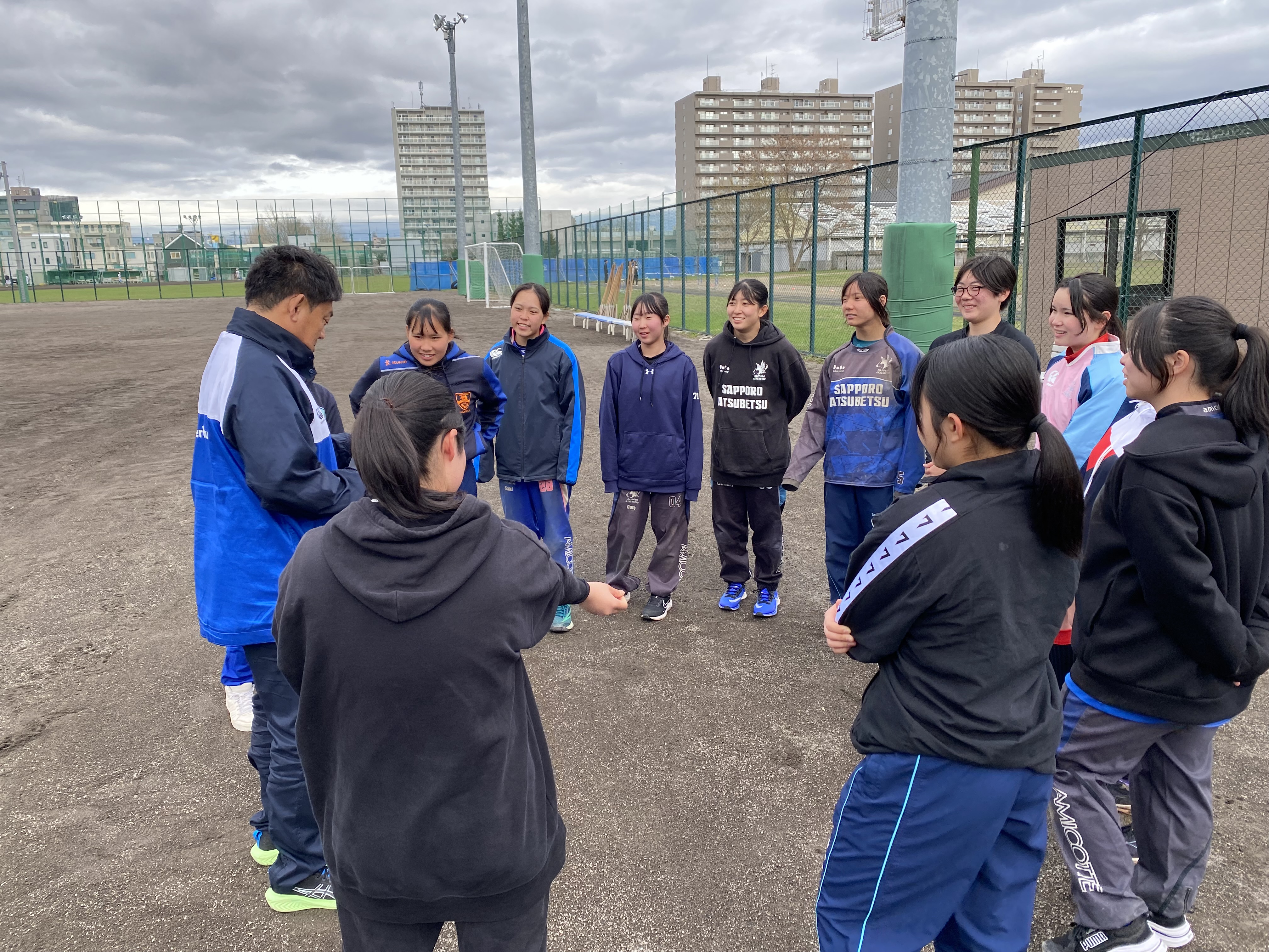今日の午後は第1回 札幌支部高校女子ラグビーフットボール合同練習会が札幌北高校のグラウンドに札幌、江別の高校から12名の女子選手が集まり実施されました(厚別高校からは7名。内1名は新川高校の練習生。)この練習会は、札幌市ラグビーフットボール協会の女子担当理事である前厚別高校ラグビー部監督の堀先生が札幌支部の女子強化を目指し企画してくださいました。