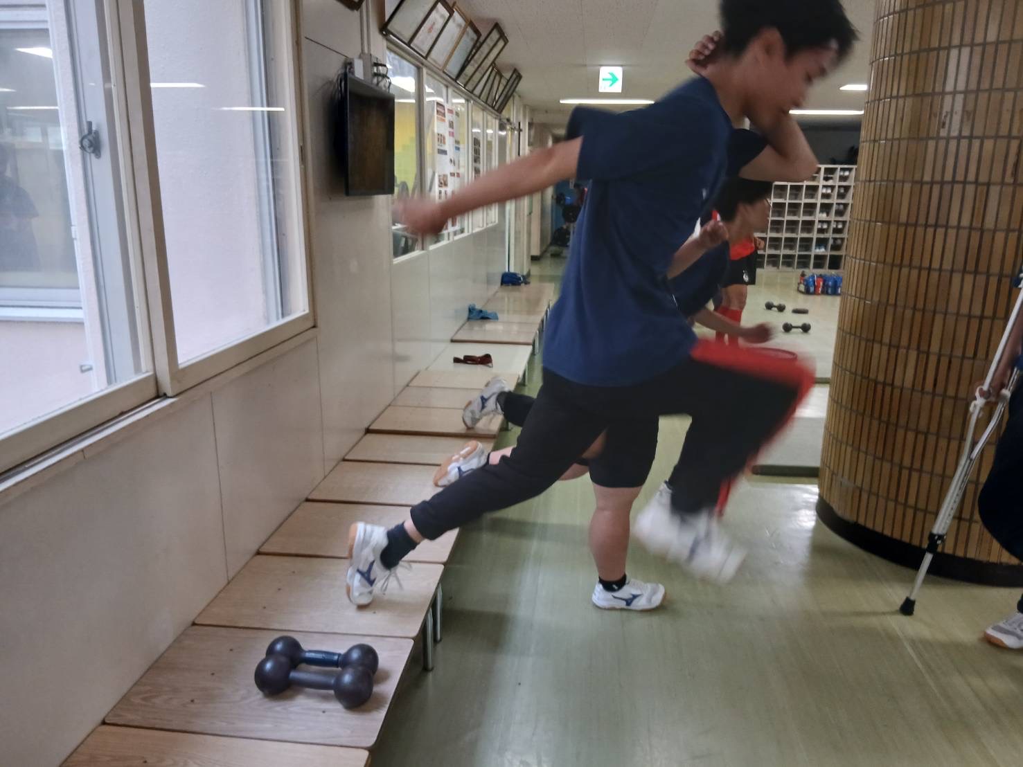 その後、膝裏タッチを行いました。ディップして両手で膝裏を触れるように自分の姿勢に気をつけながら練習に取り組みましょう。