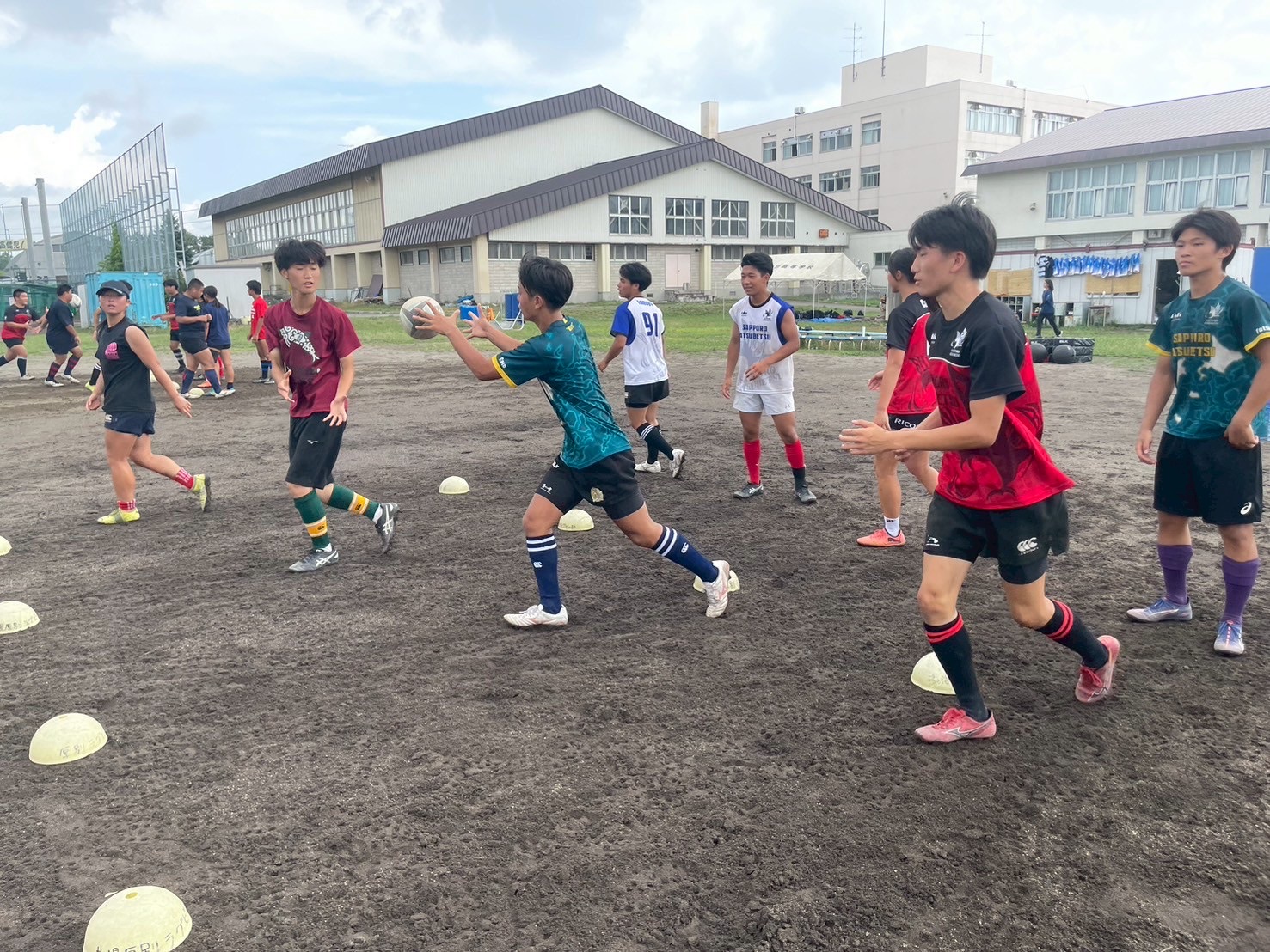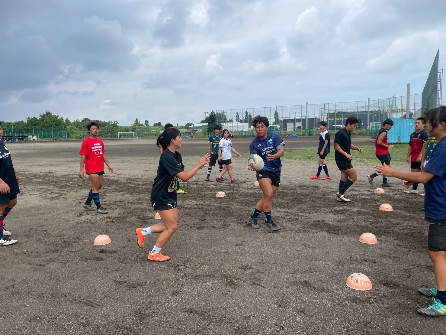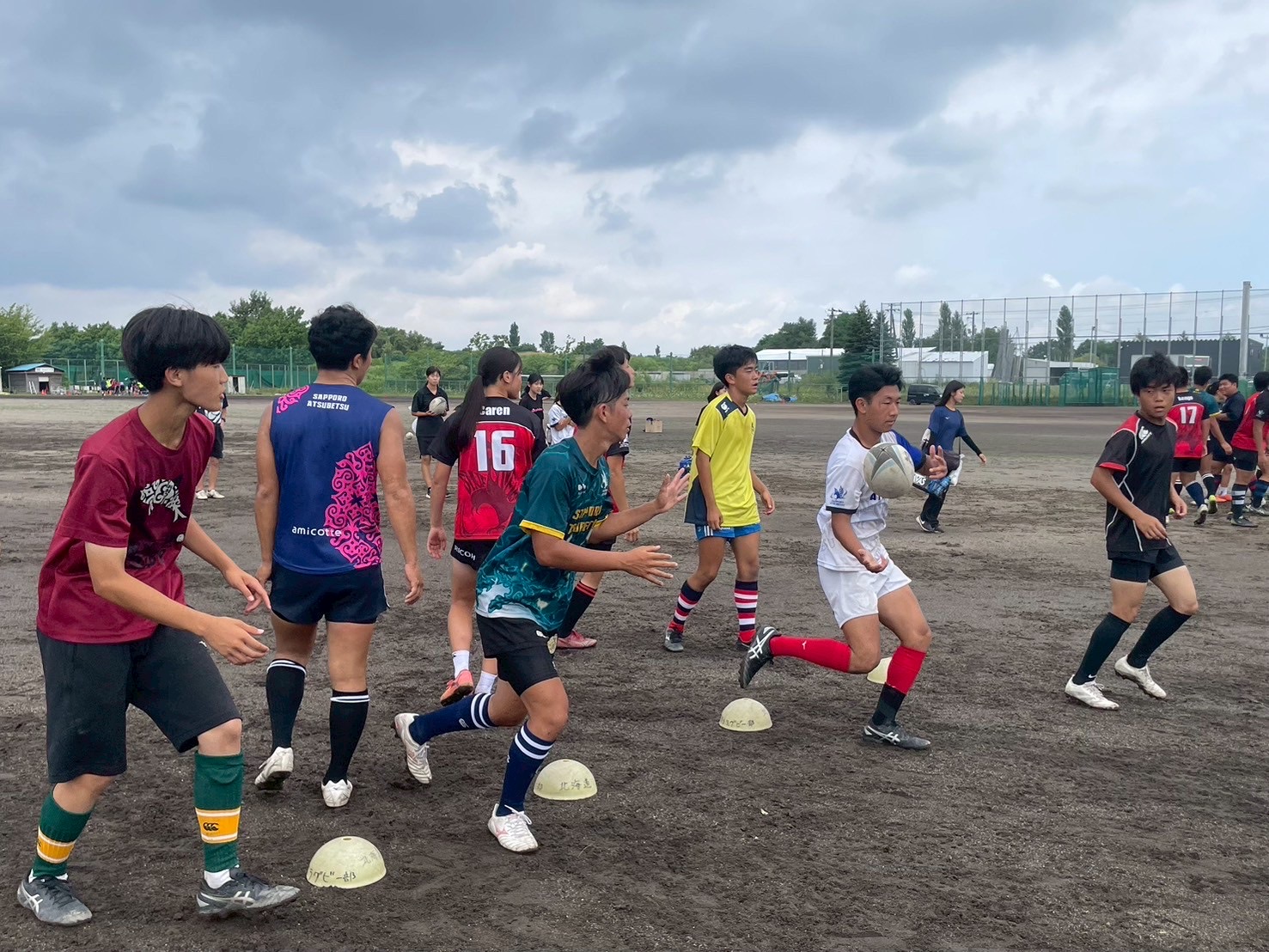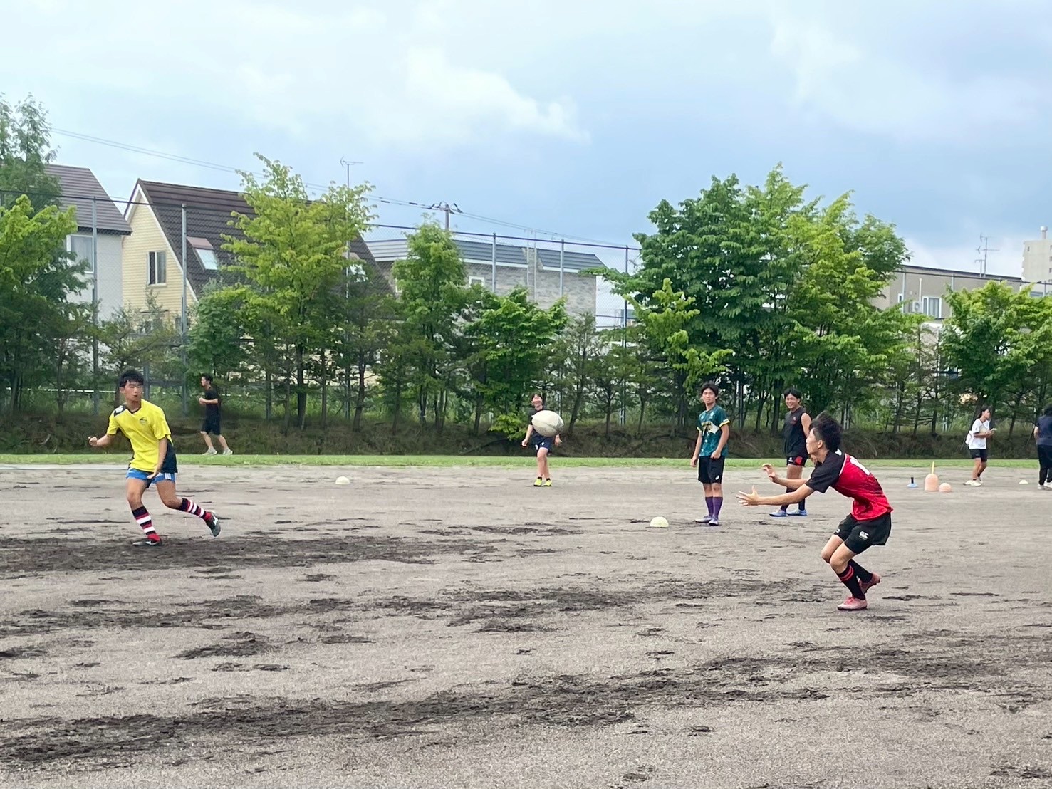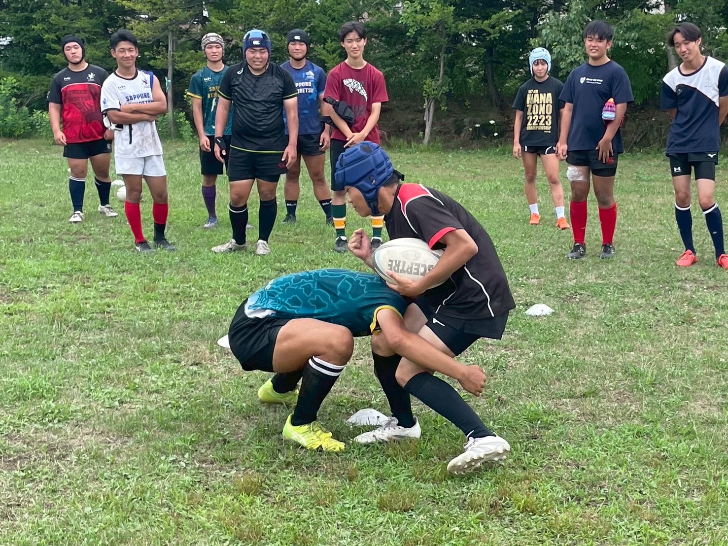 次に、キャリーの練習を行いました。低く、鋭く当たりにいくことを心がけて練習に取り組みましょう。山口先生からは、テンポの速さや、ヒットをして相手を後ろに下げることなどを意識するようにとアドバイスをいただきました。また、常翔と厚別は、オーバーの動きやグラウンドワークの速さが違うということを改めて確認しました。その後、人数を増やし再びキャリーの練習を行いました。人数が増えてもやることは同じなので、ポイントを押さえつつ練習に励みましょう。
