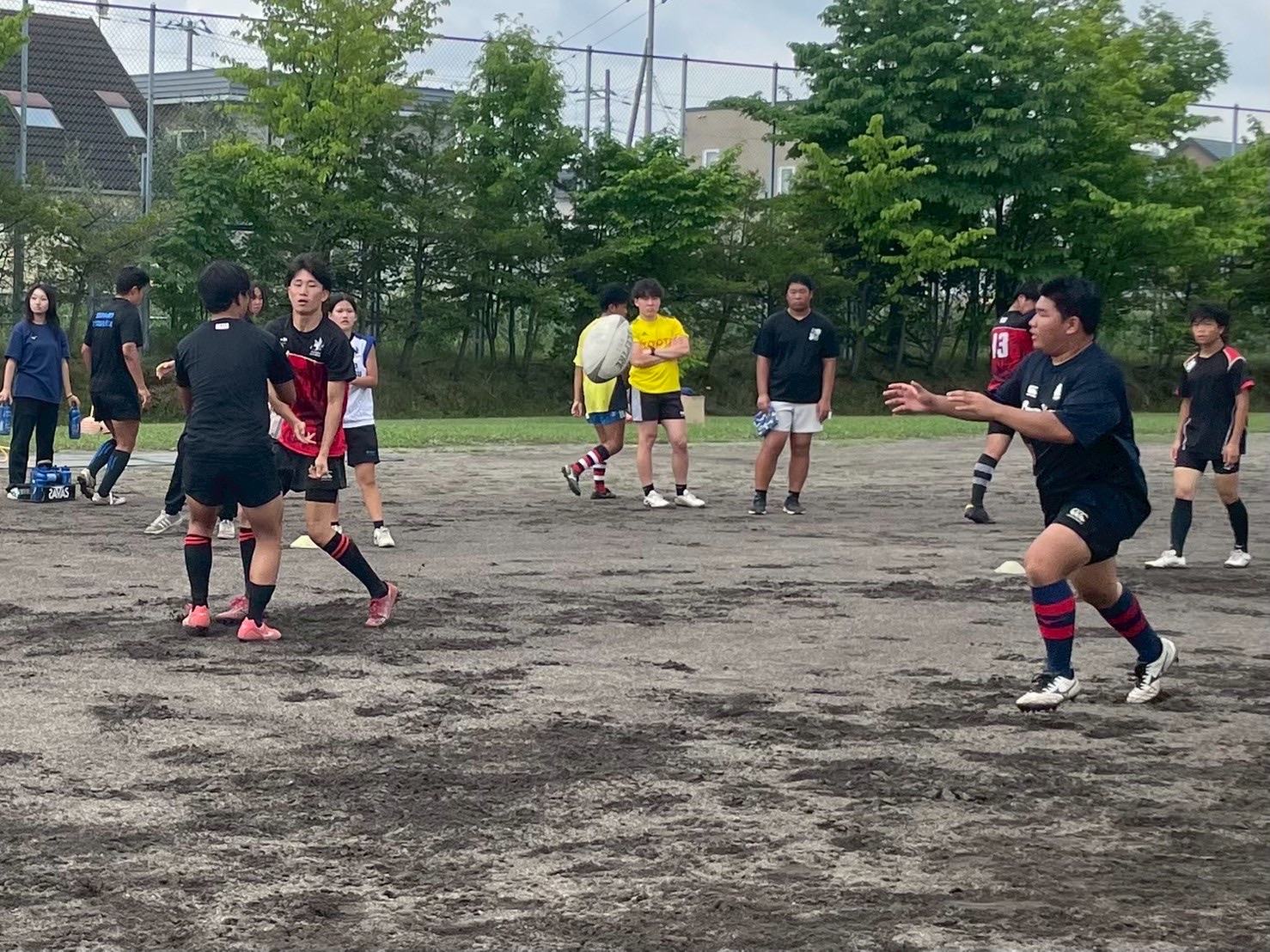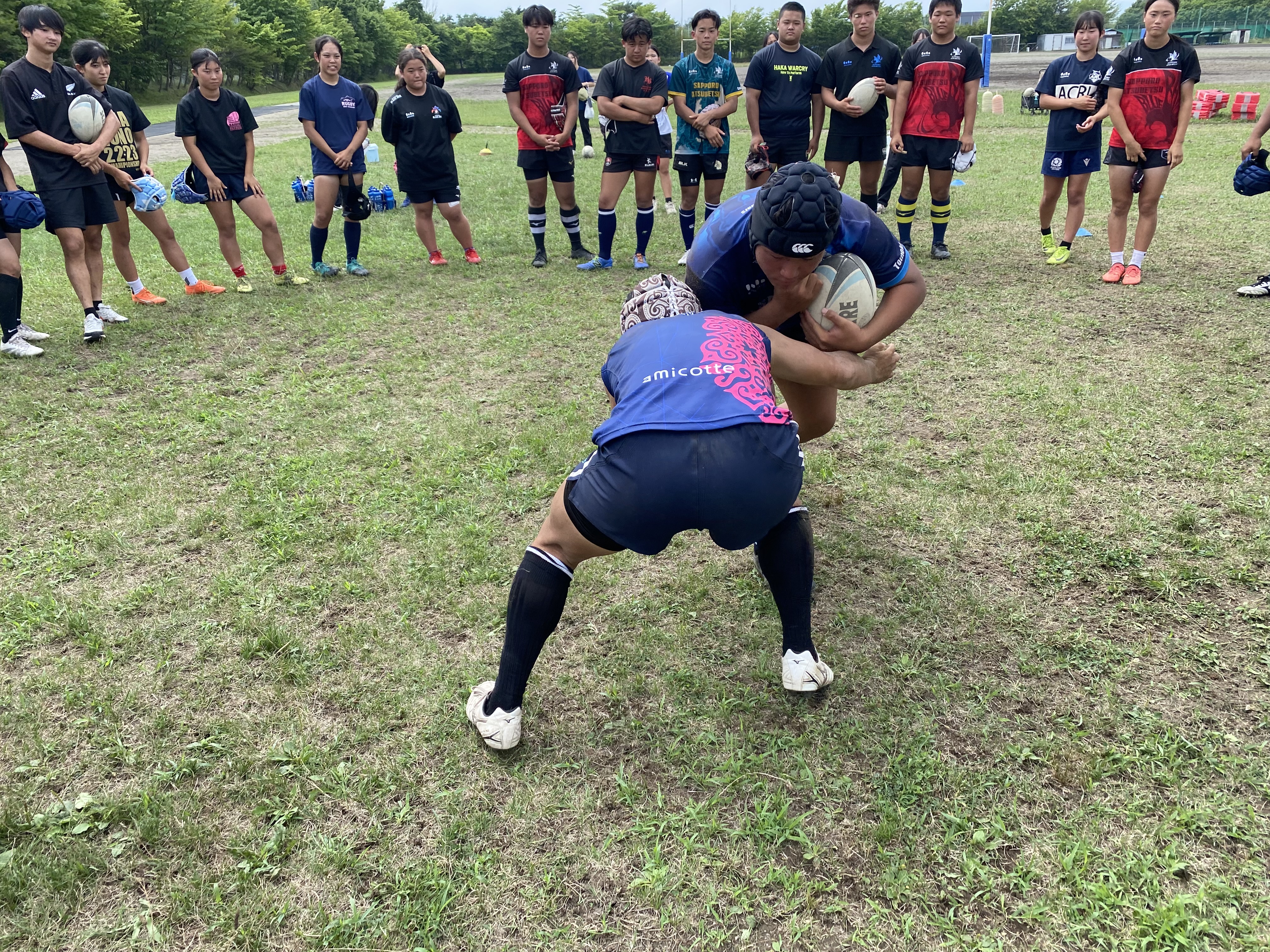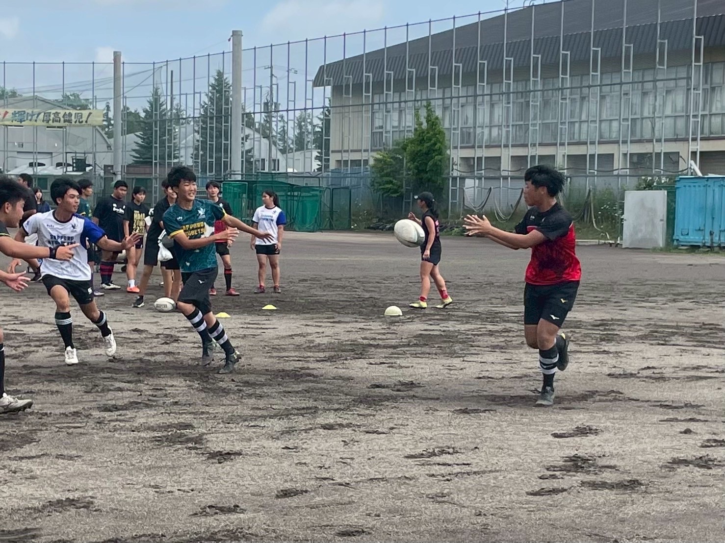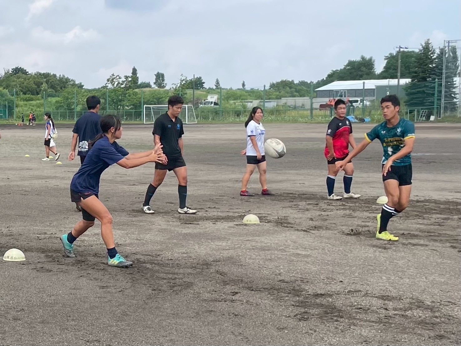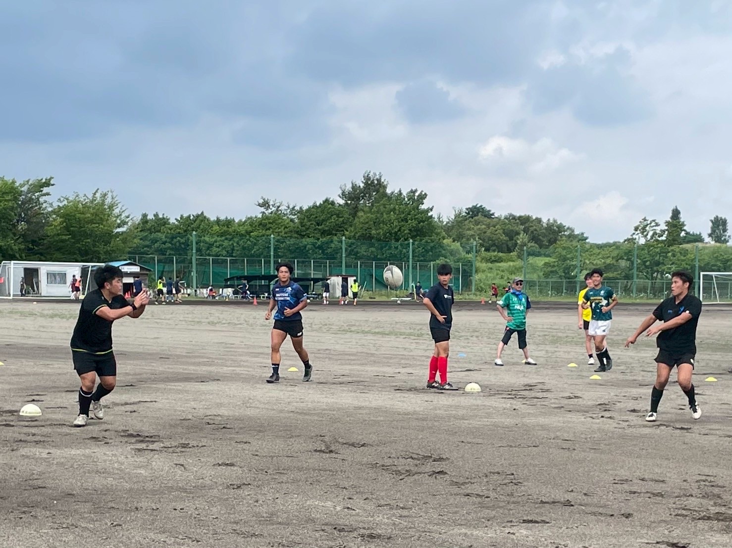 次に、キャリーの練習を行いました。低く、鋭く当たりにいくことを心がけて練習に取り組みましょう。山口先生からは、テンポの速さや、ヒットをして相手を後ろに下げることなどを意識するようにとアドバイスをいただきました。また、常翔と厚別は、オーバーの動きやグラウンドワークの速さが違うということを改めて確認しました。その後、人数を増やし再びキャリーの練習を行いました。人数が増えてもやることは同じなので、ポイントを押さえつつ練習に励みましょう。