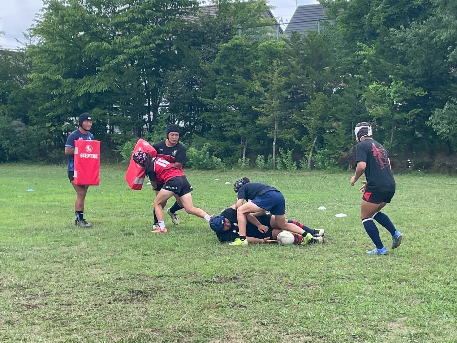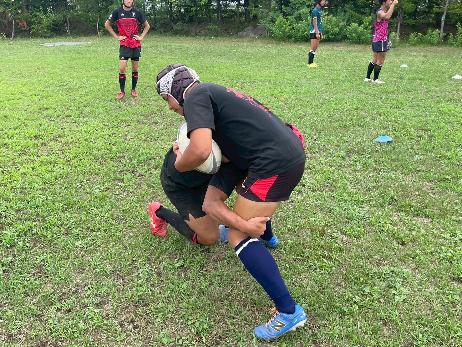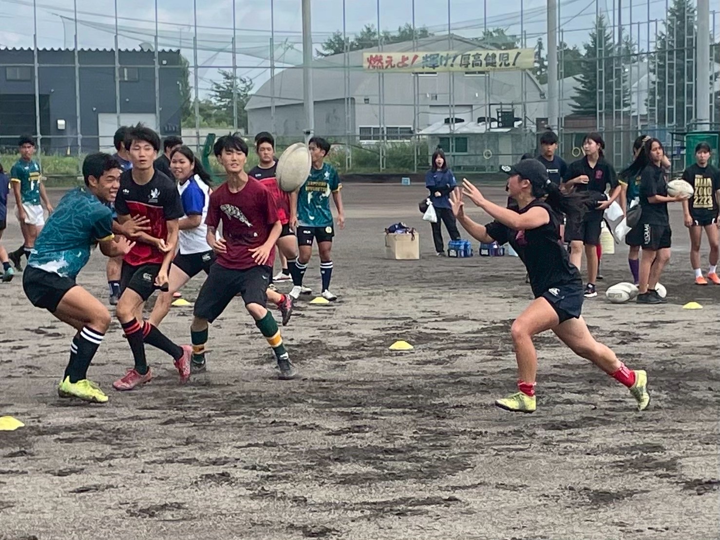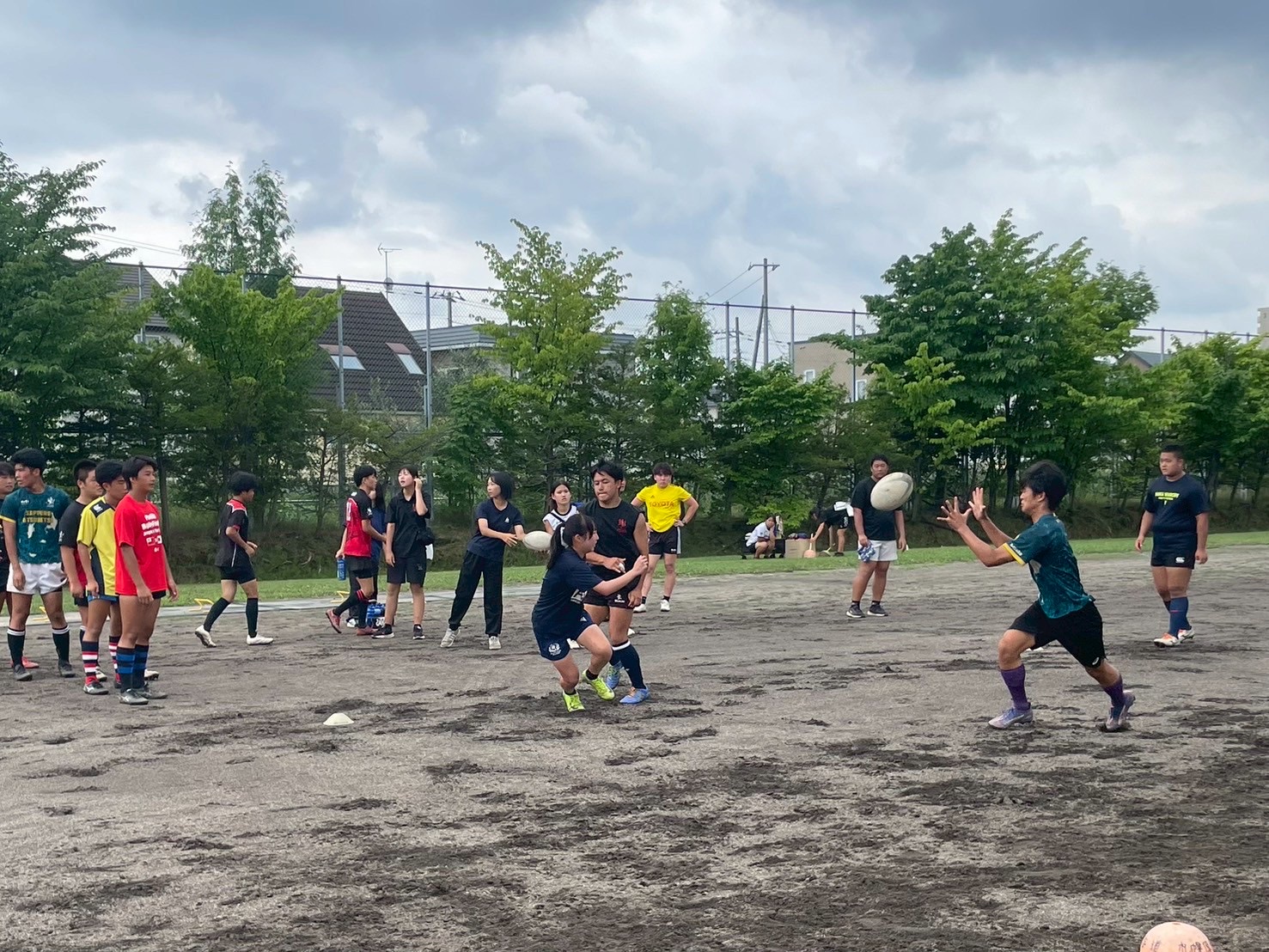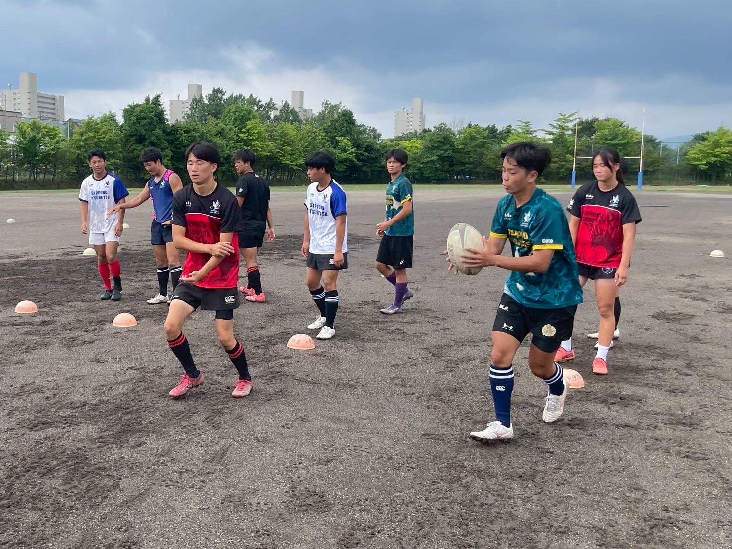 次に、キャリーの練習を行いました。低く、鋭く当たりにいくことを心がけて練習に取り組みましょう。山口先生からは、テンポの速さや、ヒットをして相手を後ろに下げることなどを意識するようにとアドバイスをいただきました。また、常翔と厚別は、オーバーの動きやグラウンドワークの速さが違うということを改めて確認しました。その後、人数を増やし再びキャリーの練習を行いました。人数が増えてもやることは同じなので、ポイントを押さえつつ練習に励みましょう。