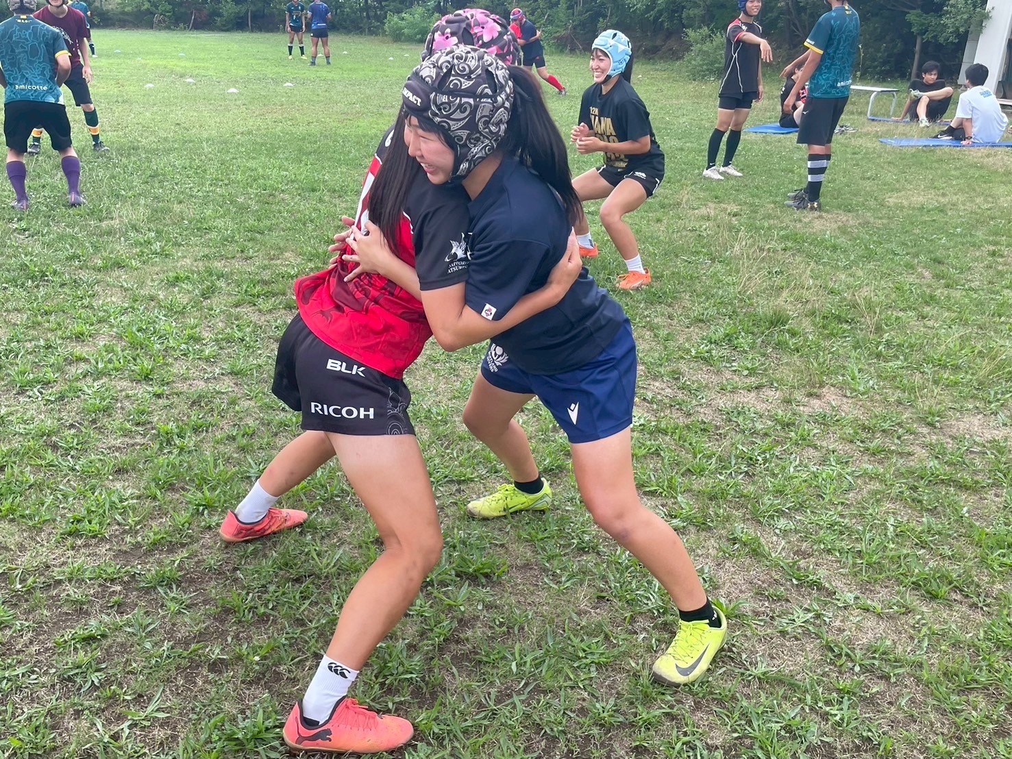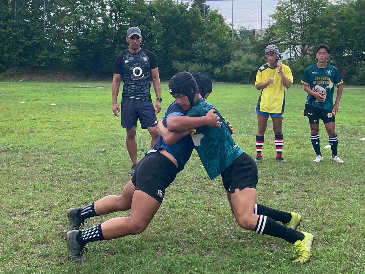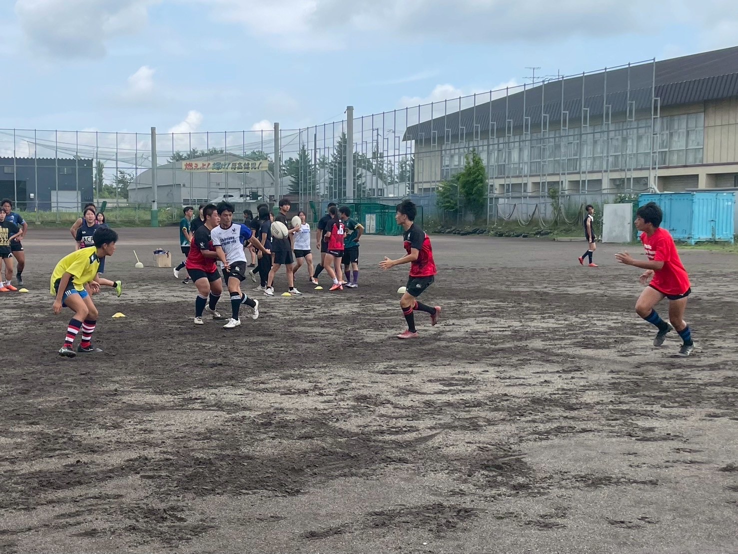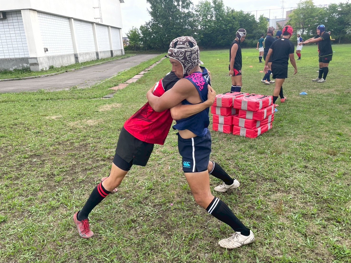 次に、キャリーの練習を行いました。低く、鋭く当たりにいくことを心がけて練習に取り組みましょう。山口先生からは、テンポの速さや、ヒットをして相手を後ろに下げることなどを意識するようにとアドバイスをいただきました。また、常翔と厚別は、オーバーの動きやグラウンドワークの速さが違うということを改めて確認しました。その後、人数を増やし再びキャリーの練習を行いました。人数が増えてもやることは同じなので、ポイントを押さえつつ練習に励みましょう。