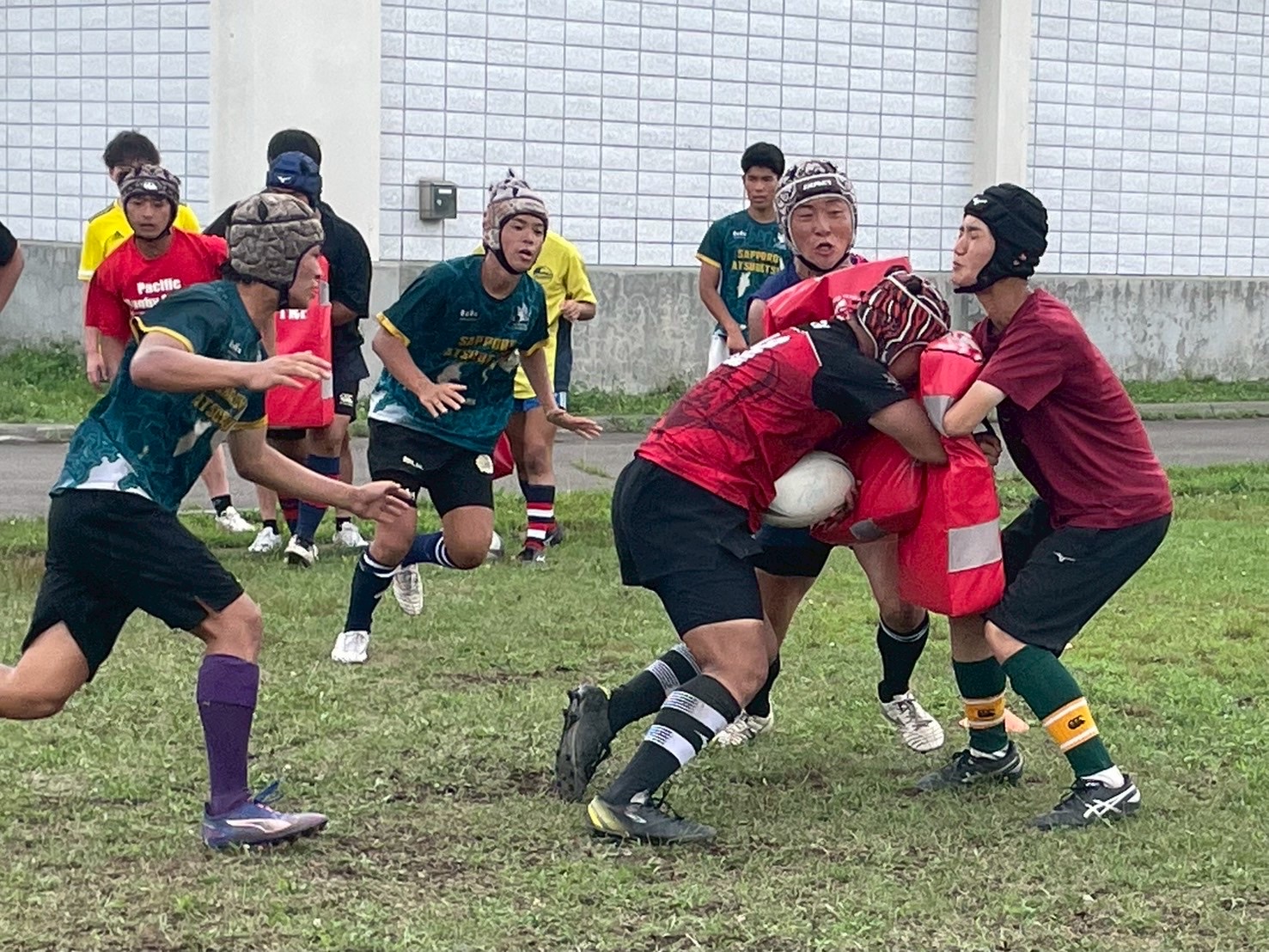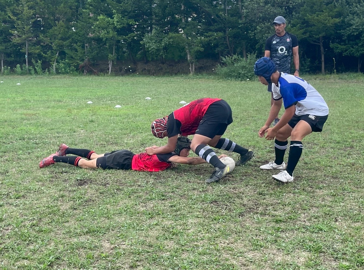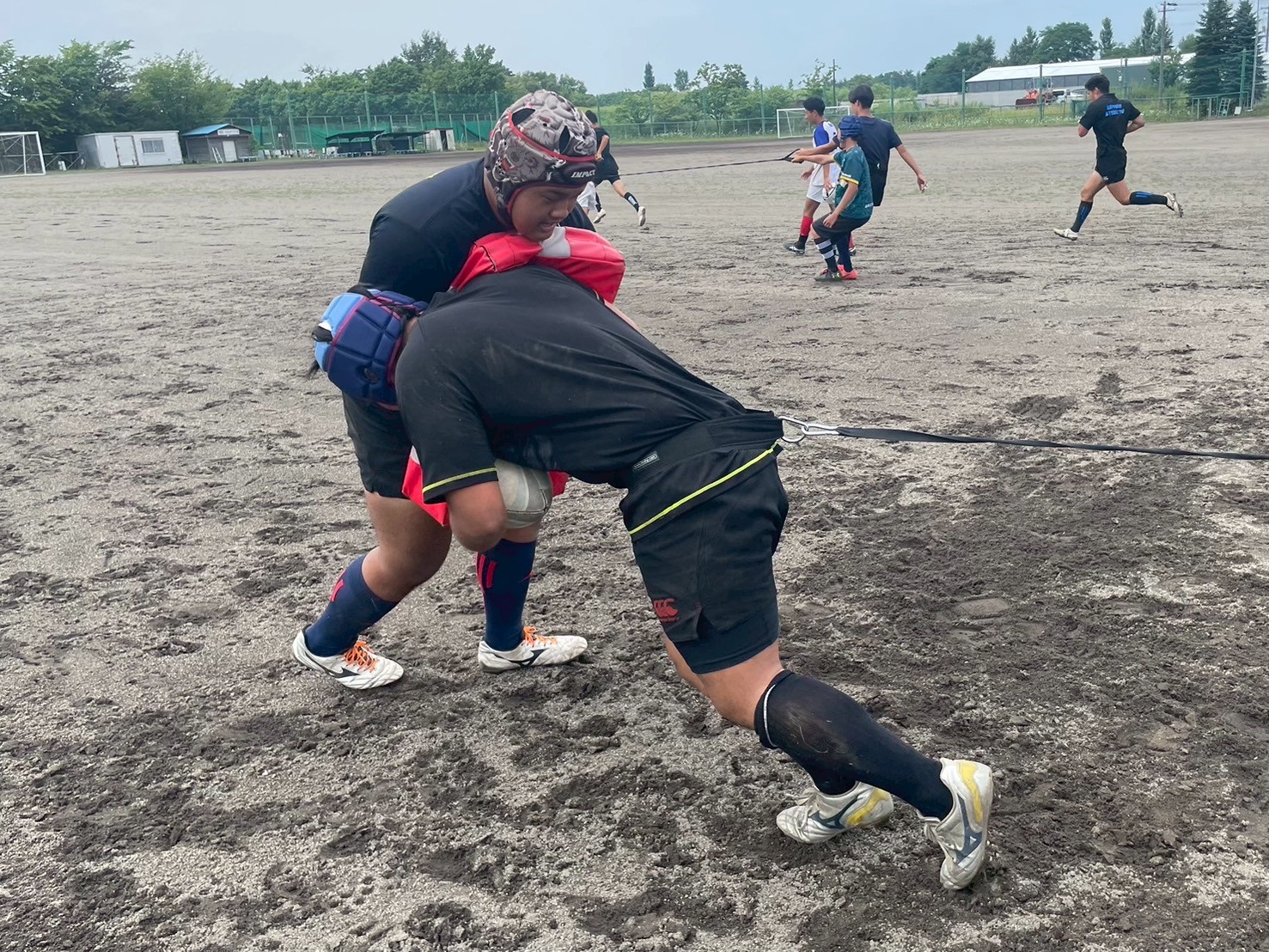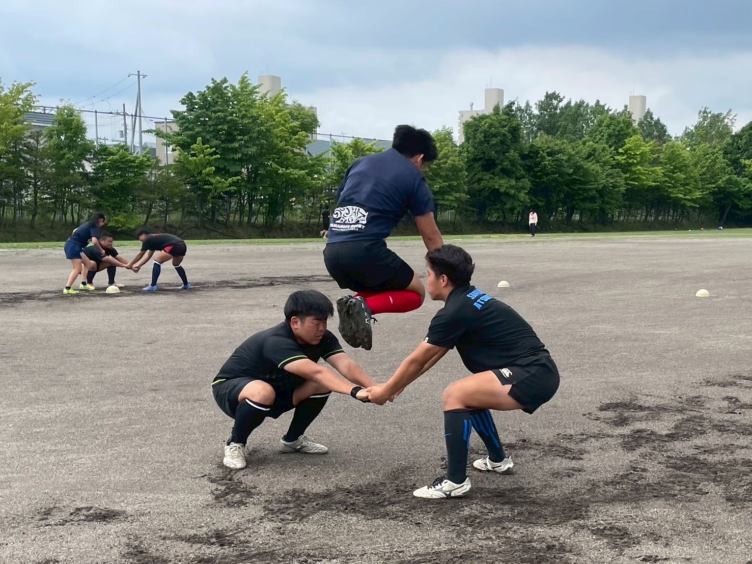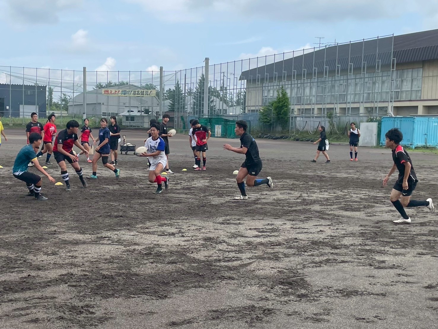 次に、キャリーの練習を行いました。低く、鋭く当たりにいくことを心がけて練習に取り組みましょう。山口先生からは、テンポの速さや、ヒットをして相手を後ろに下げることなどを意識するようにとアドバイスをいただきました。また、常翔と厚別は、オーバーの動きやグラウンドワークの速さが違うということを改めて確認しました。その後、人数を増やし再びキャリーの練習を行いました。人数が増えてもやることは同じなので、ポイントを押さえつつ練習に励みましょう。