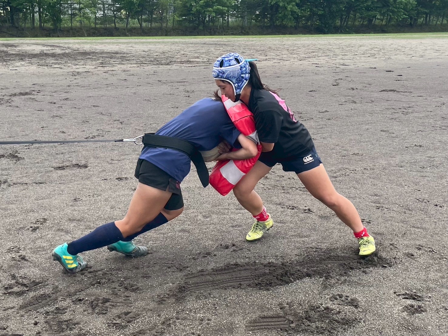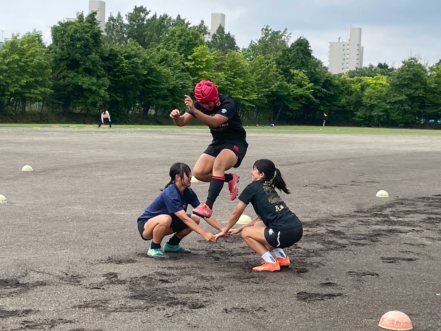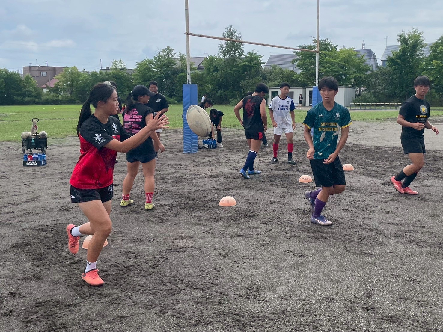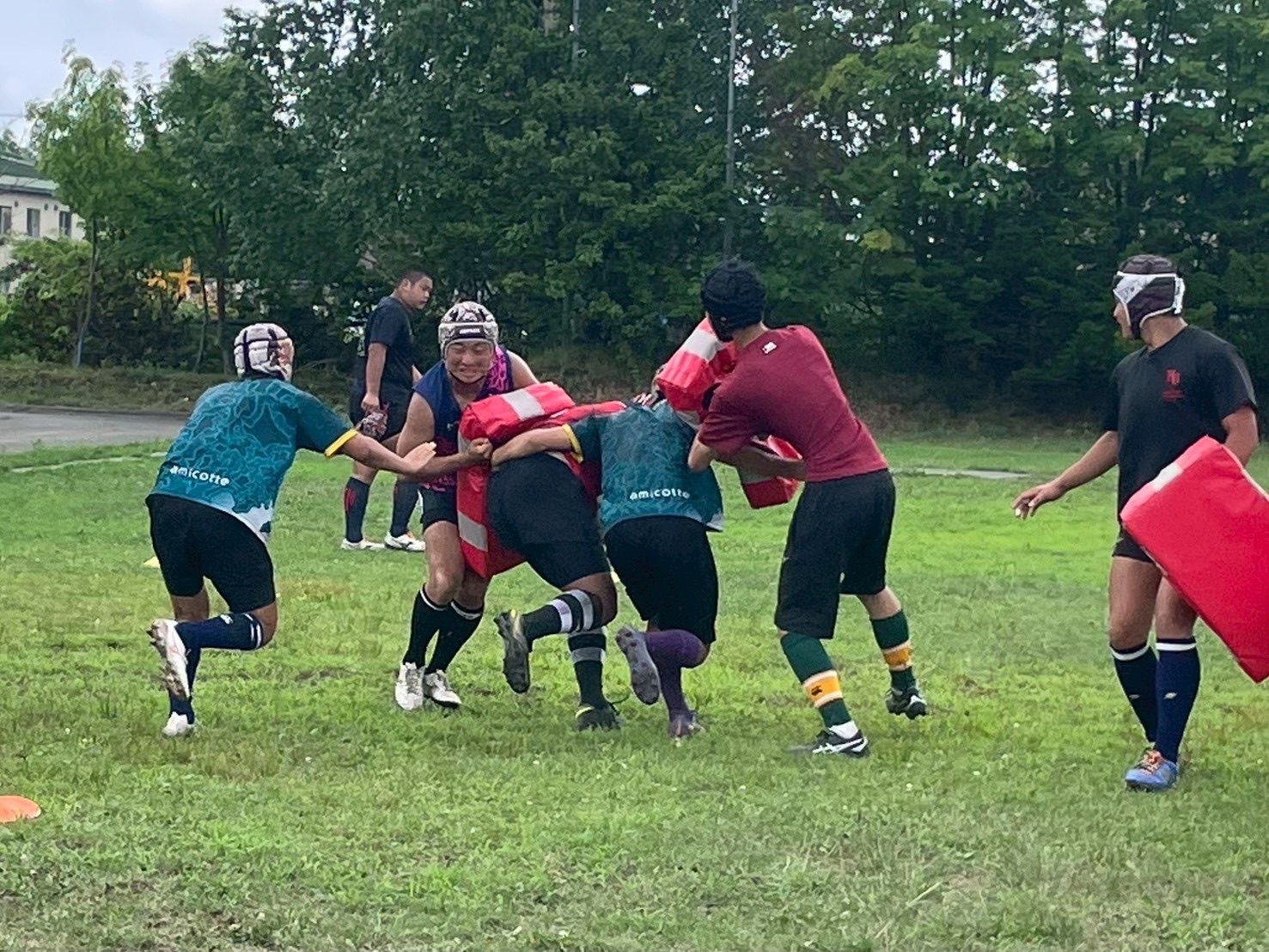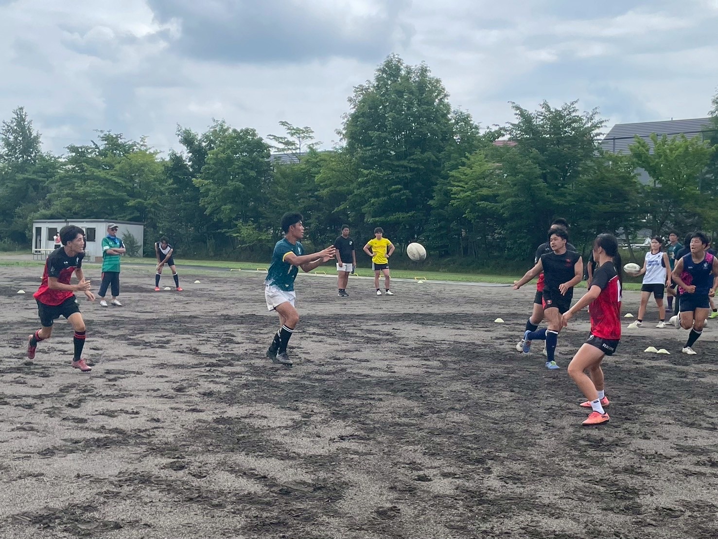 次に、キャリーの練習を行いました。低く、鋭く当たりにいくことを心がけて練習に取り組みましょう。山口先生からは、テンポの速さや、ヒットをして相手を後ろに下げることなどを意識するようにとアドバイスをいただきました。また、常翔と厚別は、オーバーの動きやグラウンドワークの速さが違うということを改めて確認しました。その後、人数を増やし再びキャリーの練習を行いました。人数が増えてもやることは同じなので、ポイントを押さえつつ練習に励みましょう。