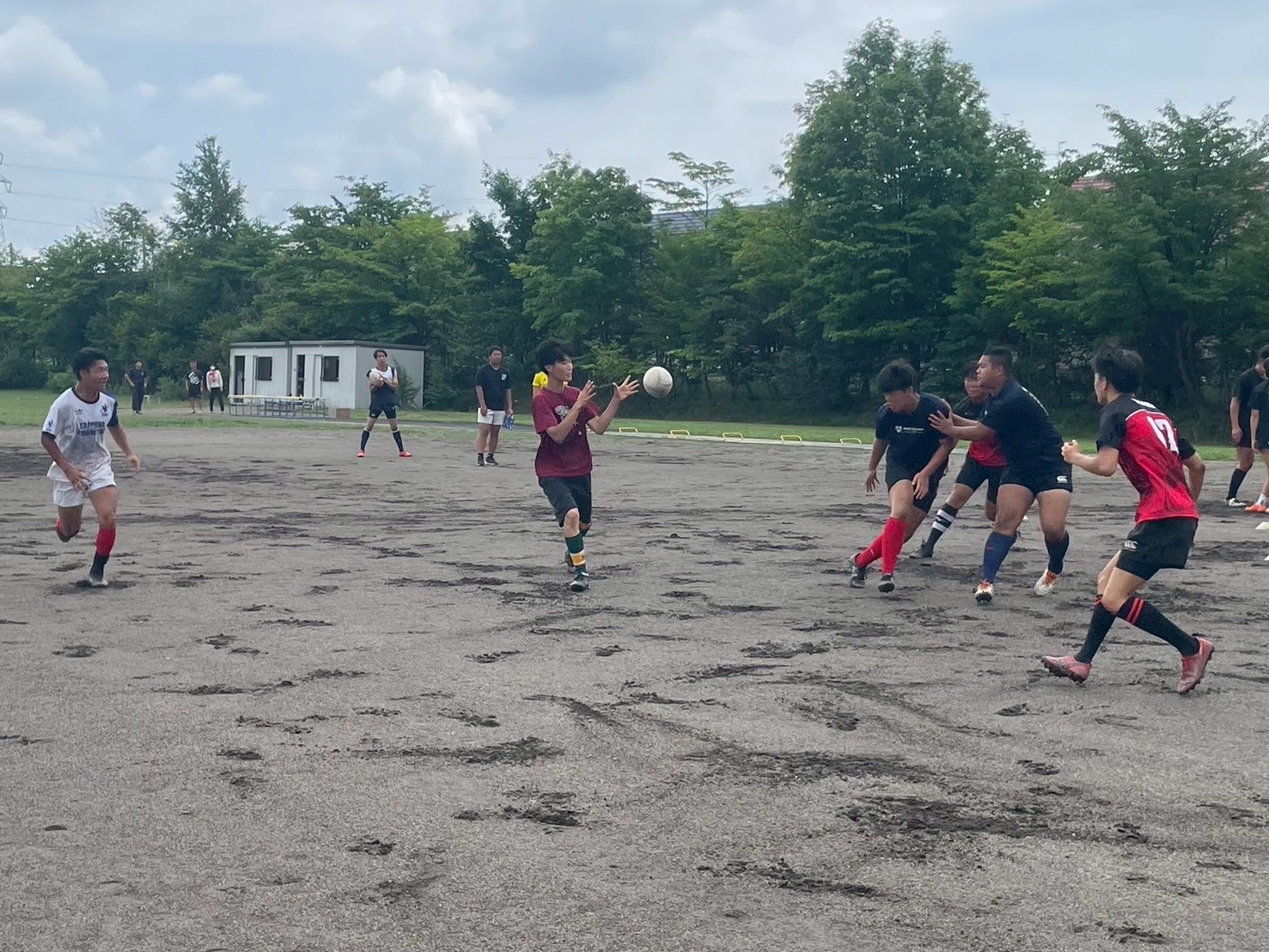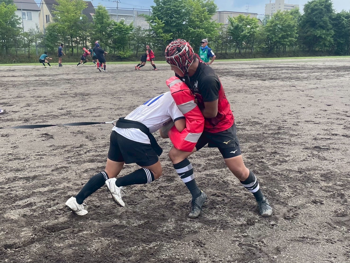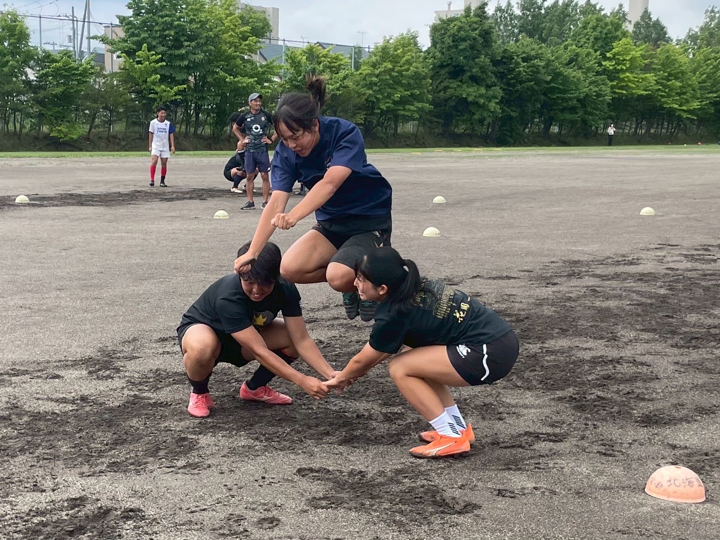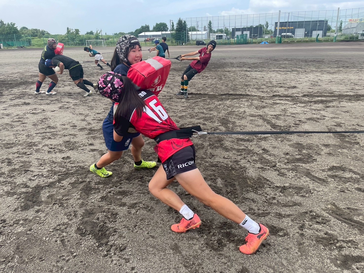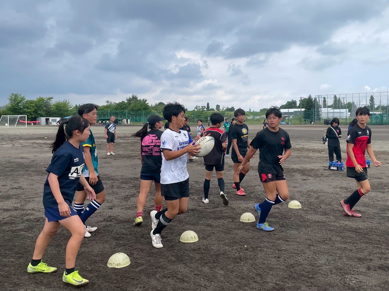 次に、キャリーの練習を行いました。低く、鋭く当たりにいくことを心がけて練習に取り組みましょう。山口先生からは、テンポの速さや、ヒットをして相手を後ろに下げることなどを意識するようにとアドバイスをいただきました。また、常翔と厚別は、オーバーの動きやグラウンドワークの速さが違うということを改めて確認しました。その後、人数を増やし再びキャリーの練習を行いました。人数が増えてもやることは同じなので、ポイントを押さえつつ練習に励みましょう。