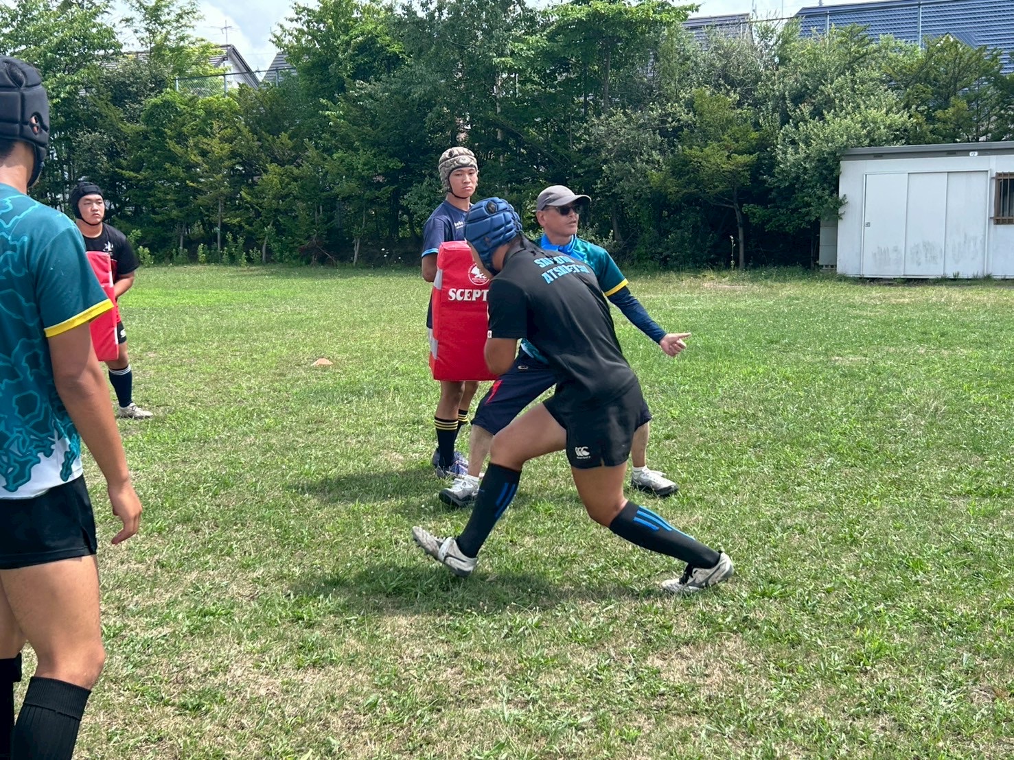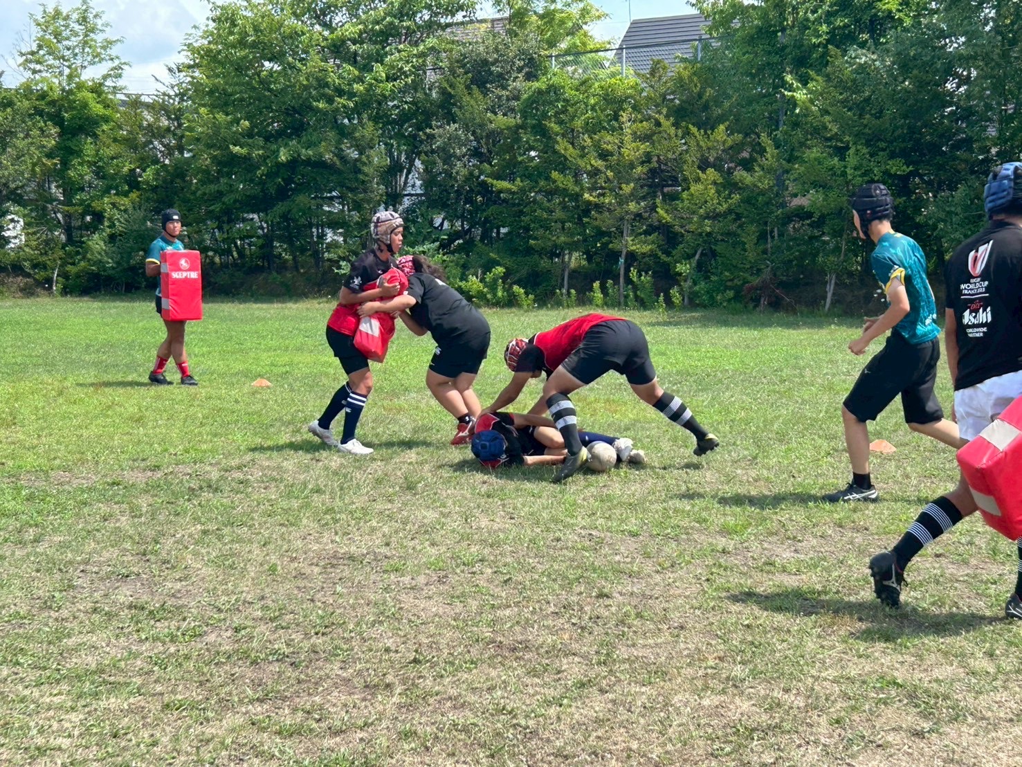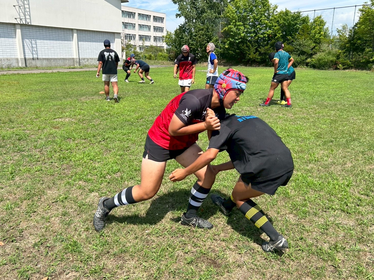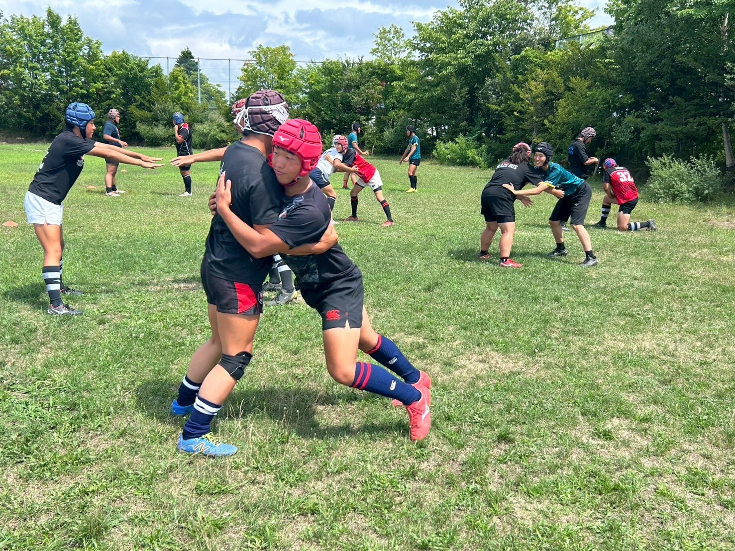 最後に、タックル後にそのまま超える練習を行いました。ブローするときに当てた肩と反対側の手の強い出し方を確認しました。周りからの声も多く、励まし合い取り組む様子が見られました。