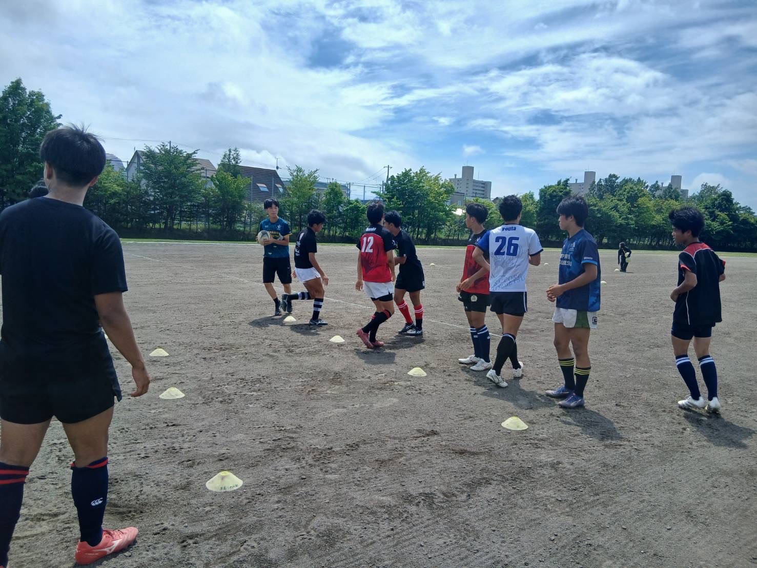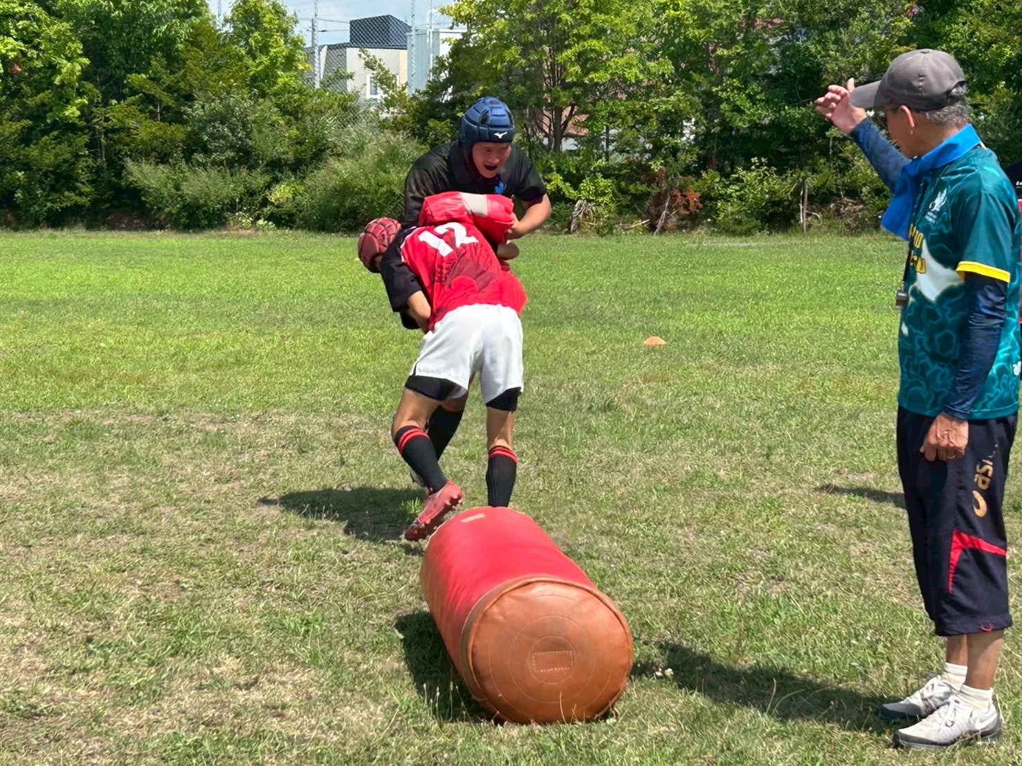 その後、常翔学園から教わった、コンタクト練習を行いました。力強く踏み込み、ポジショニングを考えること、しっかり胸を当てインパクトの強いものにすること、その2つを意識し、取り組む様子が見られました。教え合う姿が多く見られとても良かったと思います。