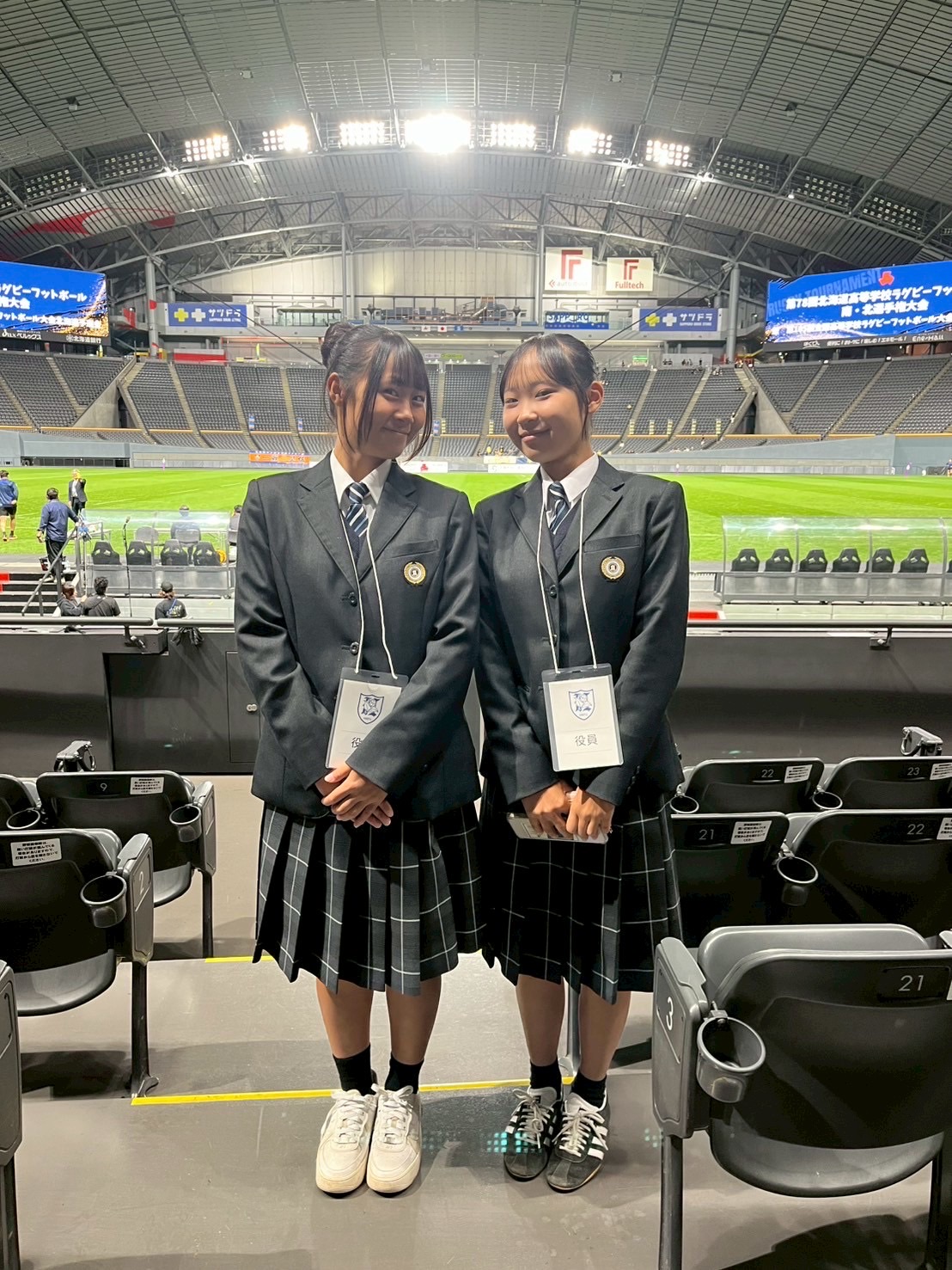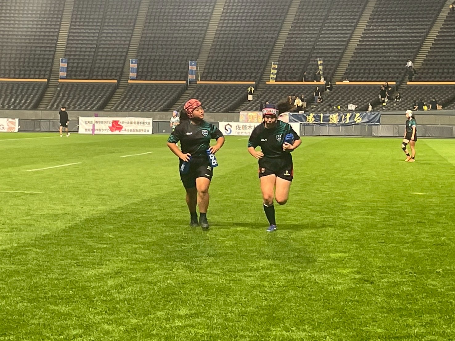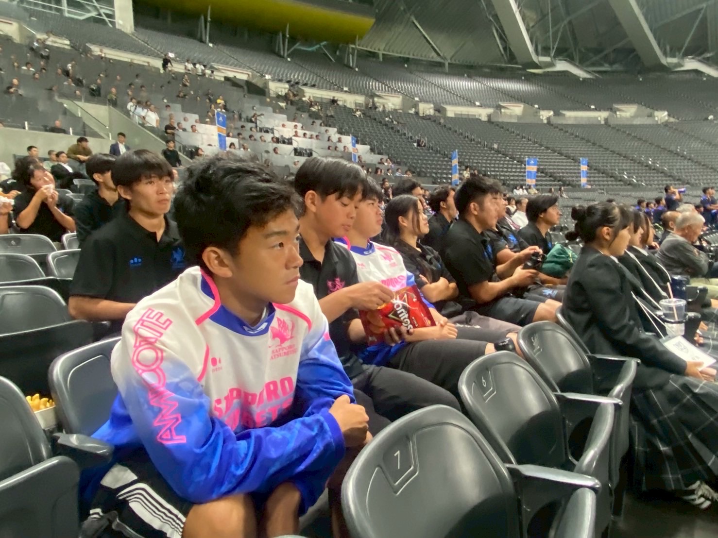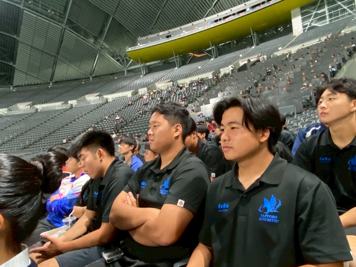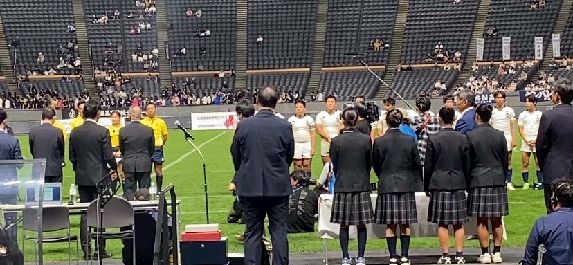 その後、南北海道全道決勝戦 立命館慶祥vs札幌山の手、そして北北海道全道決勝戦 遠軽vs中標津を観戦しました。ウォーミングアップから試合までを通して観戦することで、アップを参考にしたり自分たちの知見を広げる良い機会となりました。試合中は、良いプレーやトライが決まると自然と歓声が沸き起こり、試合の臨場感をより一層味わうことができました。また、各チームの戦略や技術から多くの学びを得ることができ、自分自身の課題にも気づくことができたと思います。今日学んだこと、新たに気づいたことを仲間同士で共有し、今後の練習や試合に活かしていきましょう! また、来年こそは自分たちもドームで試合できるように頑張りましょう!
