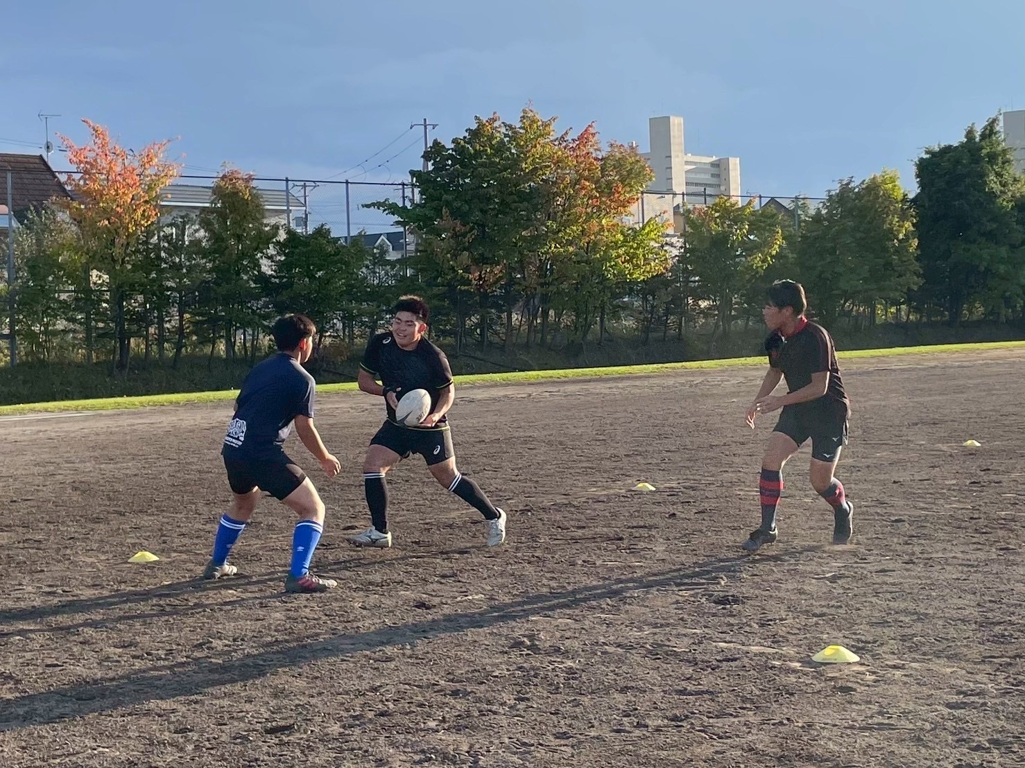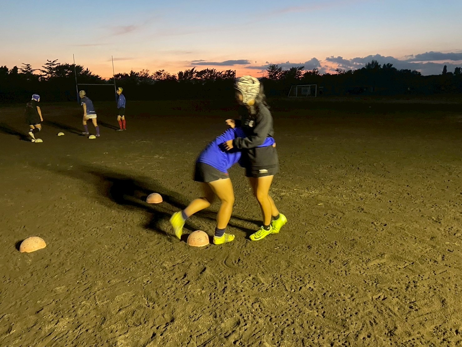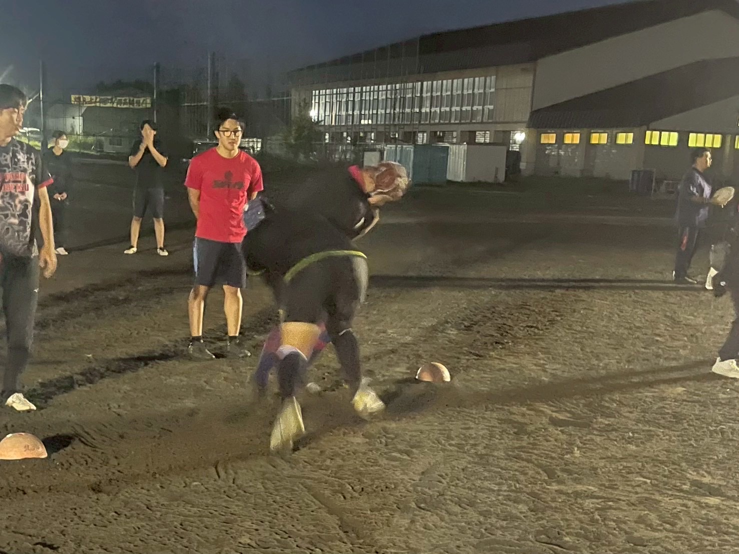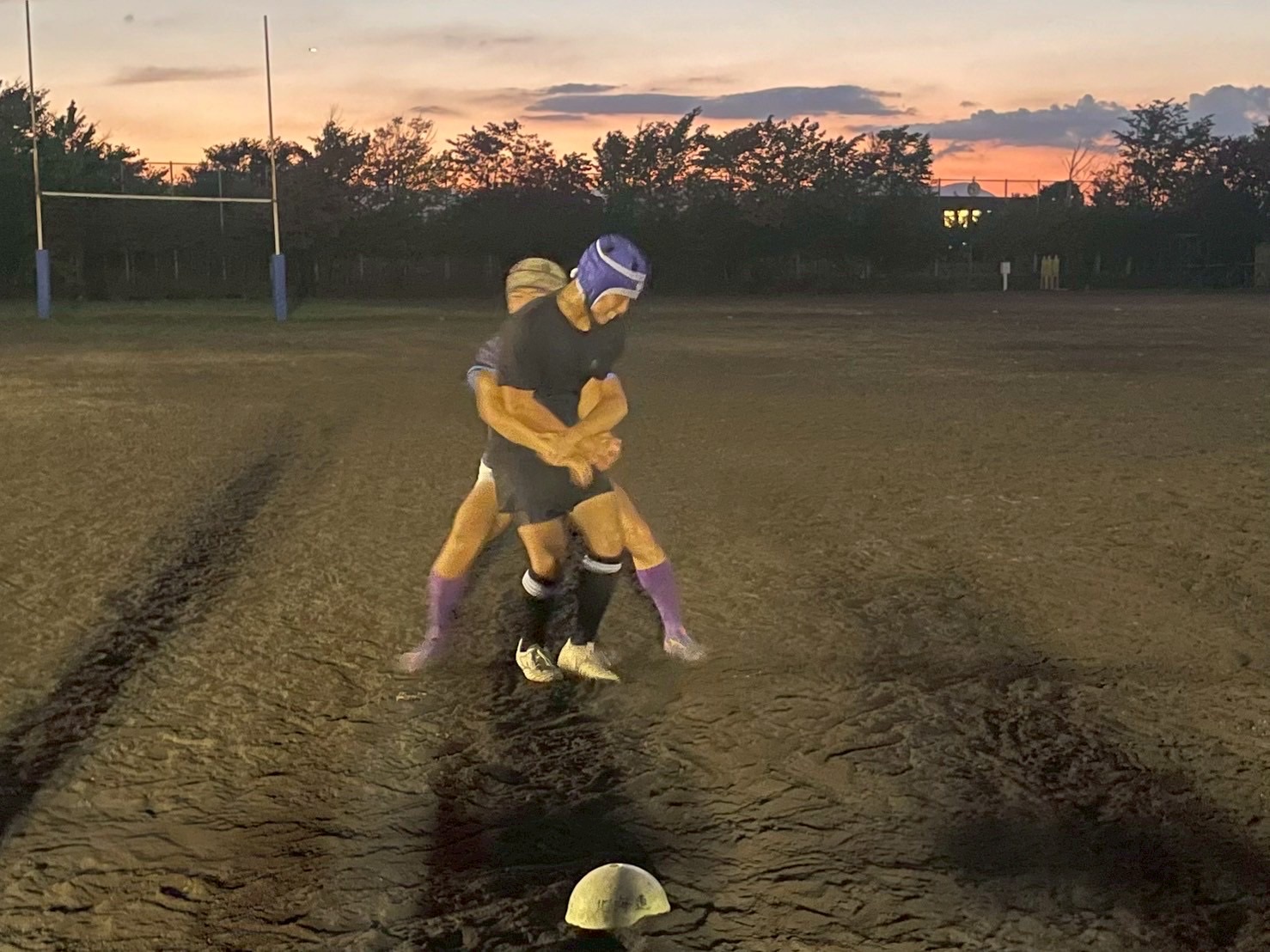 次に1対1を行いました。肩を当てながら相手の懐に入り込むイメージで練習を行いましょう。ポイントを外されても、サイドタックルで仕留めましょう。また、1年鈴木と糸田がナイスステップを踏めていました。