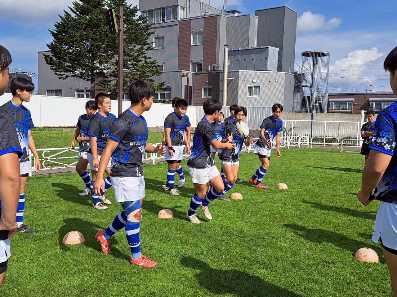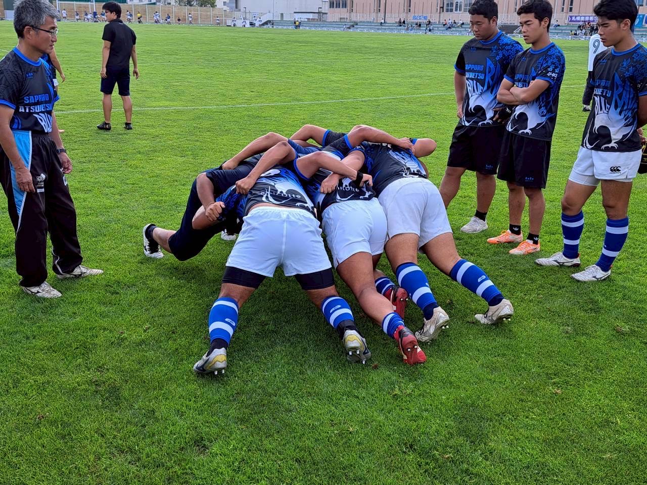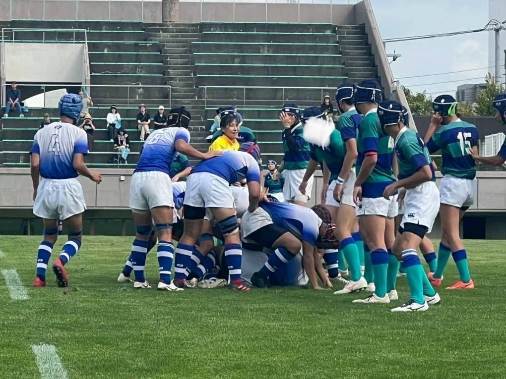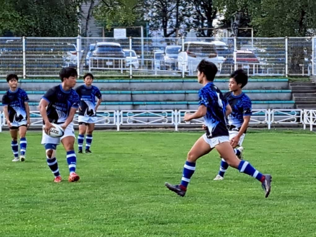 厚別のキックオフで試合がスタート。開始1分敵陣10mライン付近で、ユアボールでのラインアウトからモールになりました。自陣10mライン付近まで押されますが、ボールを持ち、抜けた相手を2年横田、向井がダブルタックルを決め、その後、2年前川もナイスタックルをしました。ですが、開始3分、ディフェンスを抜けられ、トライを許しました。タックルをしてもバインドが外れてしまい、抜けられてしまっている場面がありました。バインドを外さないように努めましょう。開始9分、練習していた1年鈴木のナイスキックにより、50/22で敵陣ゴールライン付近でマイボールラインアウトになりました。そこからモールで相手のペナルティがあり、開始11分、1年糸田のピックゴーで相手を抜け、そのままトライをしました。この良い流れを続け、最後までトライを取れるよう走り切りましょう。残り6分、自陣22mライン付近でユアボールラインアウトからのモールになり、押されそのままトライを許しました。モールが高くなってしまっていました。割れないよう、指示を出しつつ一体になり、低く入りましょう。残り3分半、敵陣10mライン付近でのユアボールラインアウトからモールで、ハーフライン付近まで押されますが、2年蛇谷、綿谷が再びダブルタックルを決めました。しかし、抑えきれずパスを回され残り2分、トライを許しました。