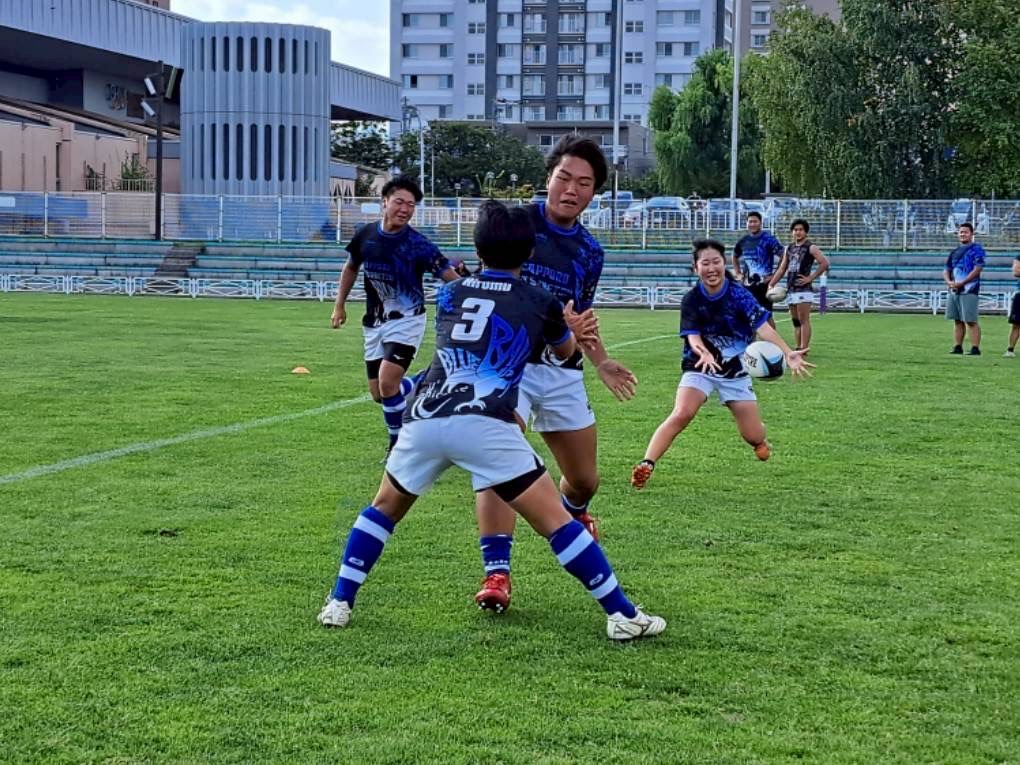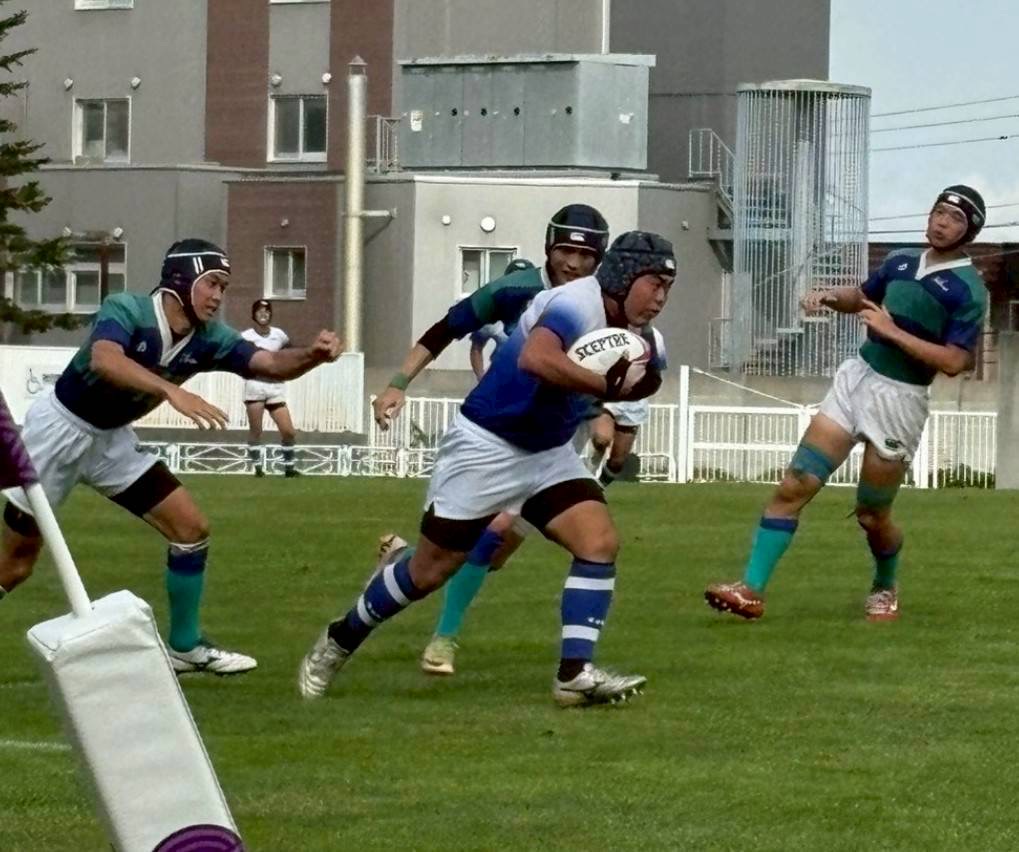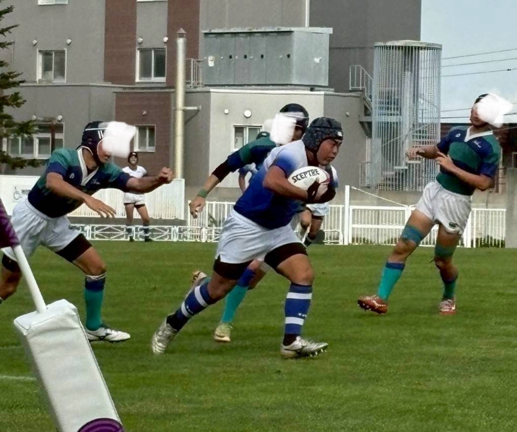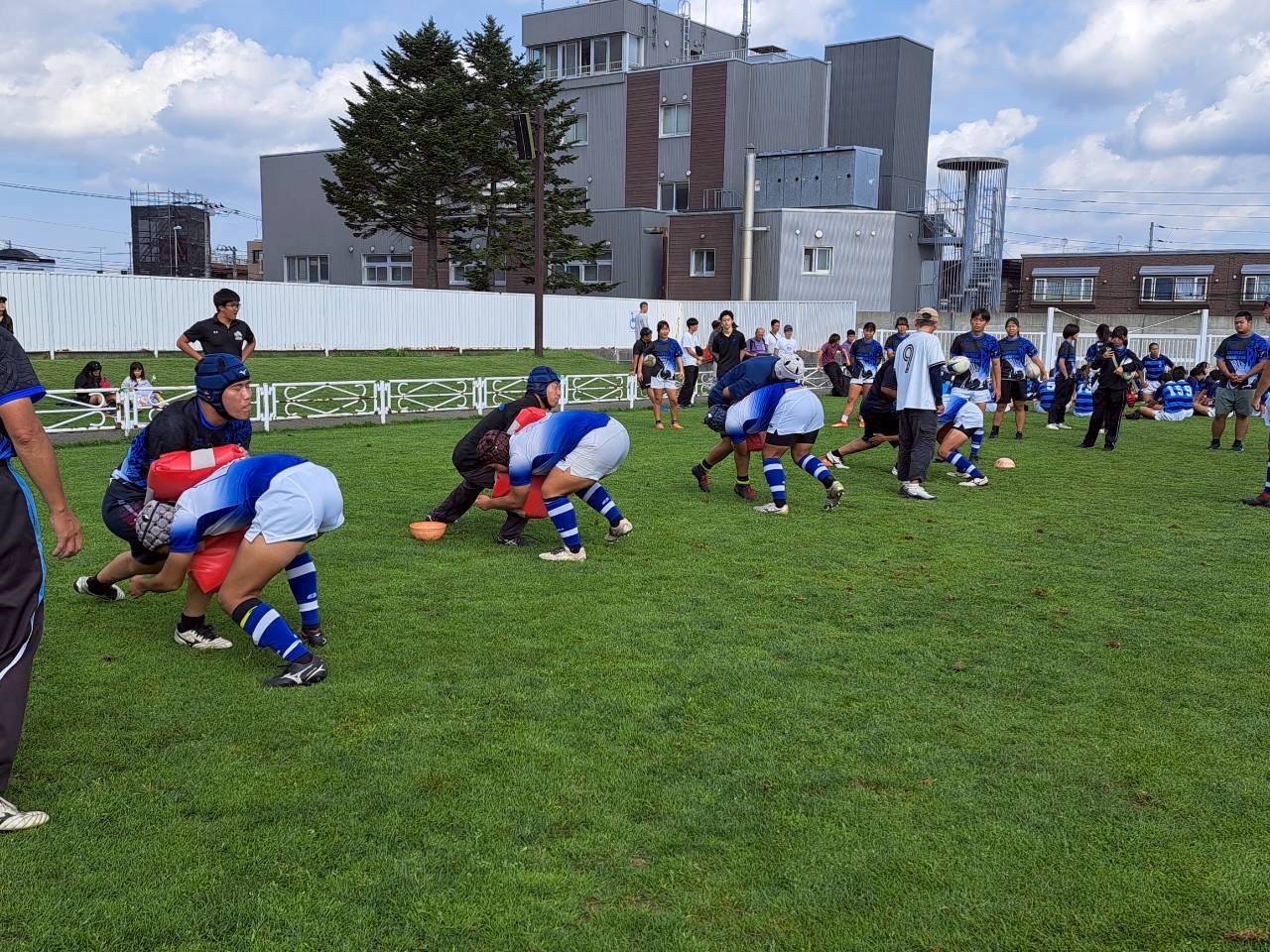 厚別のキックオフで試合がスタート。開始1分敵陣10mライン付近で、ユアボールでのラインアウトからモールになりました。自陣10mライン付近まで押されますが、ボールを持ち、抜けた相手を2年横田、向井がダブルタックルを決め、その後、2年前川もナイスタックルをしました。ですが、開始3分、ディフェンスを抜けられ、トライを許しました。タックルをしてもバインドが外れてしまい、抜けられてしまっている場面がありました。バインドを外さないように努めましょう。開始9分、練習していた1年鈴木のナイスキックにより、50/22で敵陣ゴールライン付近でマイボールラインアウトになりました。そこからモールで相手のペナルティがあり、開始11分、1年糸田のピックゴーで相手を抜け、そのままトライをしました。この良い流れを続け、最後までトライを取れるよう走り切りましょう。残り6分、自陣22mライン付近でユアボールラインアウトからのモールになり、押されそのままトライを許しました。モールが高くなってしまっていました。割れないよう、指示を出しつつ一体になり、低く入りましょう。残り3分半、敵陣10mライン付近でのユアボールラインアウトからモールで、ハーフライン付近まで押されますが、2年蛇谷、綿谷が再びダブルタックルを決めました。しかし、抑えきれずパスを回され残り2分、トライを許しました。
