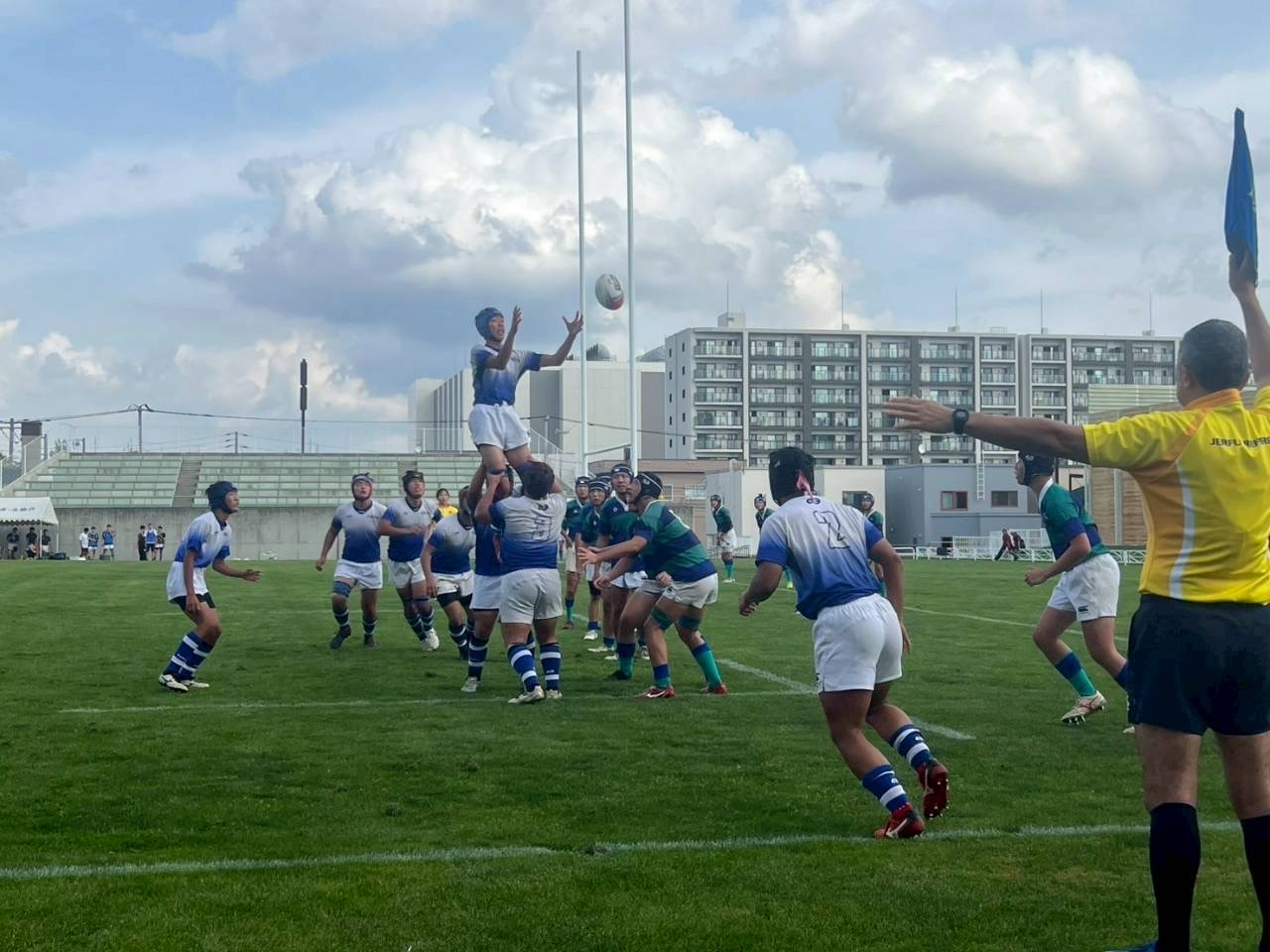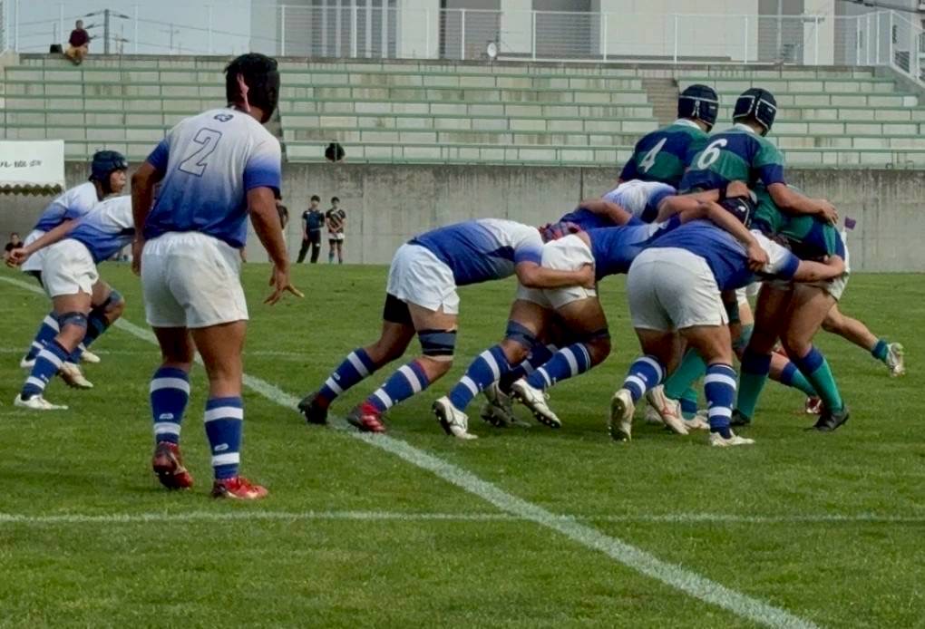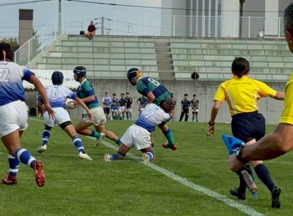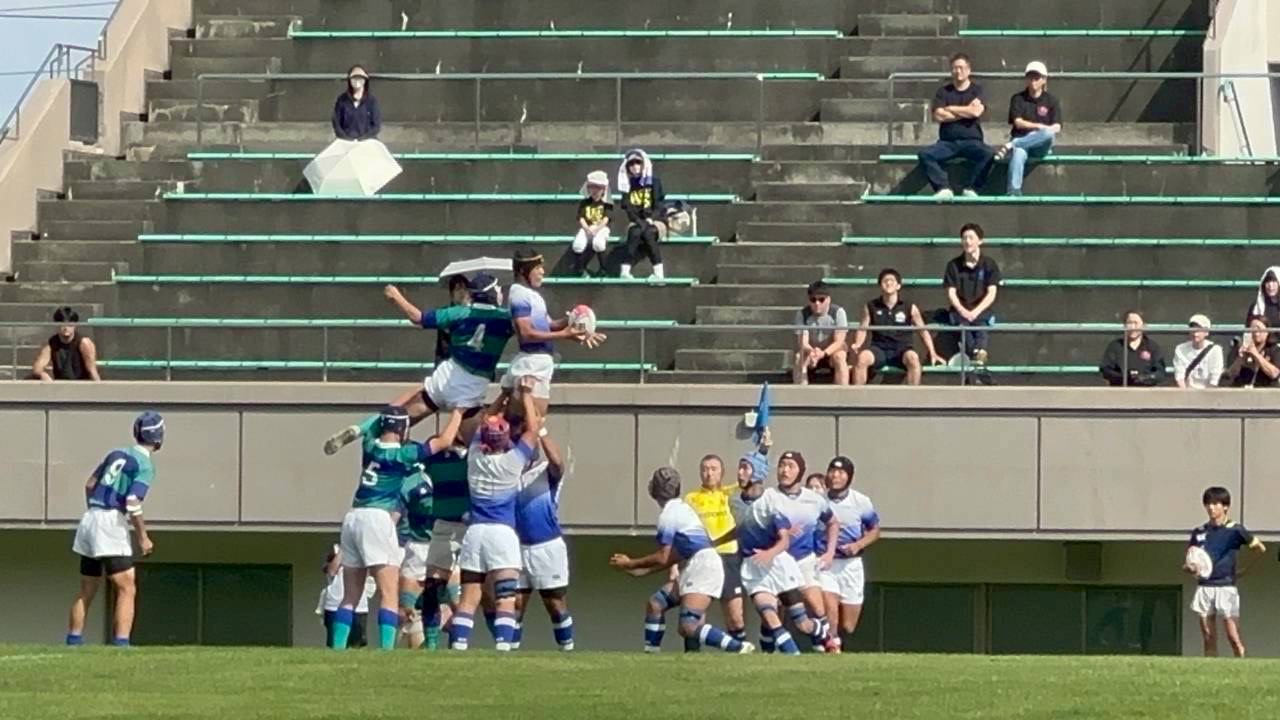 開始15分半、敵陣10mライン付近でユアボールでのラインアウトになりました。ボールが繋がれるも、2年向井と1年橘井がダブルタックルを決めました。マイボールラインアウトからのモールになり、モールを押し、2年政氏が抜け出し走りましたがDFを抜けきれずトライをすることはできませんでした。