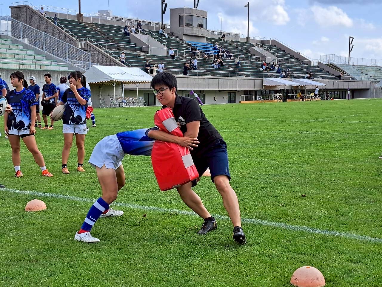その後、BKはグリッドタックル、FWはゲートタックルを行いました。グリッドタックルでは、低く当たり、膝裏タッチを意識しましょう。ゲートタックルでは、肩を強く当て、お尻が割れないようしっかりパックしましょう。