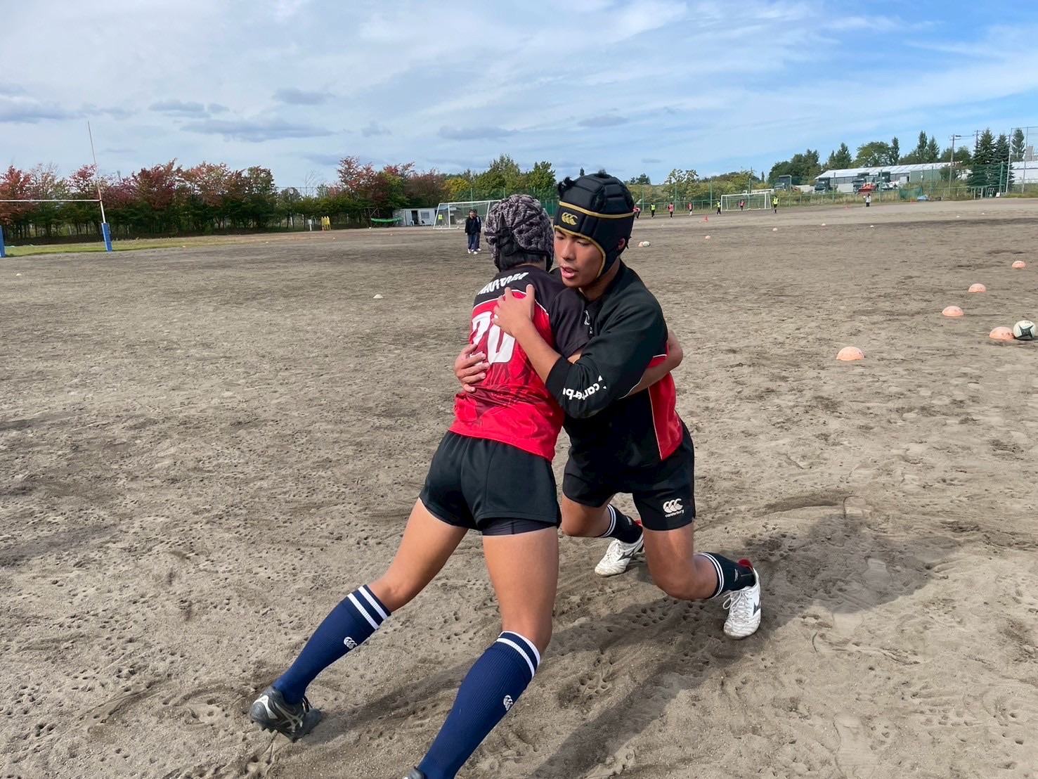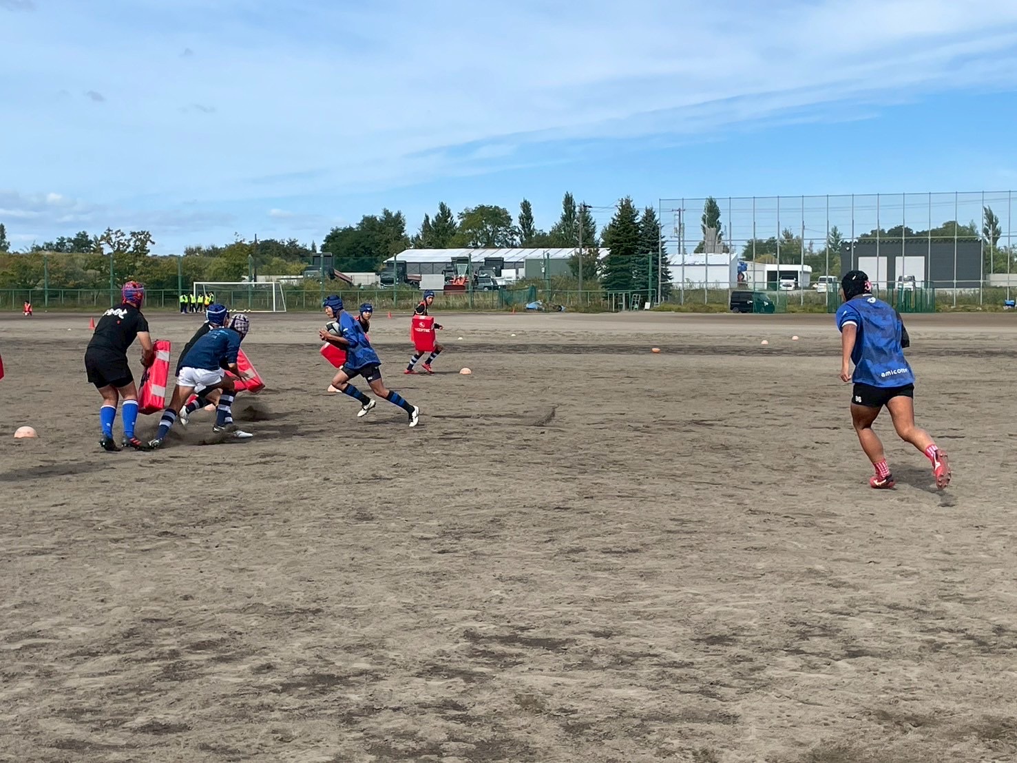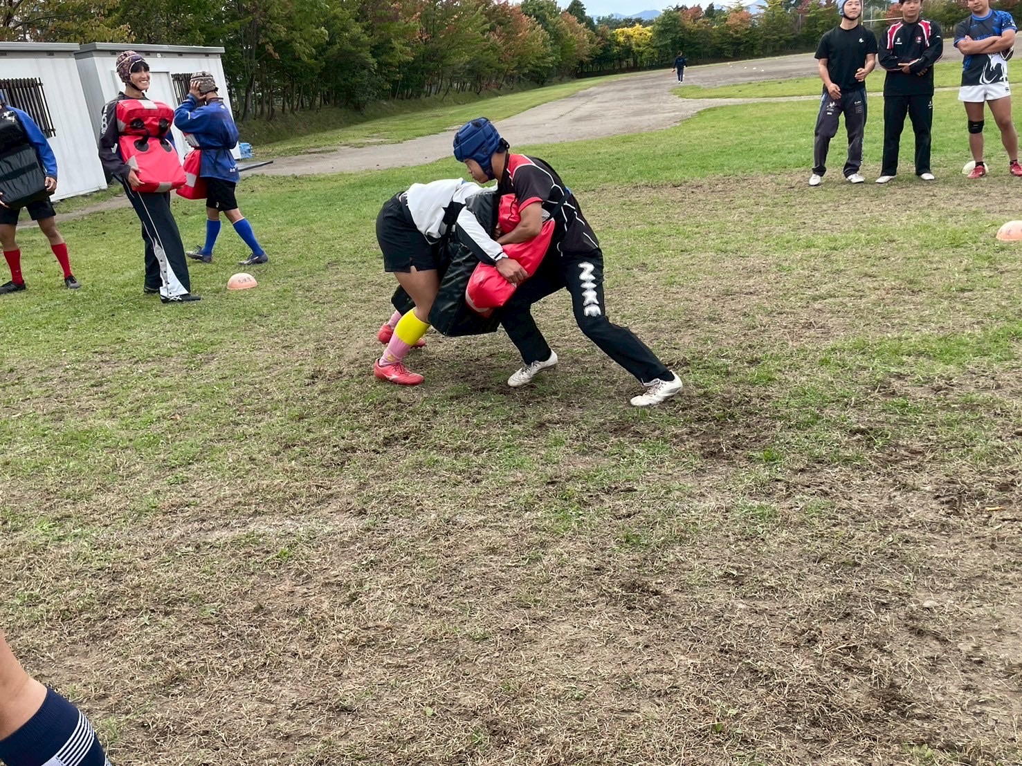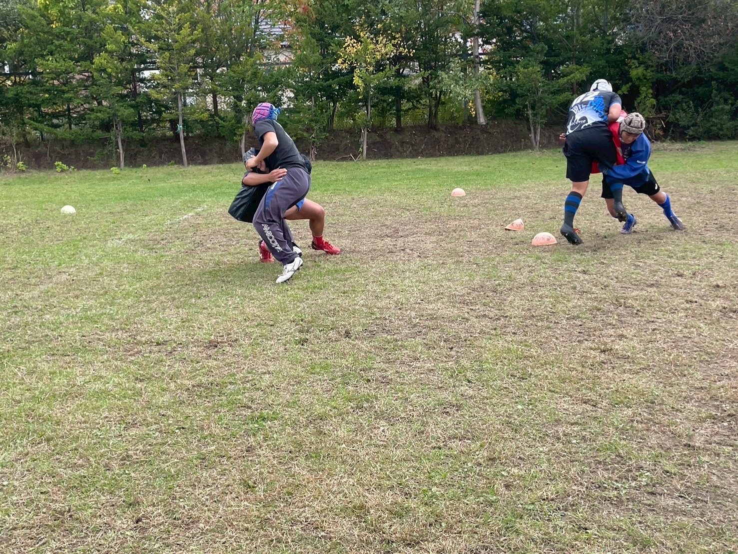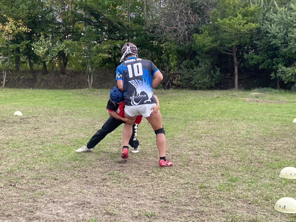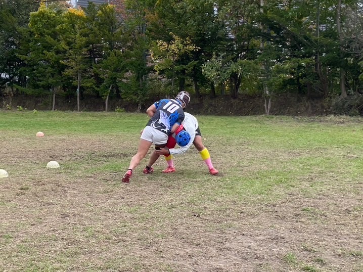 次に、連続タックルを行いました。タックルに入る瞬間にしっかりとディップをして、相手を倒す勢いで当たりにいけるようにしましょう。