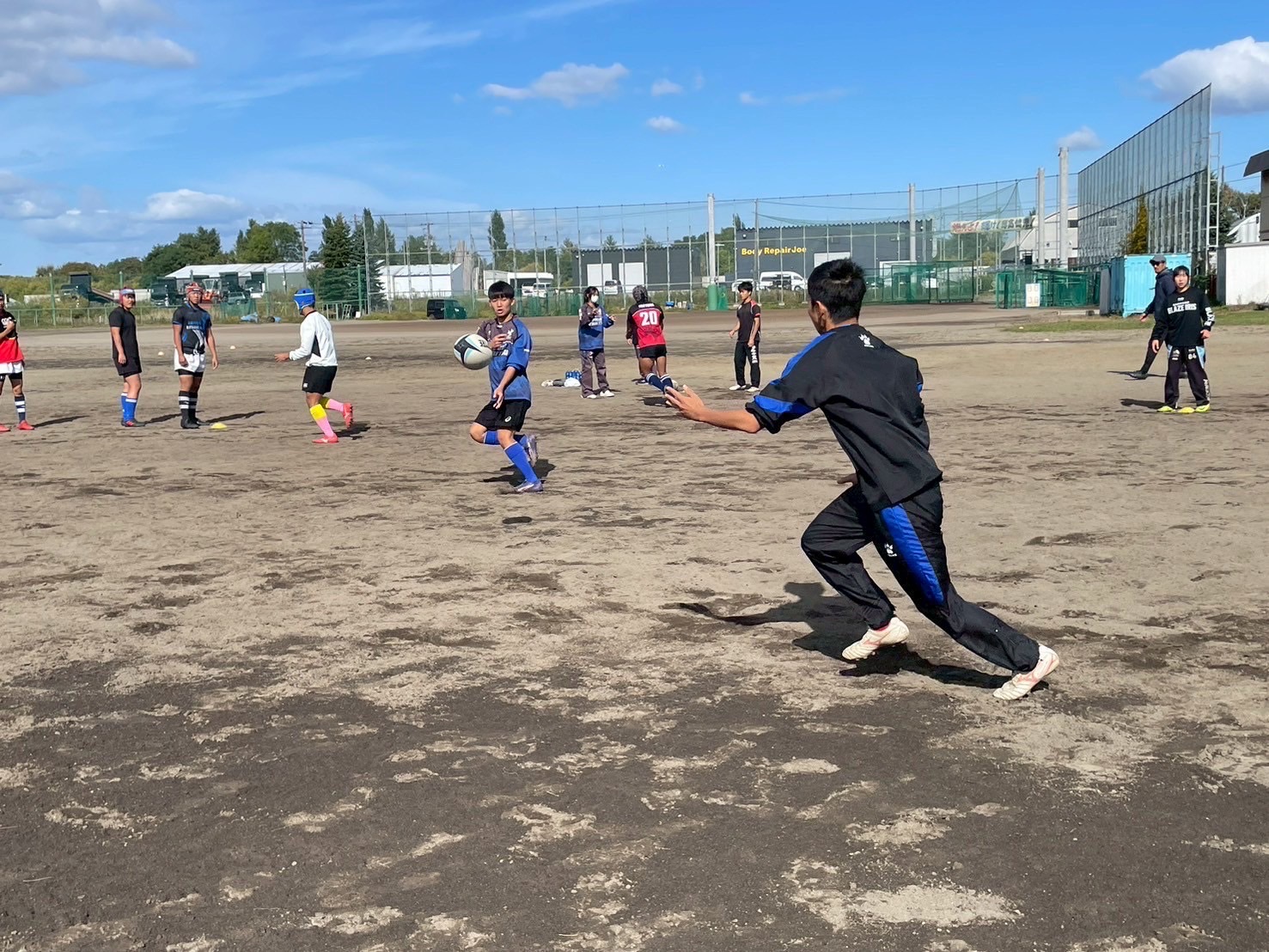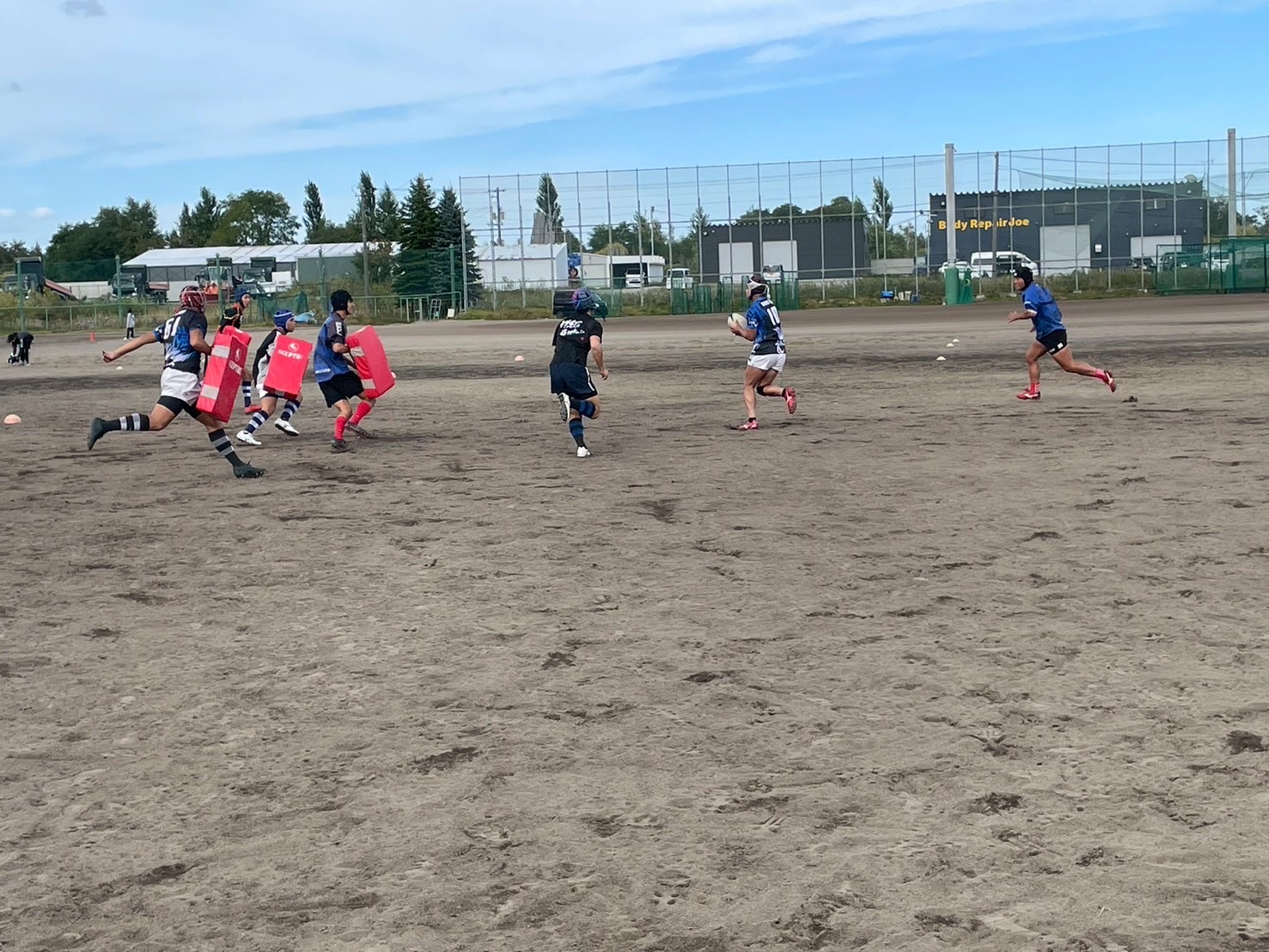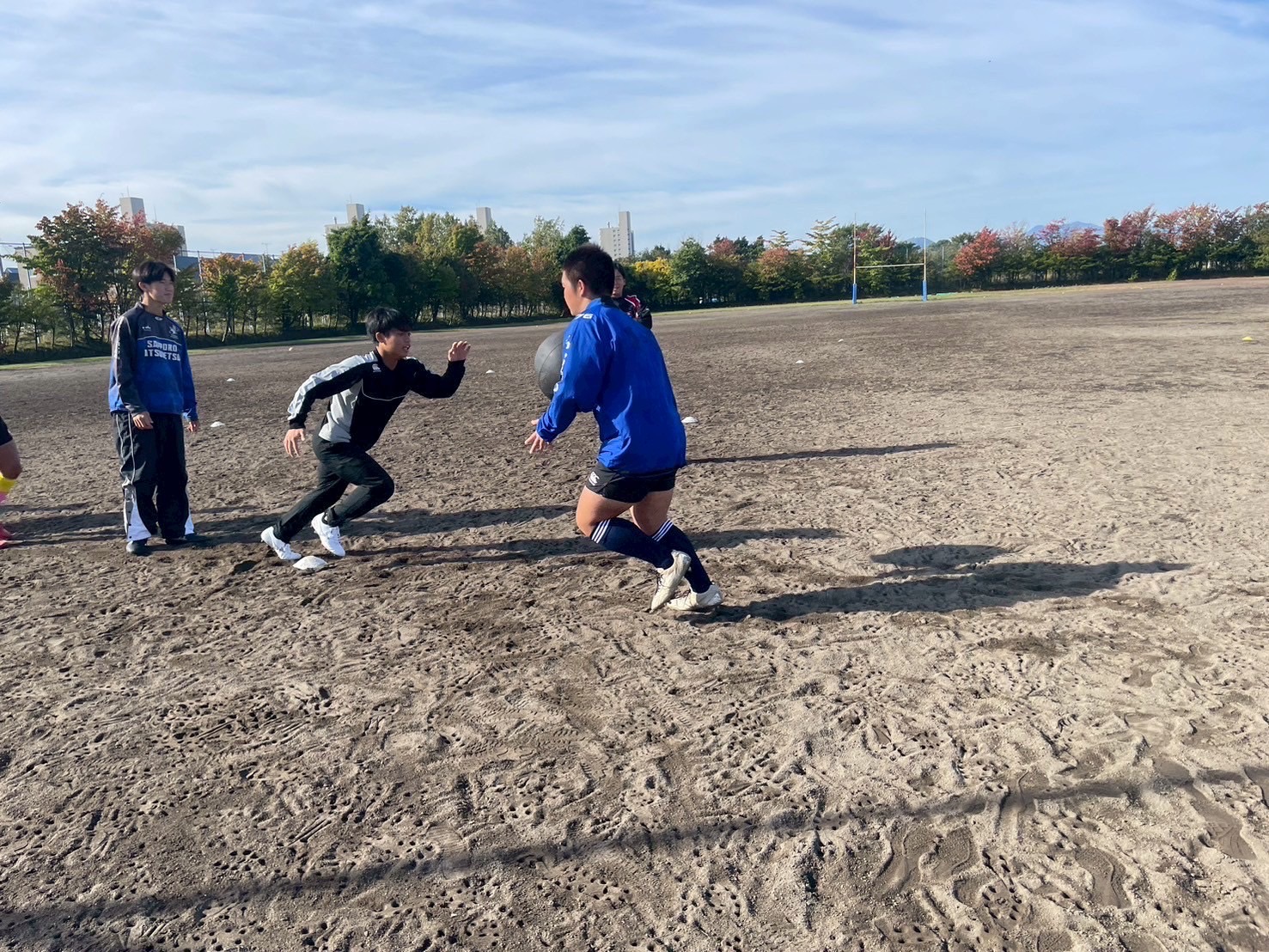 次に、ディフェンスアップの確認をしてから、3フェイズ連続アタックを練習をコンタクトレベルを変えて行いました。ディフェンスはトイメンを見てスペースを作らないように立つこととディフェンスラインを合わせること、アタックはパスを出す前にコミニュケーションを取ることなどを意識して練習に取り組みましょう。