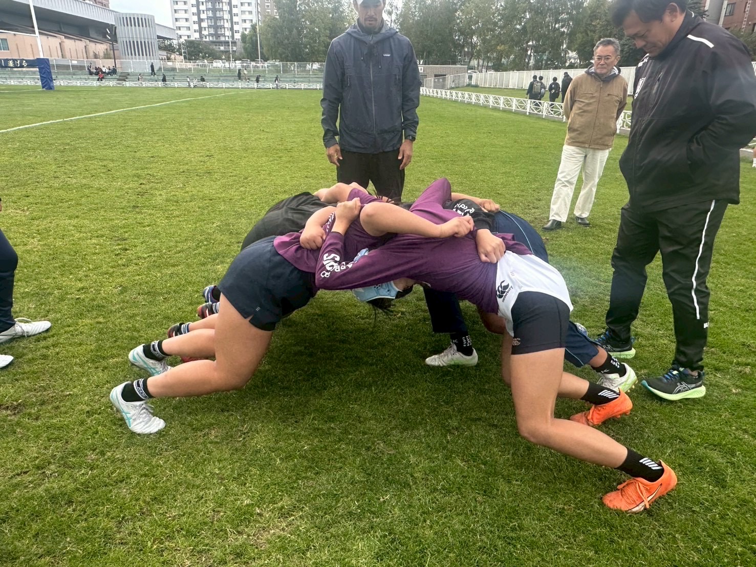 次にスクラム練習を行いました。スクラムで押されないように低い姿勢や膝をためることを意識しましょう。フッキングは膝下だけで動かすイメージで行いましょう。