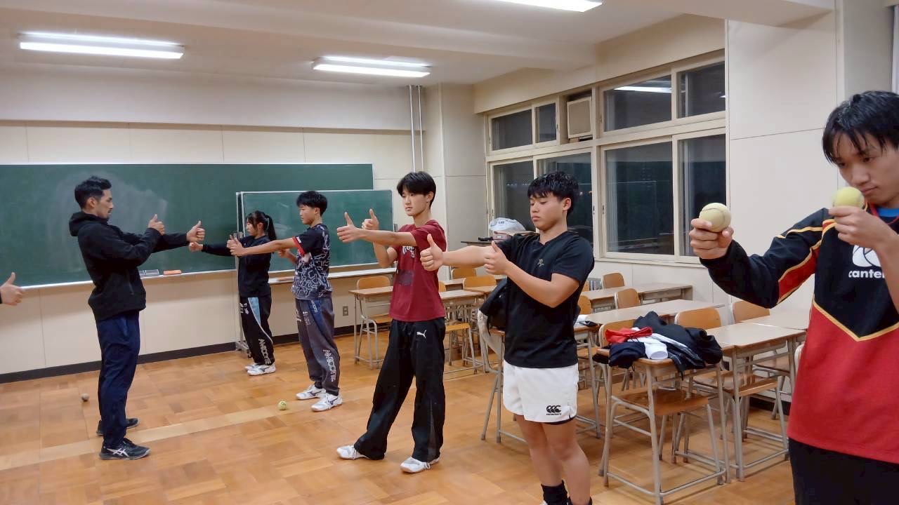 始めに鈴木大地さんに教えていただいたノーミングアップを行いました。難しいトレーニングも正解するなど目のトレーニングの成果が見られました。ボールを使ったトレーニングでは最初ボールを落とす様子が多く見られましたが最終的にはミスが少なくなっていました。今後も継続して行い、実際の練習に繋げましょう。