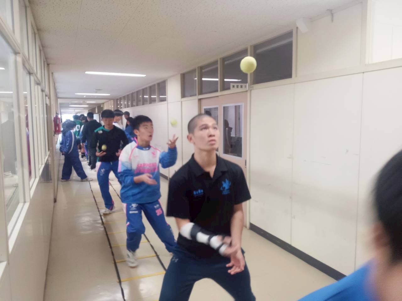 始めにラダーを行いました。足の細かい動作を意識して素早く動かせるように努めましょう。また、同時に行う動作のボール上げはボールをリズムに合わなくても速く上げてしっかりキャッチできるようにしましょう。