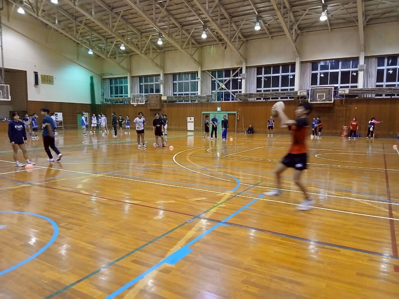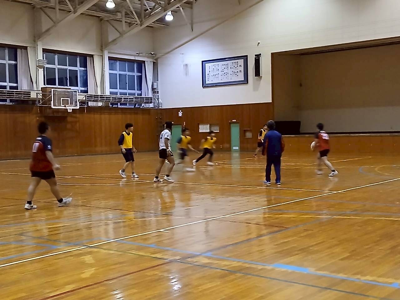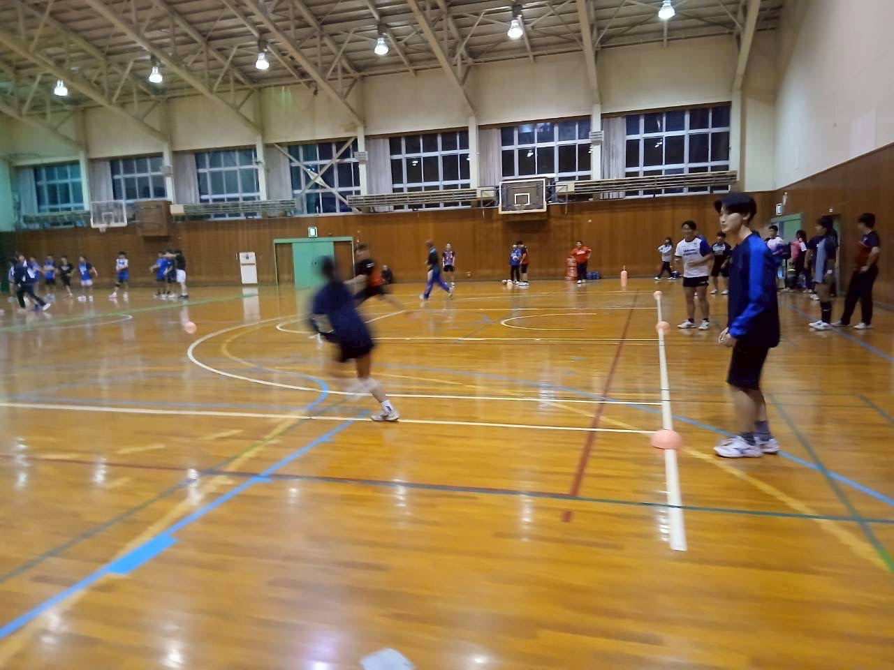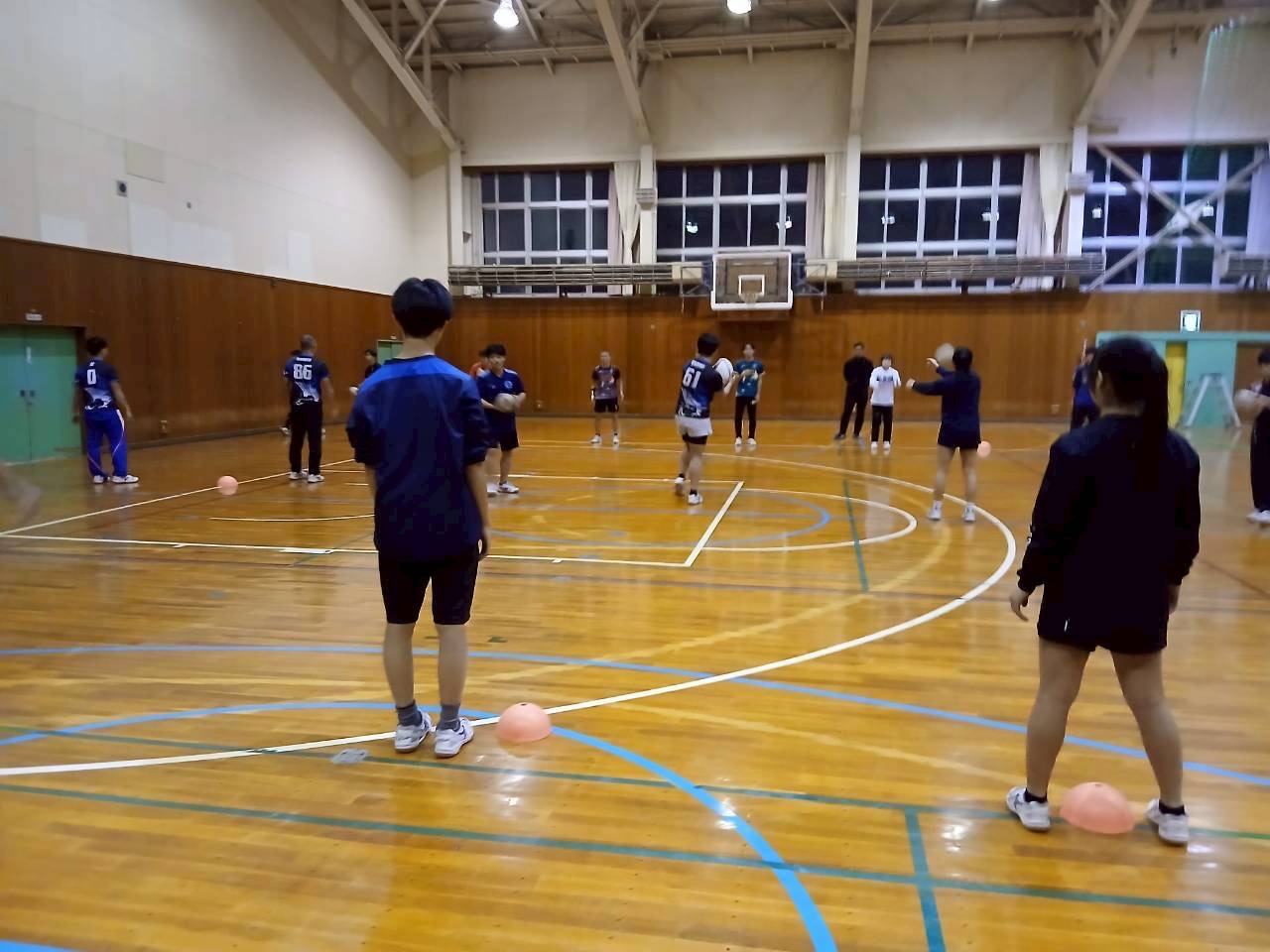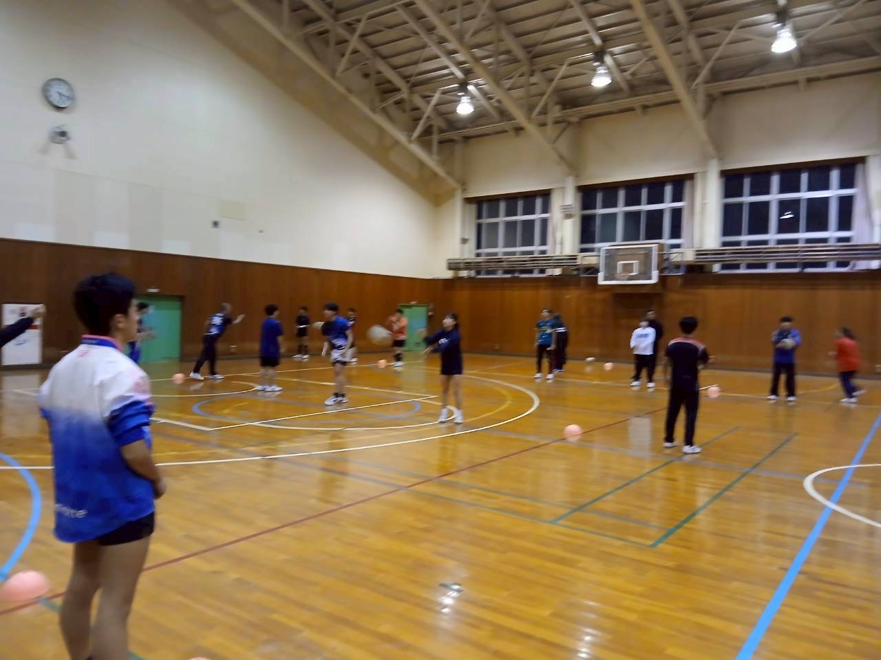次に3人1組になり、スクリューパスの練習で、片手でボールを投げる練習を行いました。普段あまり行わない動きのためかボールを落とすミスがありました。今後の練習ではミスを減らしましょう。