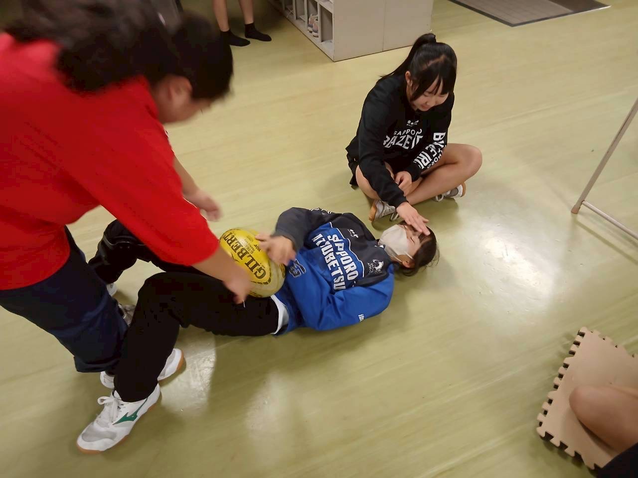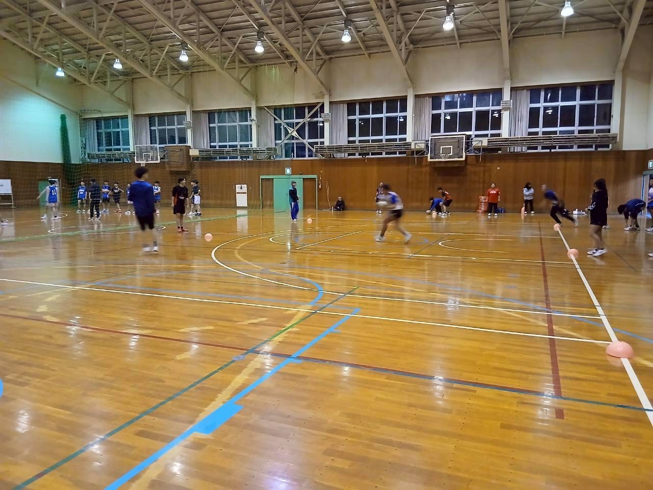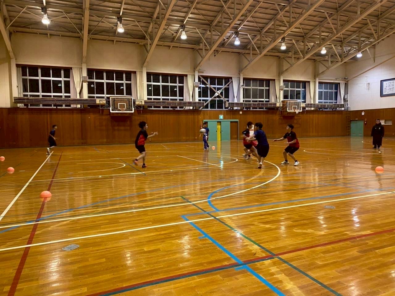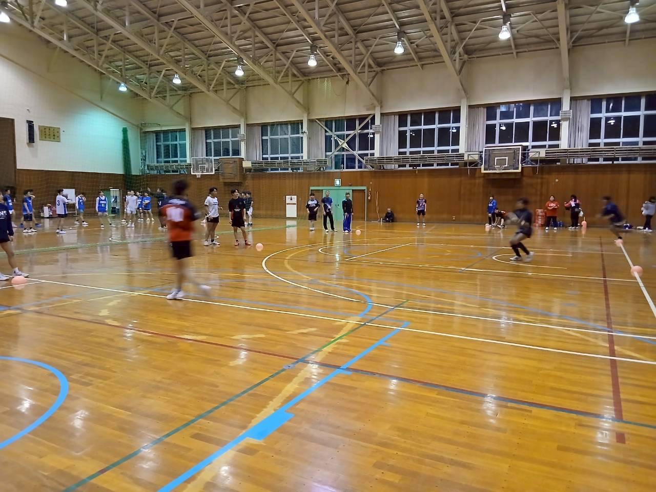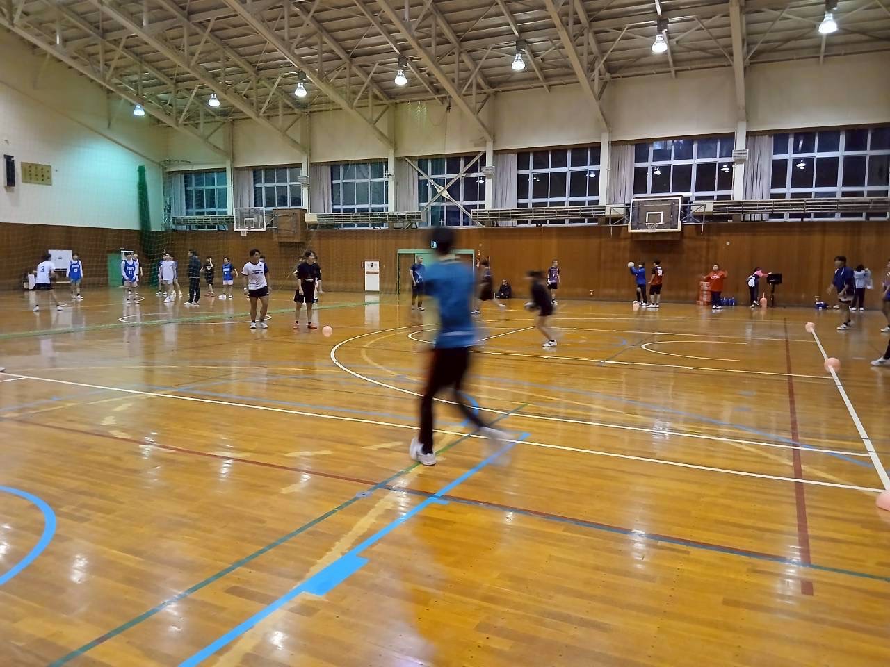 次に3人1組になり、スクリューパスの練習で、片手でボールを投げる練習を行いました。普段あまり行わない動きのためかボールを落とすミスがありました。今後の練習ではミスを減らしましょう。
