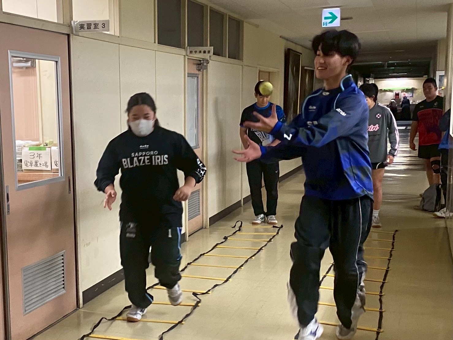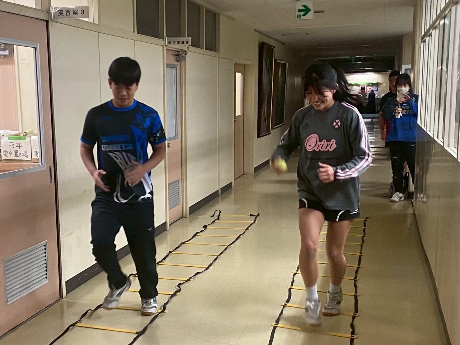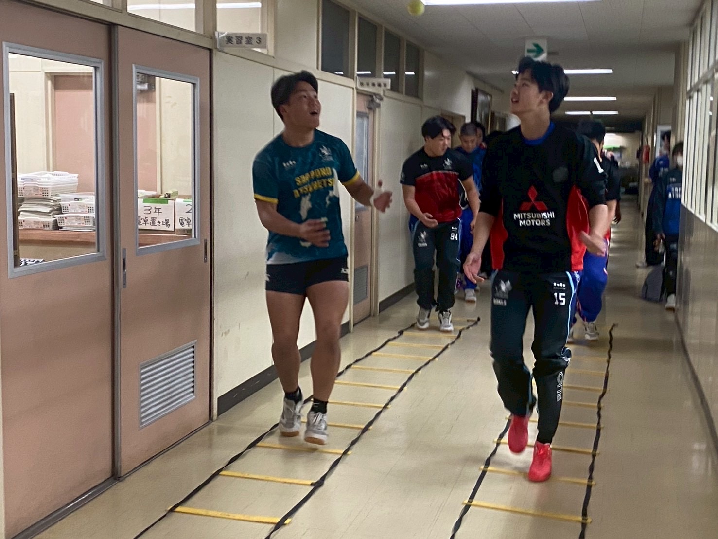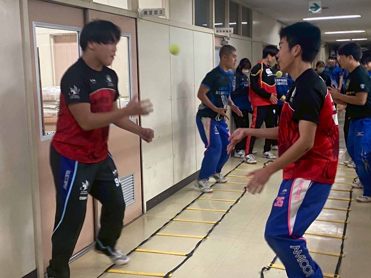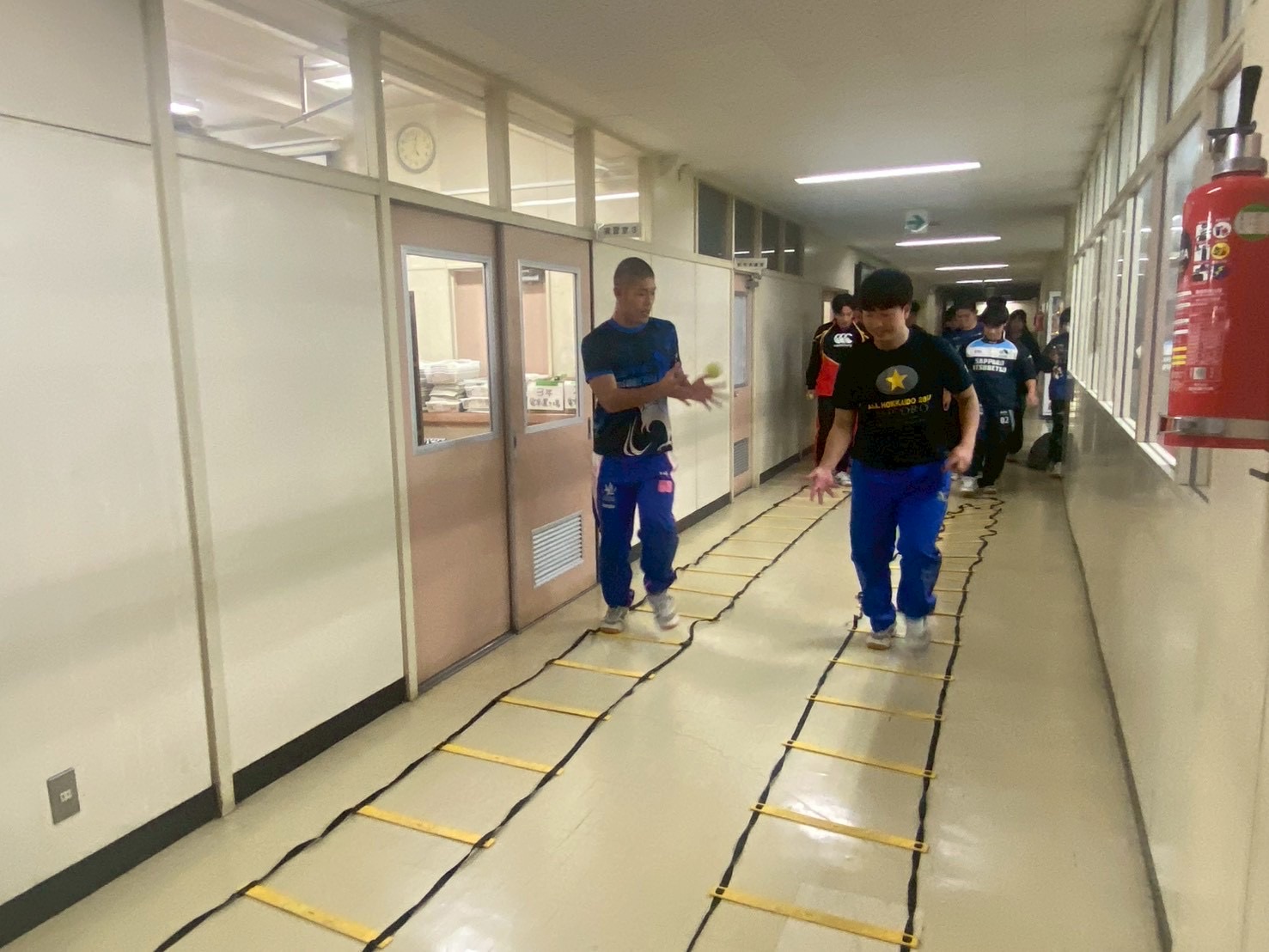 その後、廊下に移動し、ラダーを踏みながらパスを行う二重課題に取り組みました。このメニューは、足元とボールの両方に意識を向けつつコミュニケーションも必要となる非常に頭を使う練習でしたが、ミスも楽しみながら元気に取り組む姿が見られました!