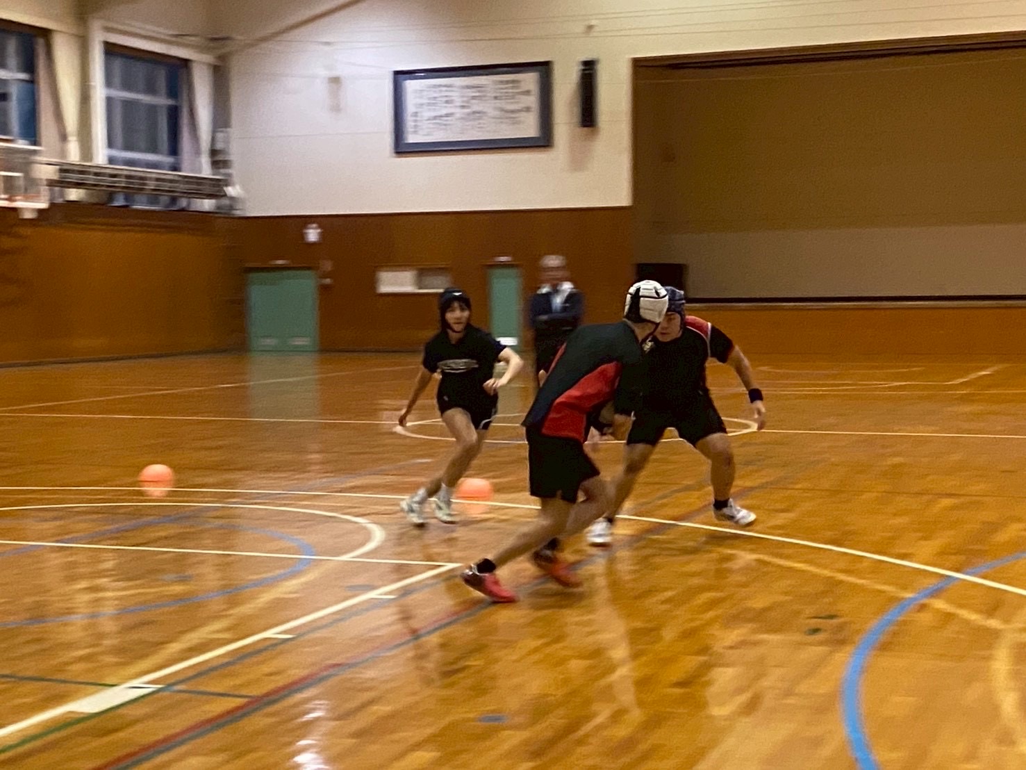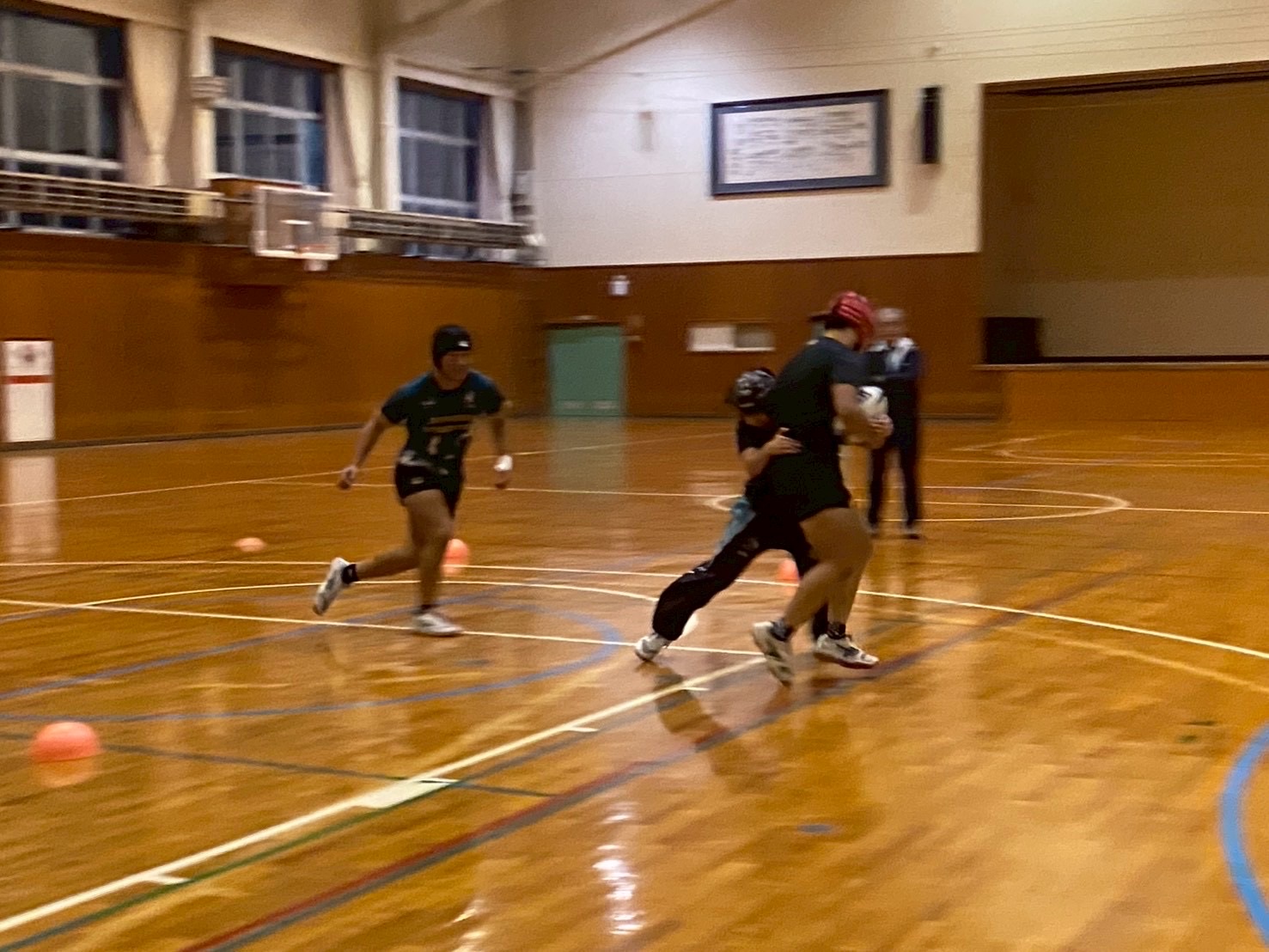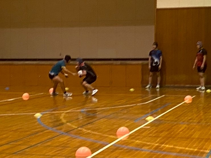 次にアタック1対ディフェンス2で連携を取りながら肩を当ててのディフェンス練習を行いました。佐々木先生からは「どちらの肩でタックルに入るか明確にすること」「待ちすぎず、前でタックルすること」を意識するようアドバイスをいただきました。教わった点を忘れず、練習に活かしていきましょう!