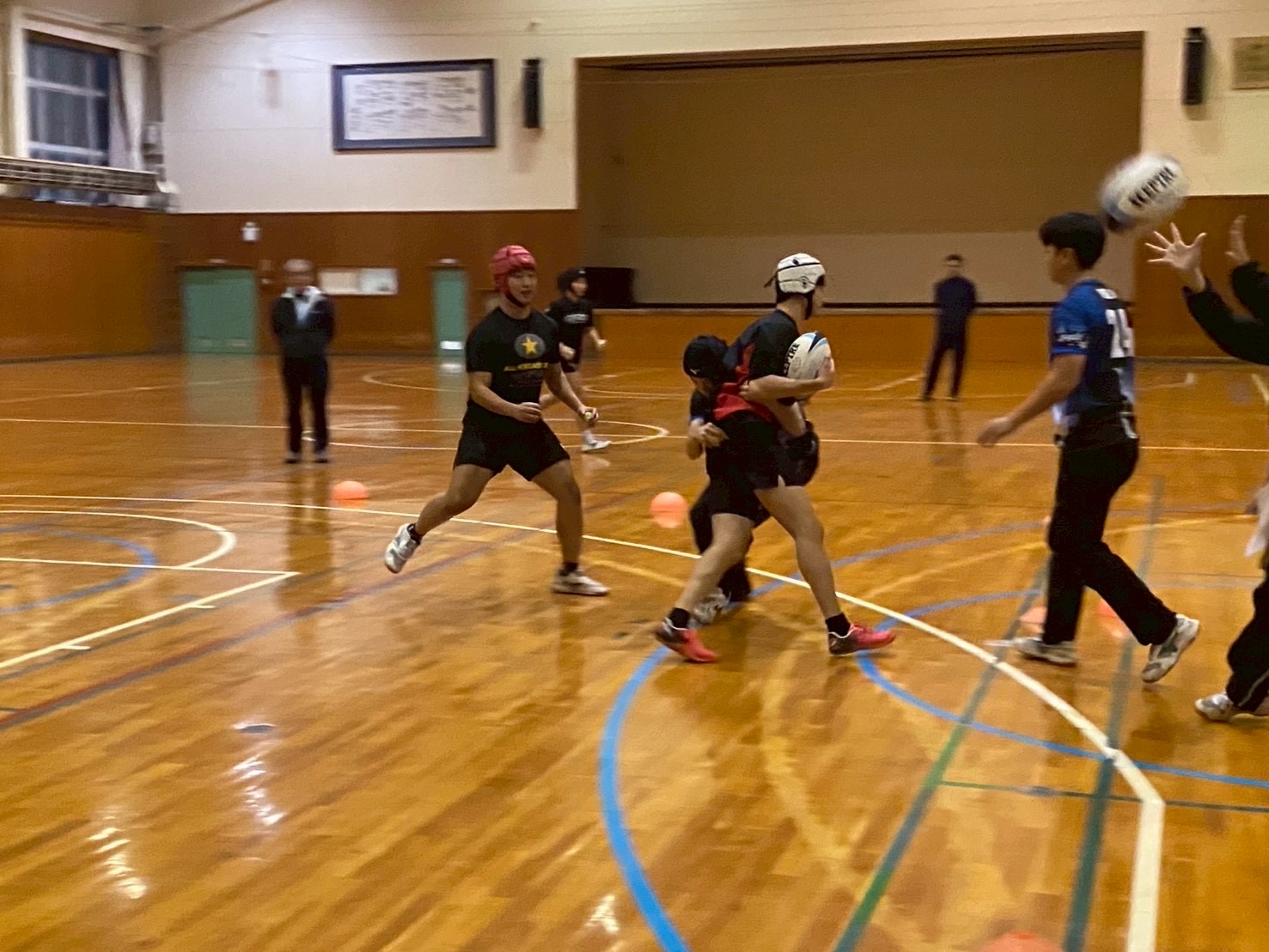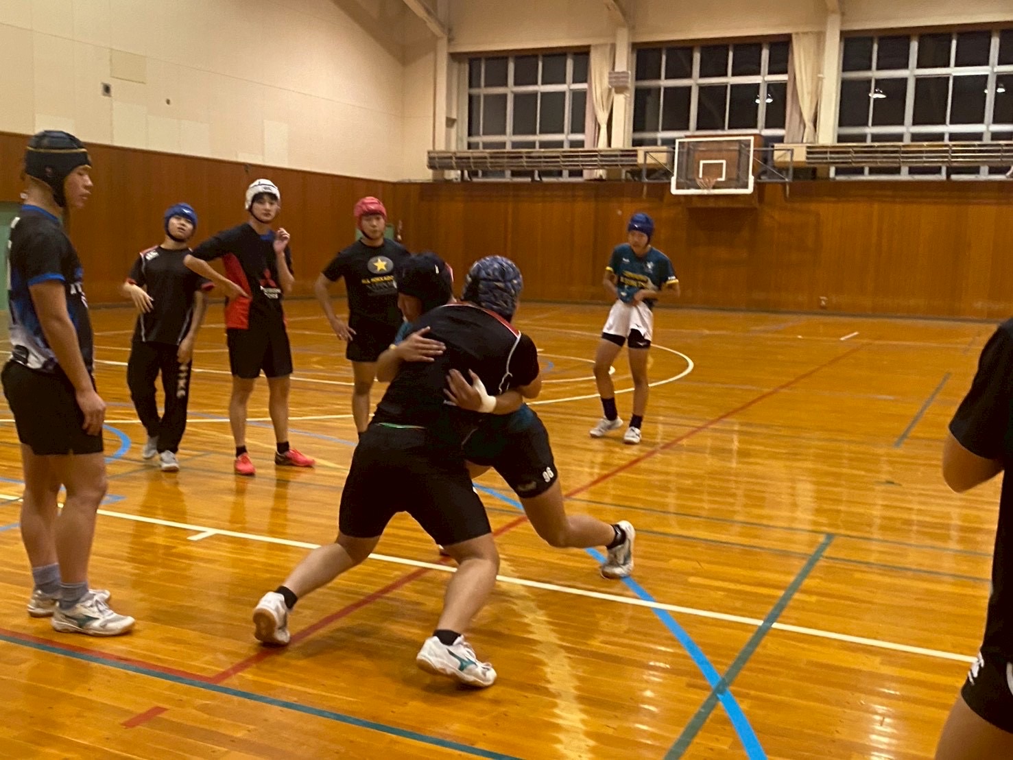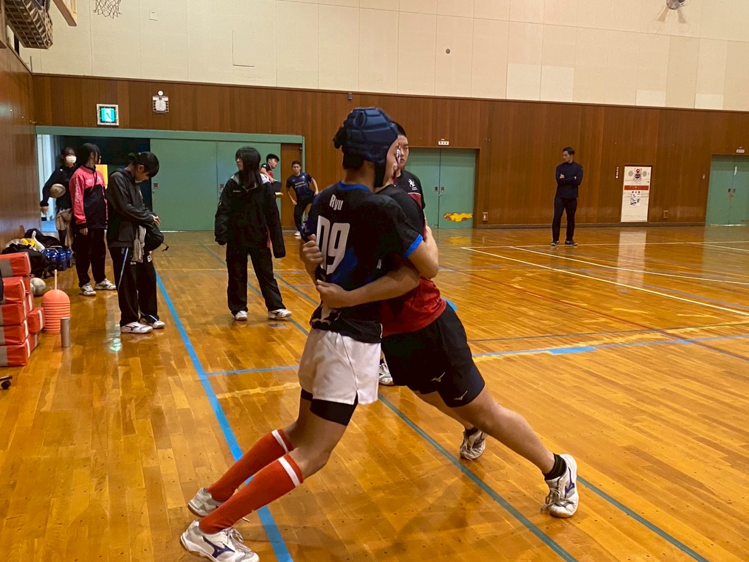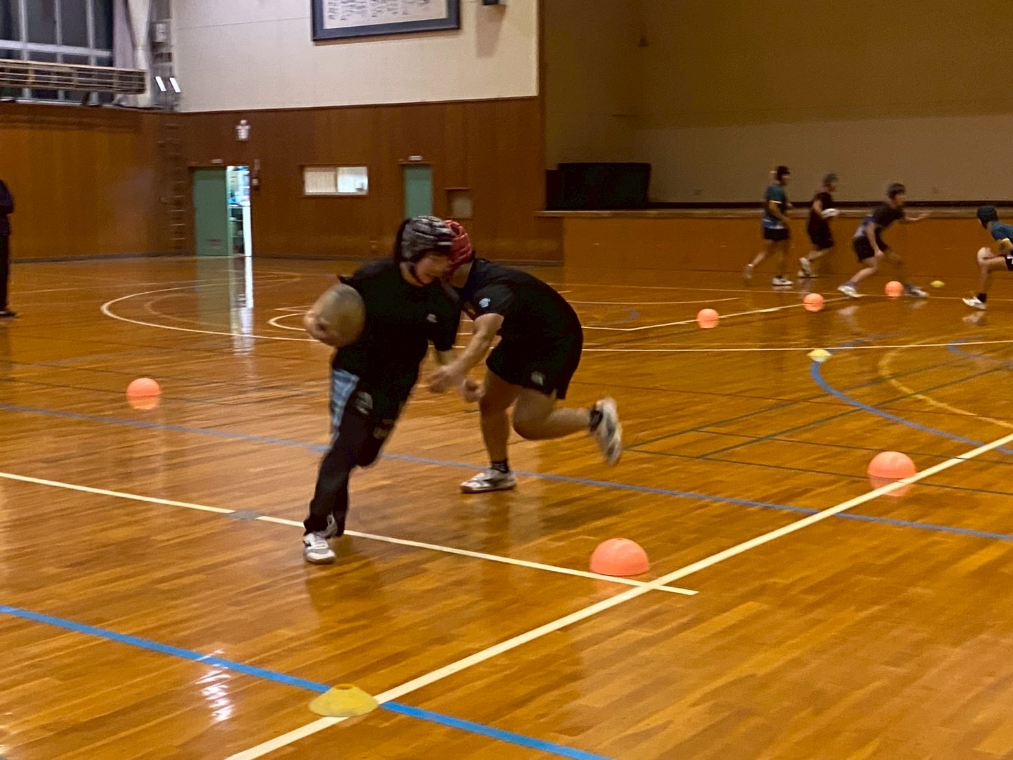 その後、1対1を行いました。このメニューではパドリング・肩の当て方・踏み込みなど多くのポイントを意識しながら取り組みました。タックルでは相手を引き寄せるイメージで力強く踏み込むことを意識していました。しっかりと全てのポイントを忘れずに取り組みましょう!
