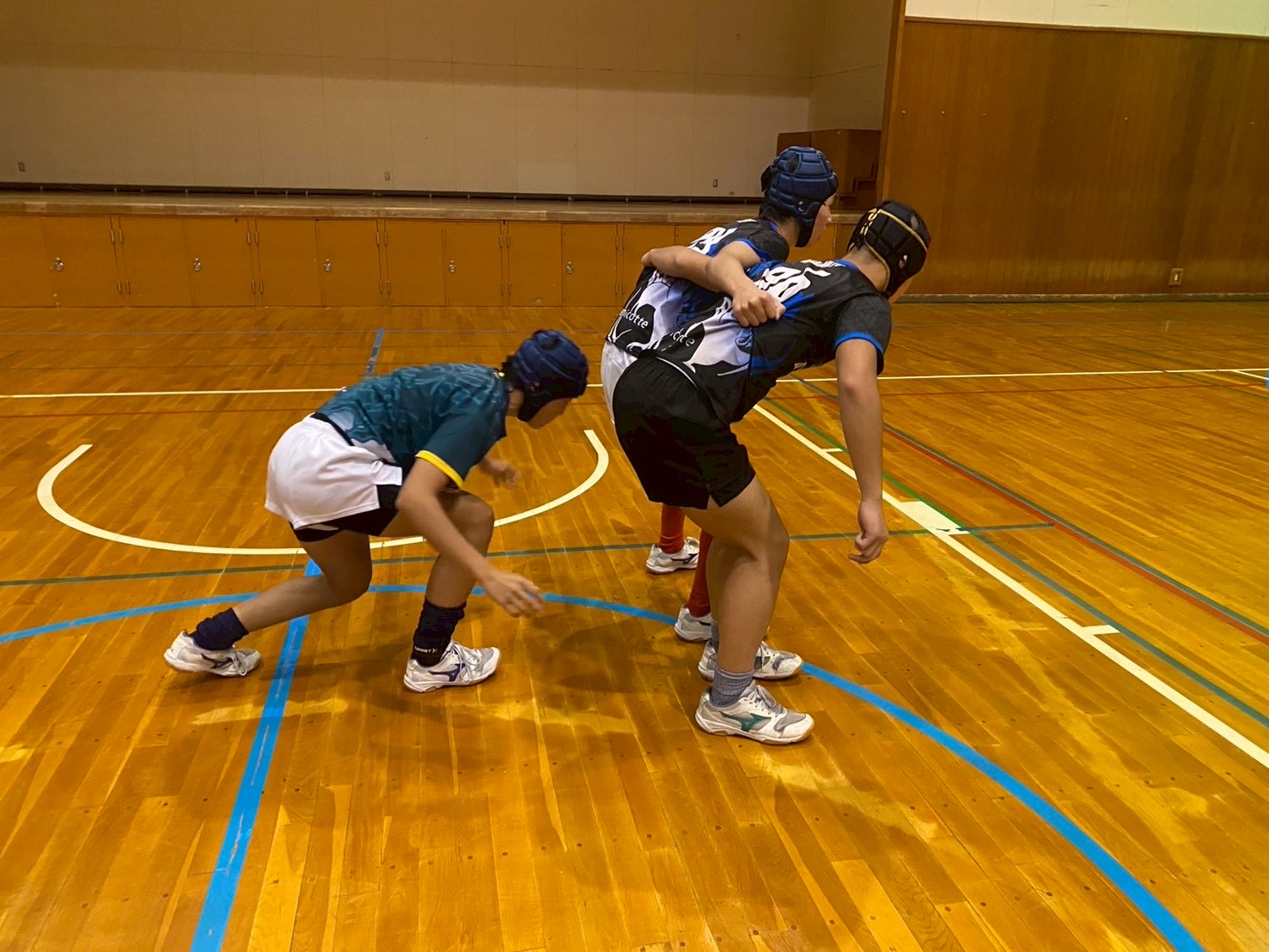 次に、常翔学園から教わったウォーミングアップを行いました。しっかりと体重をかけ、力強くコンタクトできるように意識して行いましょう。