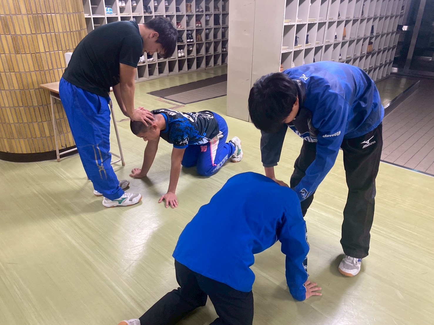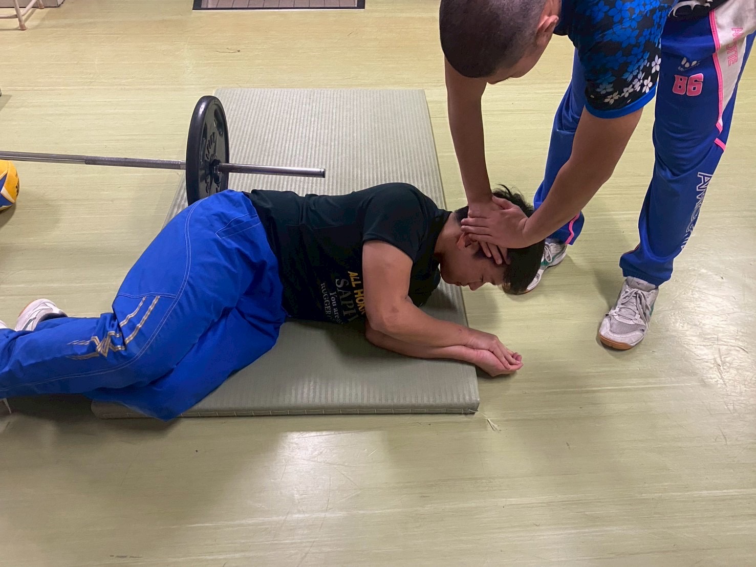 SCの後には首のトレーニングを行いました。しっかりと効果が出るよう、お互いに力加減を調節しながら丁寧に鍛えていました。