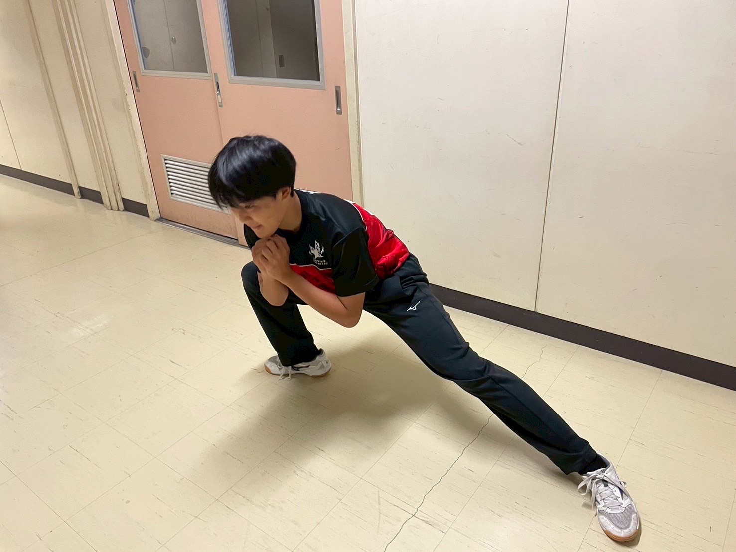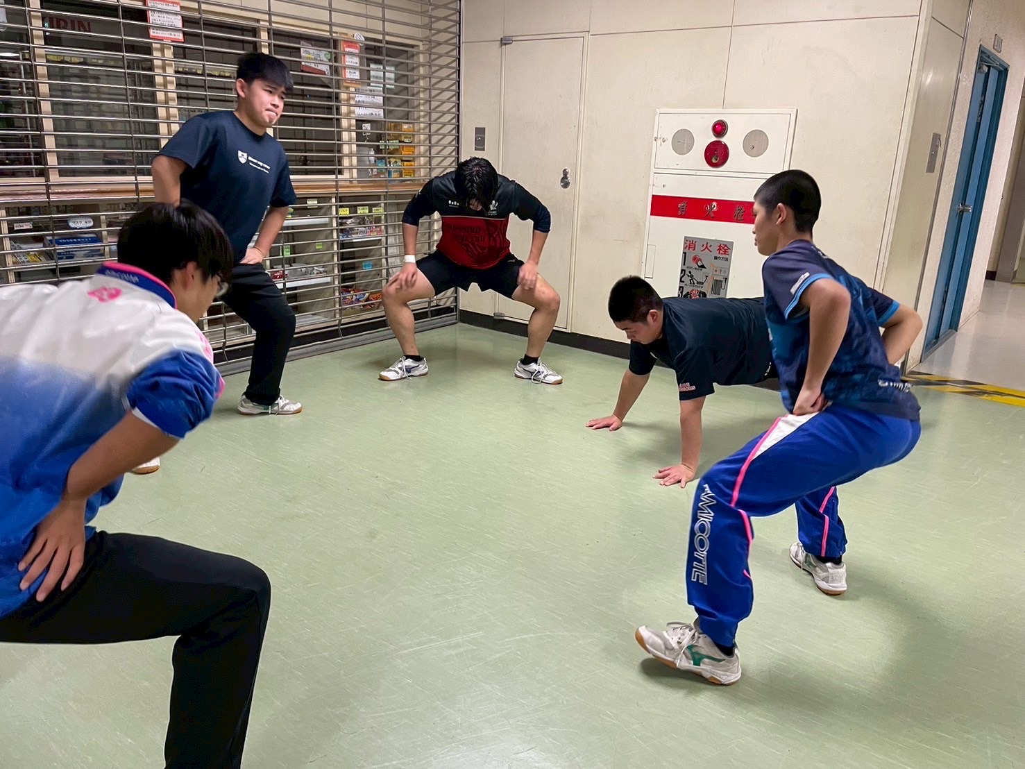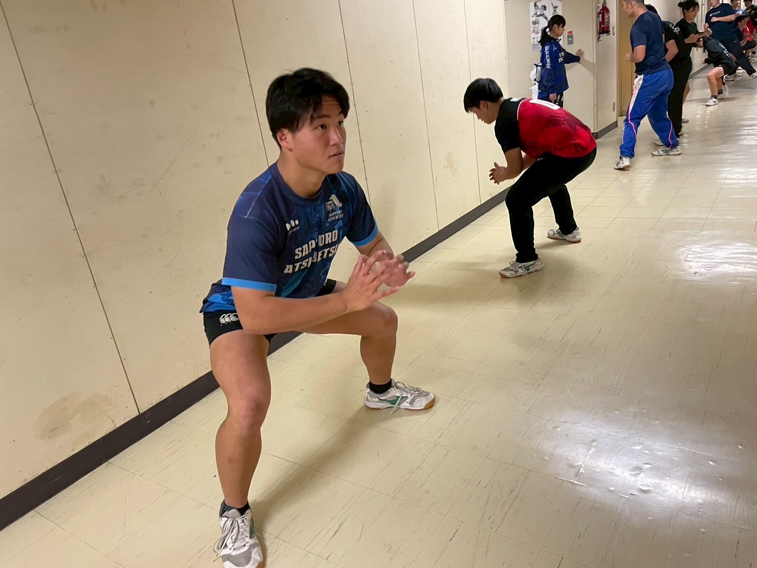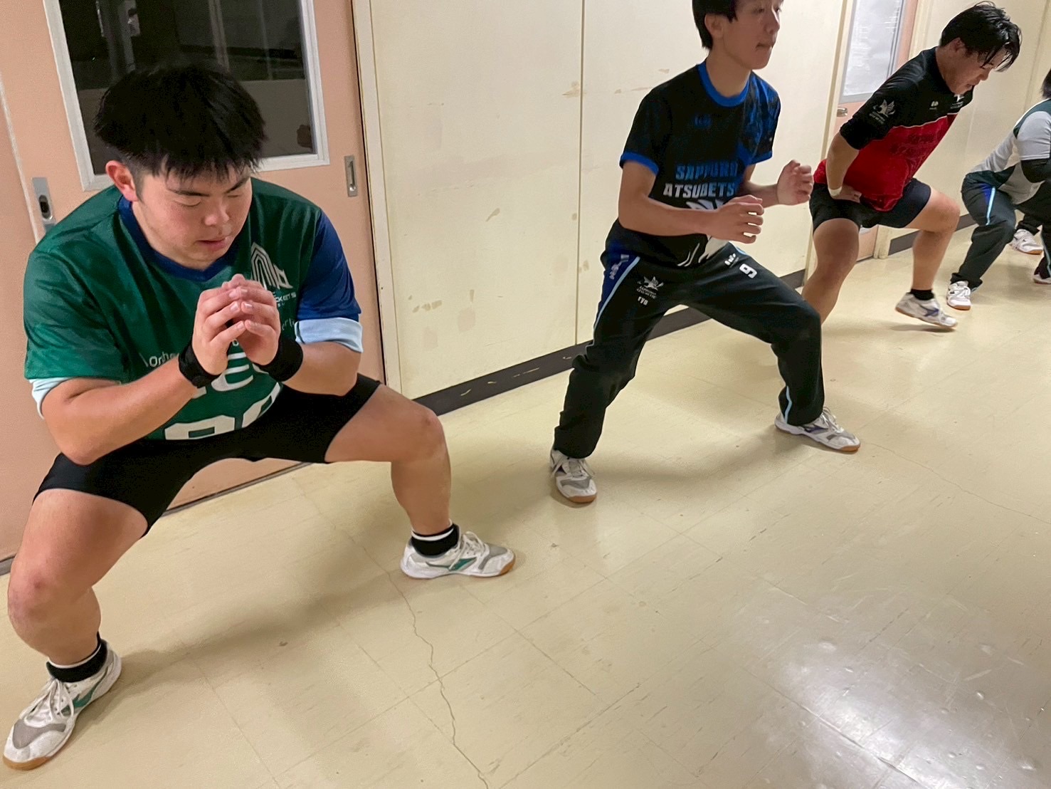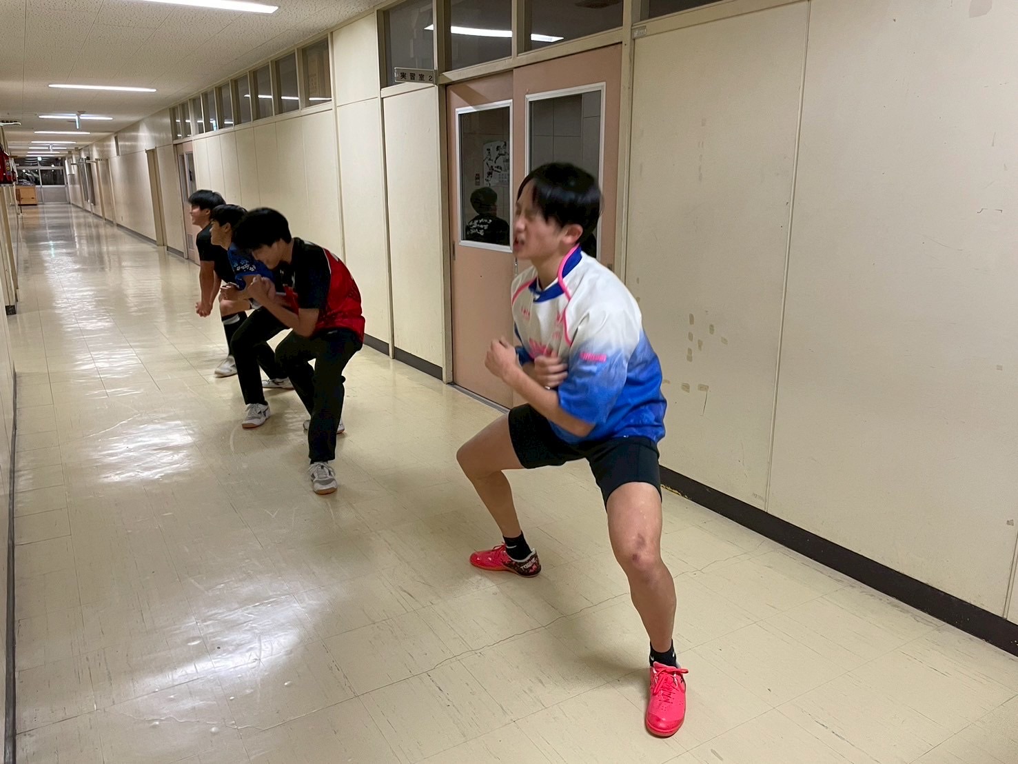 その後、室内に移動し、廊下で自重トレーニングを行いました。一つひとつのトレーニングを丁寧に行い、どこに効いているのかを考えながら練習に取り組みましょう。始めはそれほどキツくないと思っていた人もいたかもしれませんが、後になるにつれて、効いてきているようでした。キツいメニューの中でも、大きな声で互いを褒め合い最後まで頑張っていました。