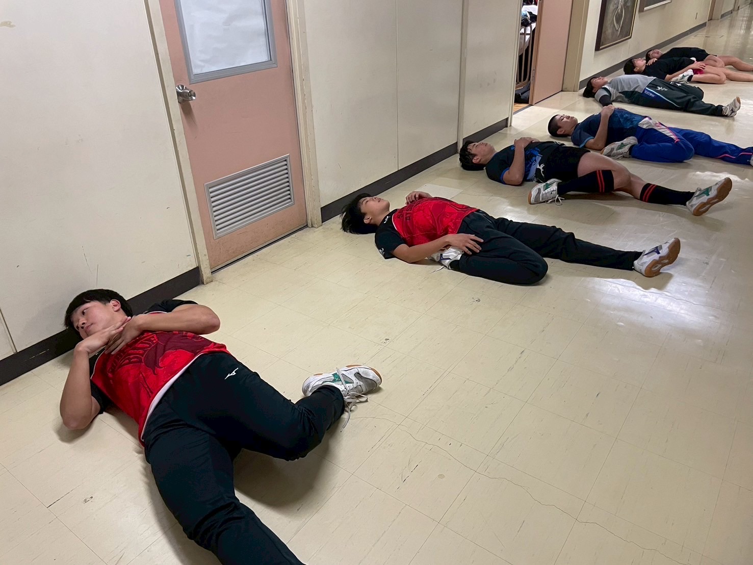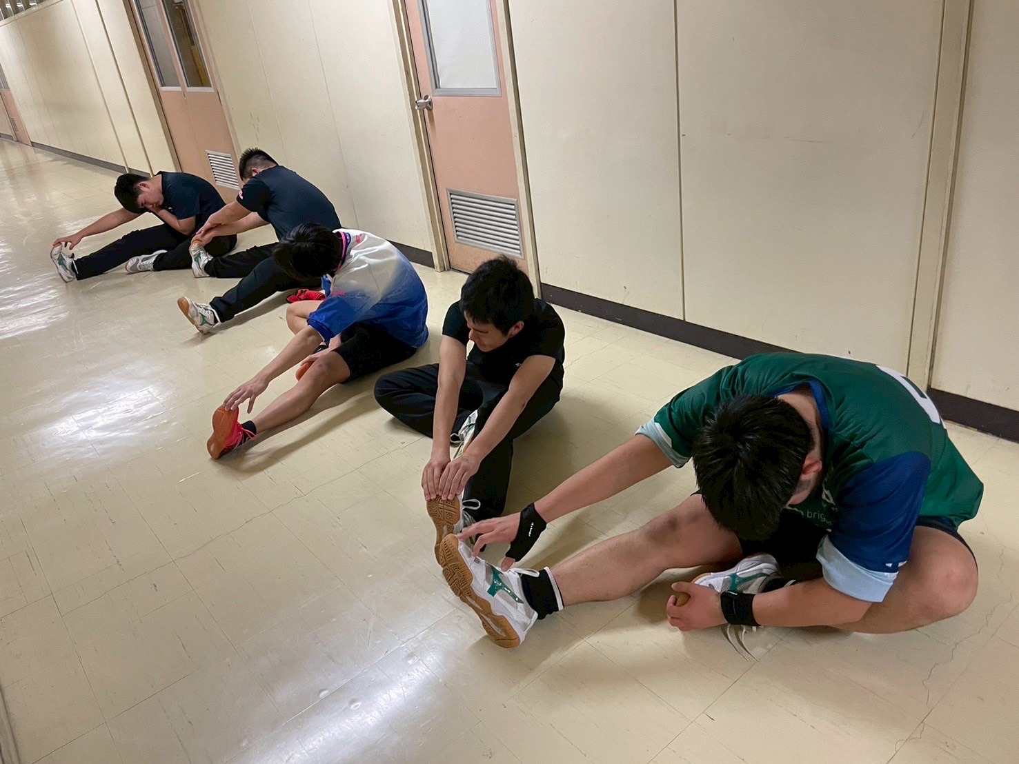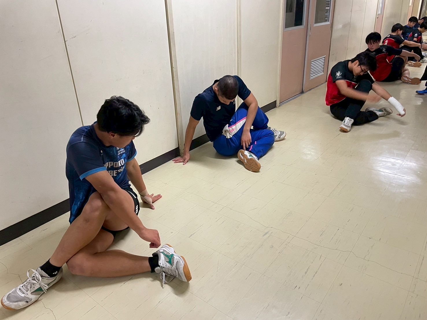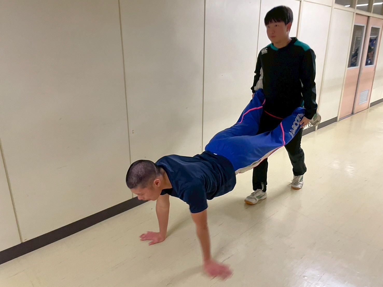 その後、室内に移動し、廊下で自重トレーニングを行いました。一つひとつのトレーニングを丁寧に行い、どこに効いているのかを考えながら練習に取り組みましょう。始めはそれほどキツくないと思っていた人もいたかもしれませんが、後になるにつれて、効いてきているようでした。キツいメニューの中でも、大きな声で互いを褒め合い最後まで頑張っていました。