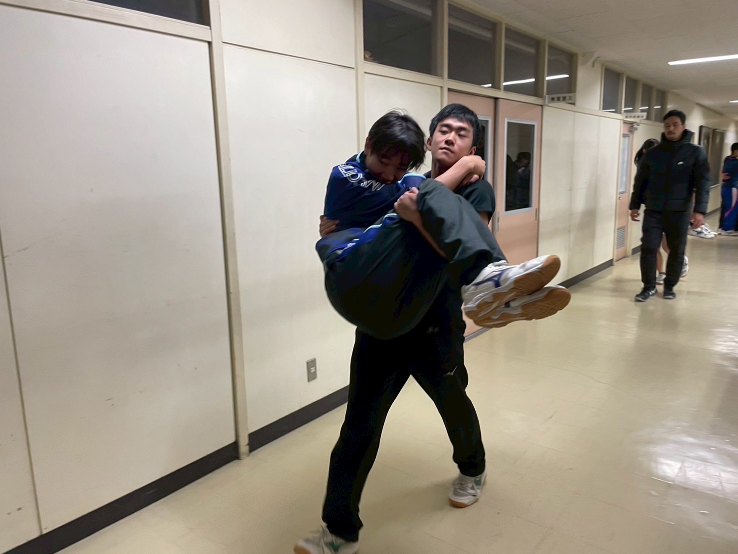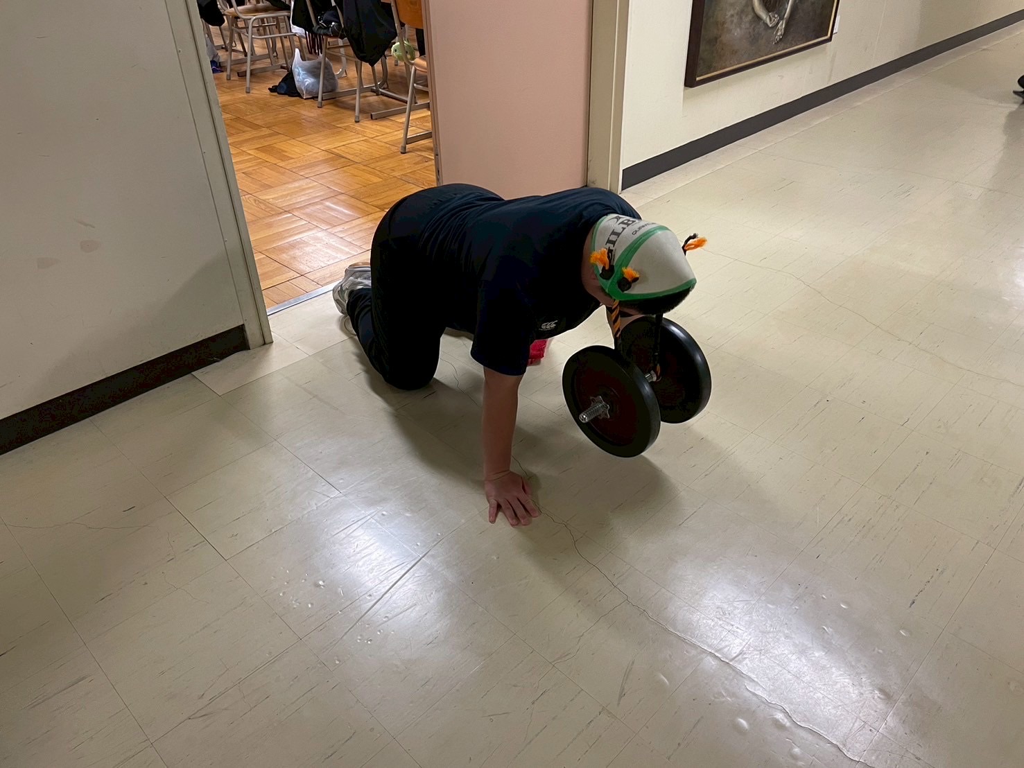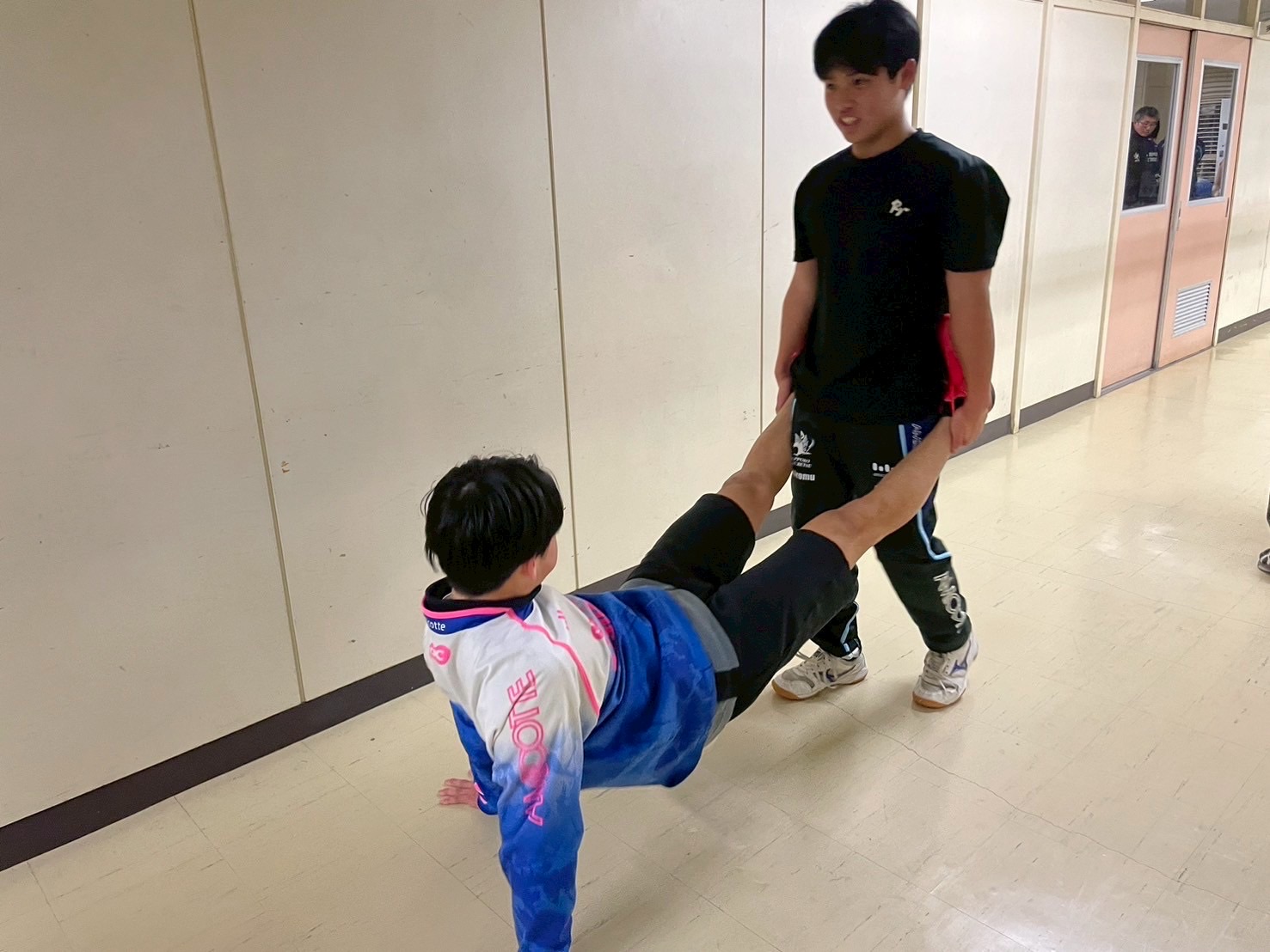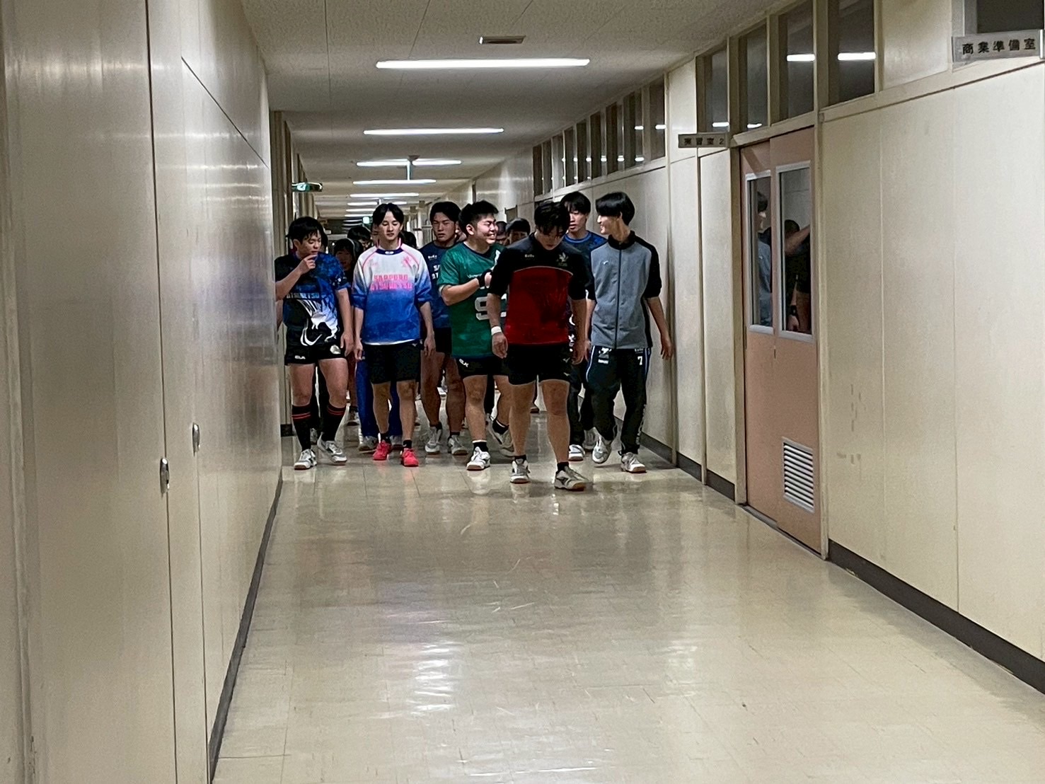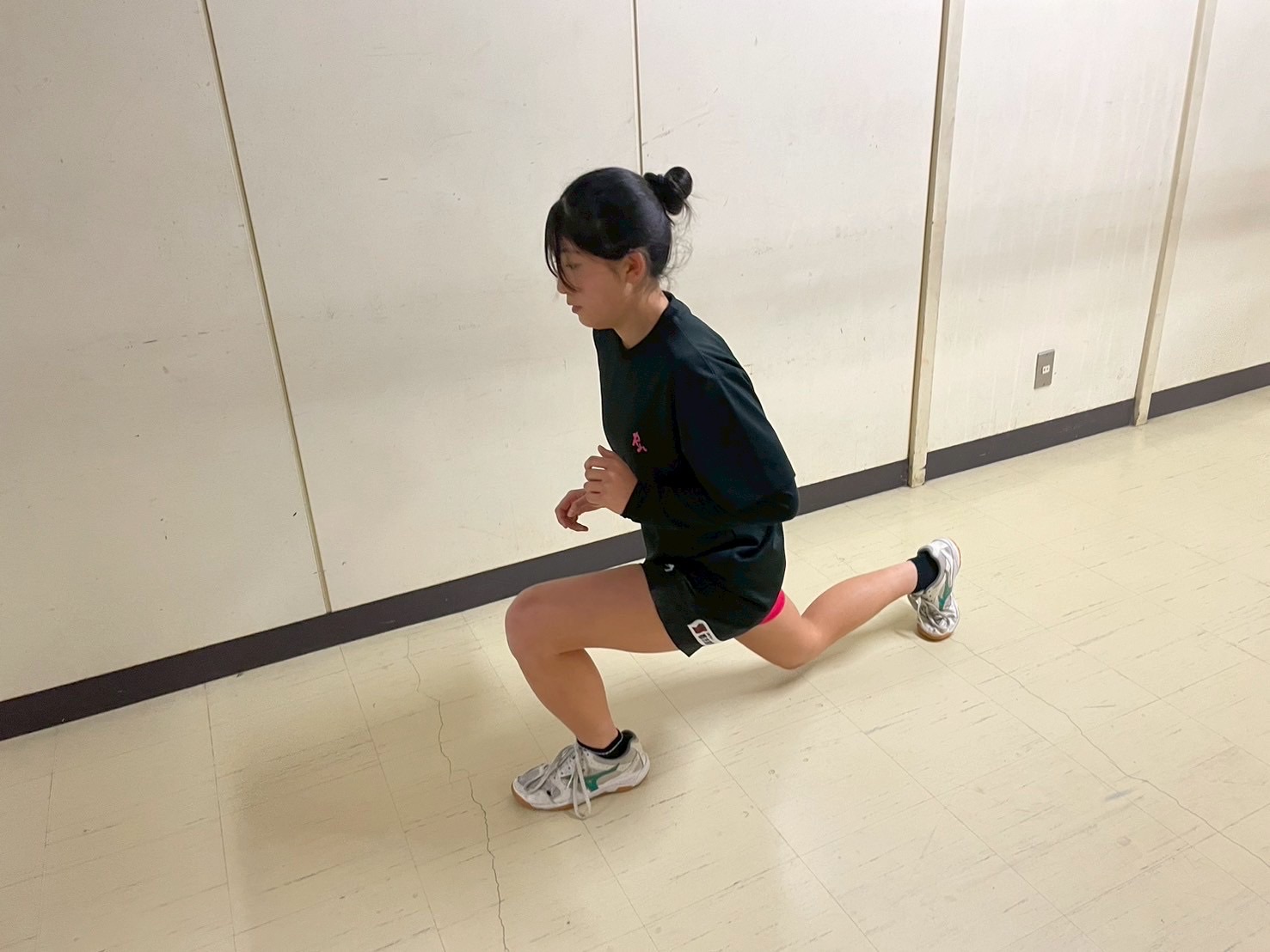 その後、室内に移動し、廊下で自重トレーニングを行いました。一つひとつのトレーニングを丁寧に行い、どこに効いているのかを考えながら練習に取り組みましょう。始めはそれほどキツくないと思っていた人もいたかもしれませんが、後になるにつれて、効いてきているようでした。キツいメニューの中でも、大きな声で互いを褒め合い最後まで頑張っていました。