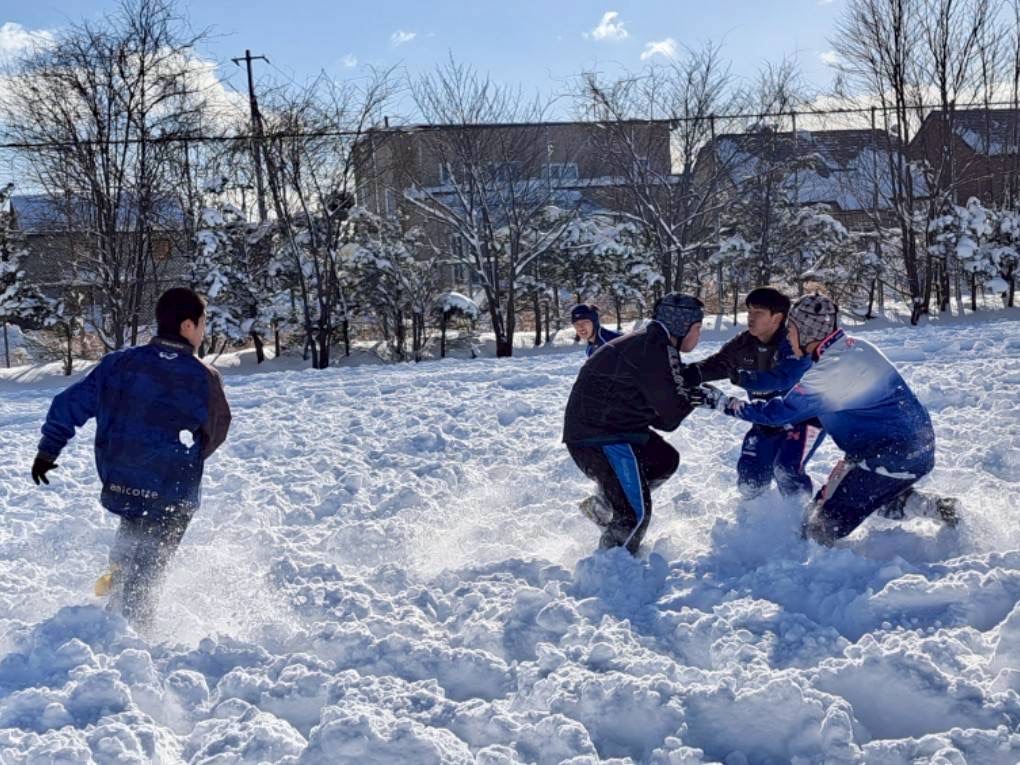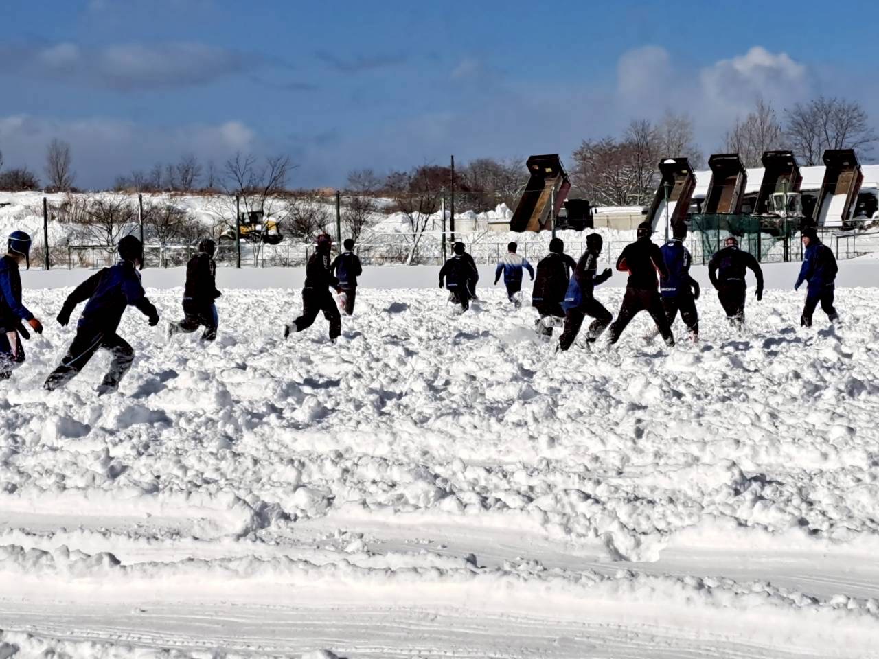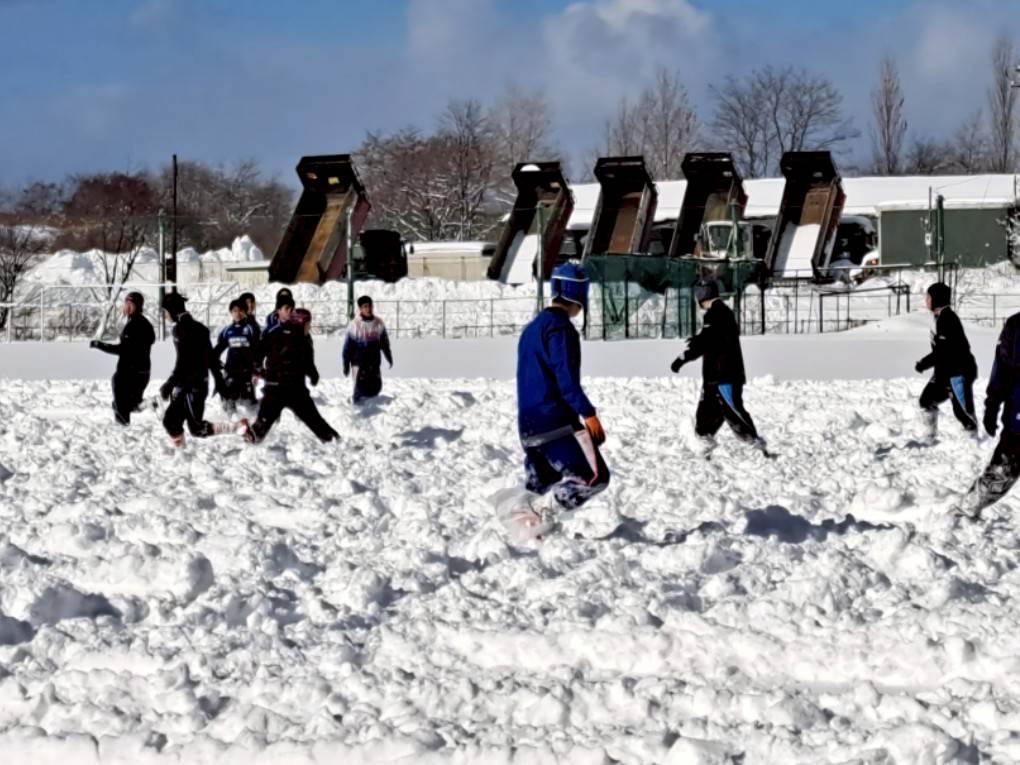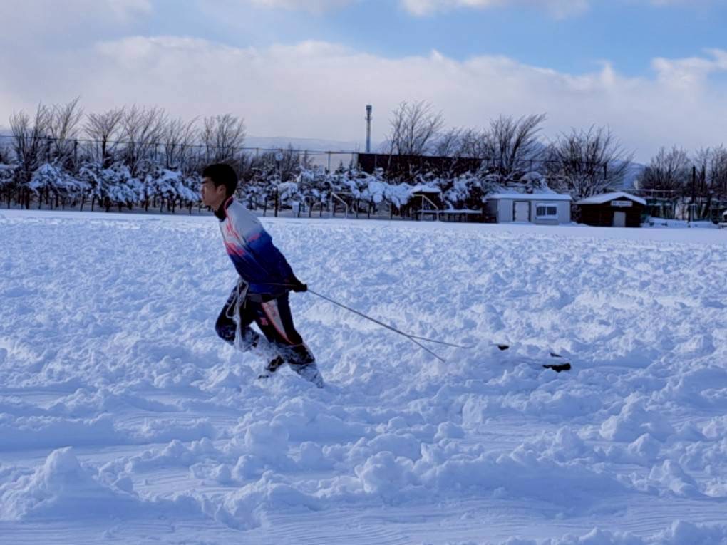 その後、グラウンドに移動し、タイヤ引きを行いました。昨日の大雪で膝まで雪が積もりました。1列に並び、グラウンドを整地しました。同時に足腰も鍛え上げましょう。