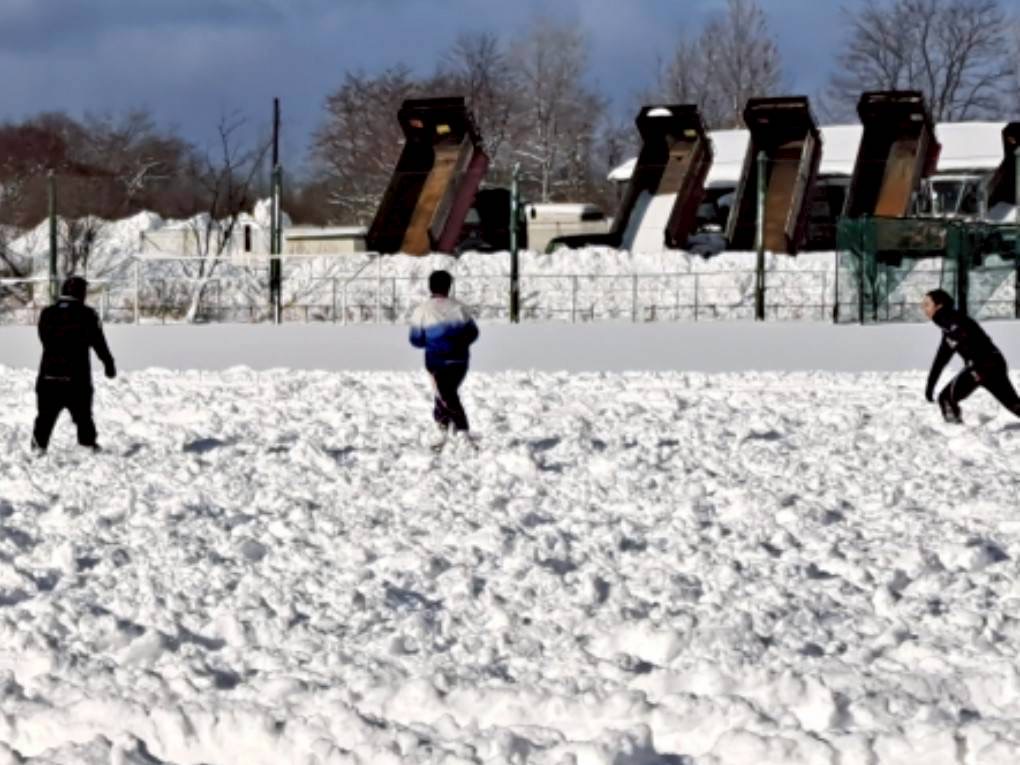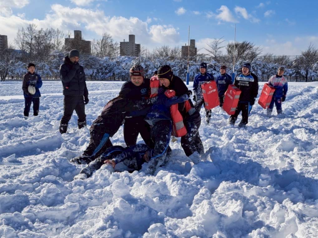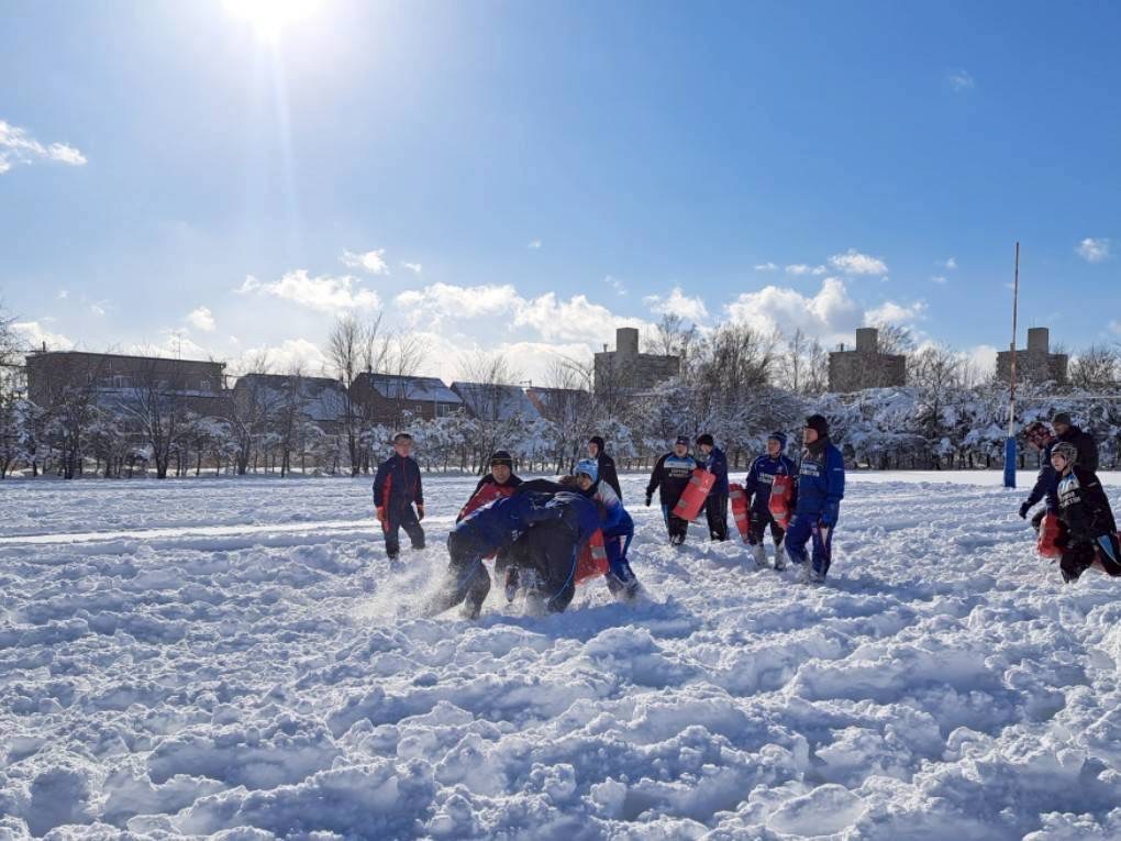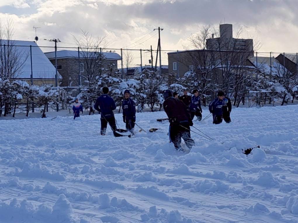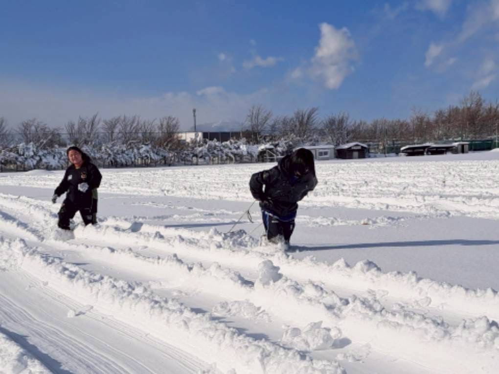 その後、グラウンドに移動し、タイヤ引きを行いました。昨日の大雪で膝まで雪が積もりました。1列に並び、グラウンドを整地しました。同時に足腰も鍛え上げましょう。