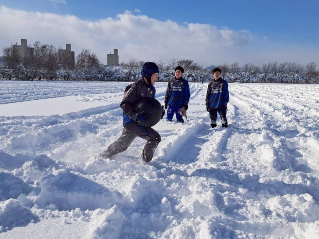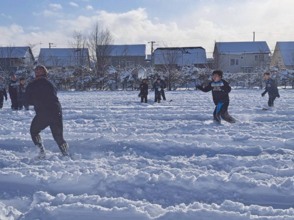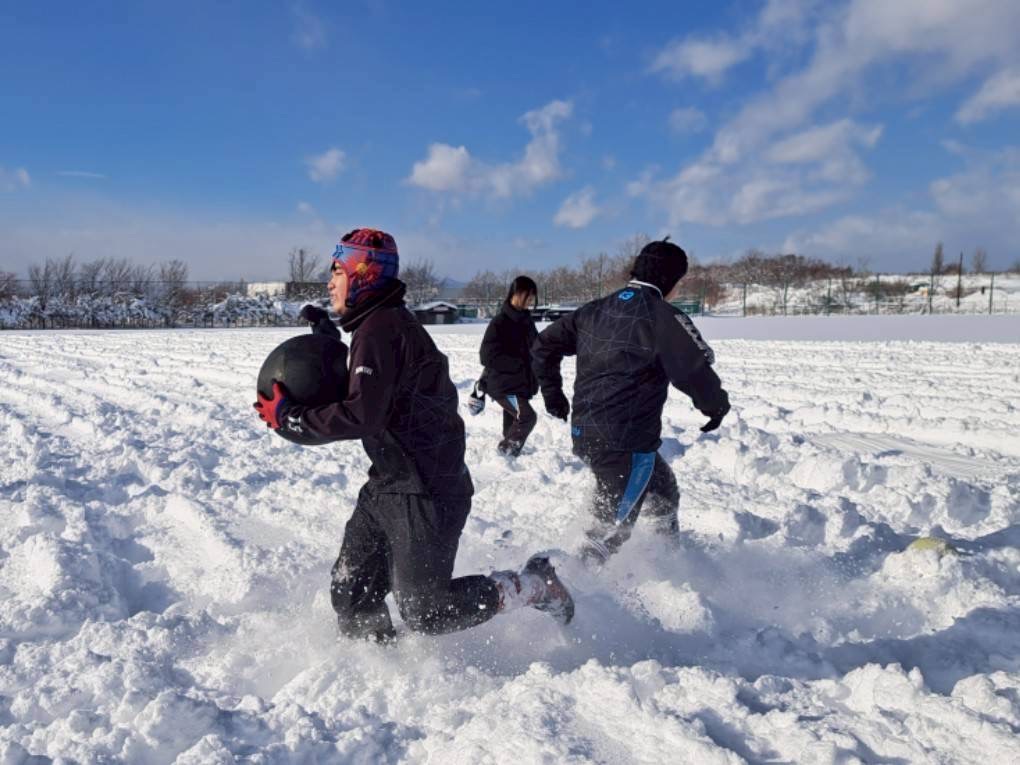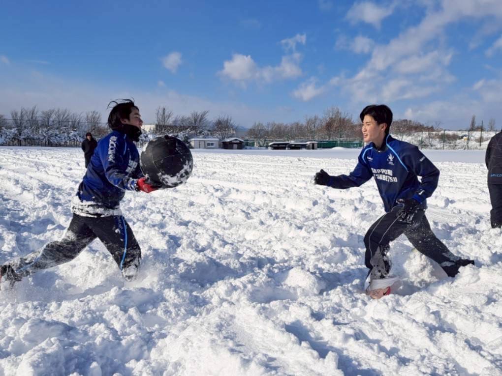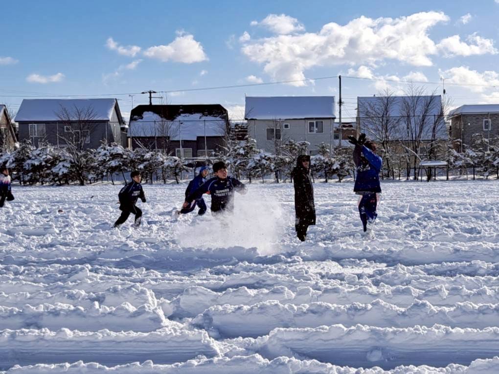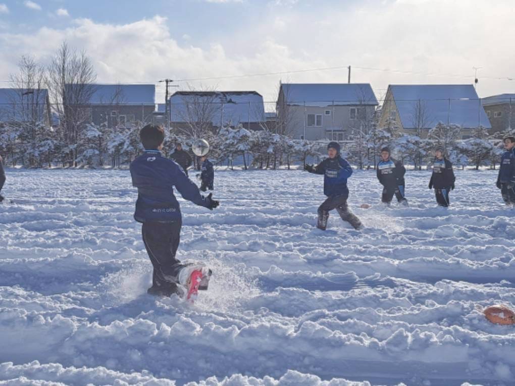 その後、3列パスを行いました。雪でボールが滑ることも頭に入れて、パスする方もキャッチする方も丁寧に行いましょう。